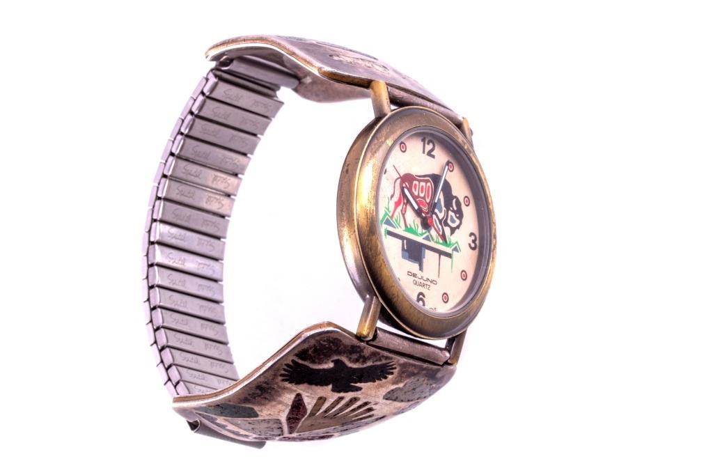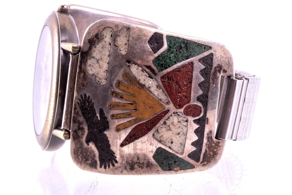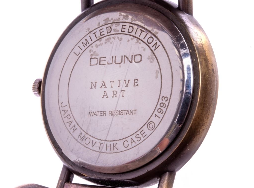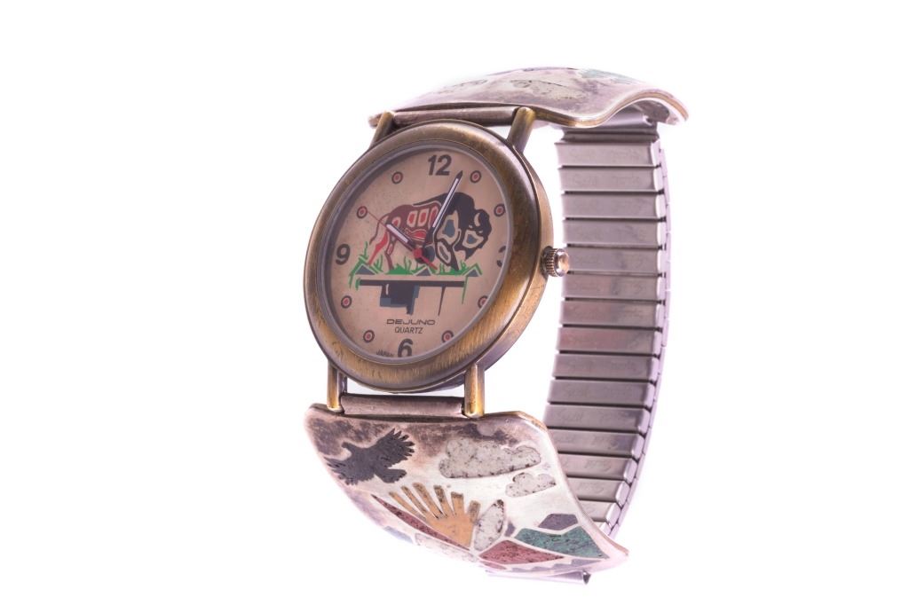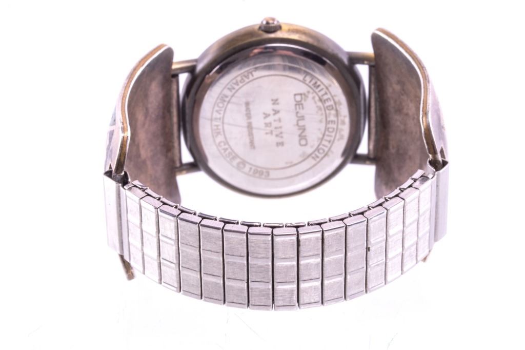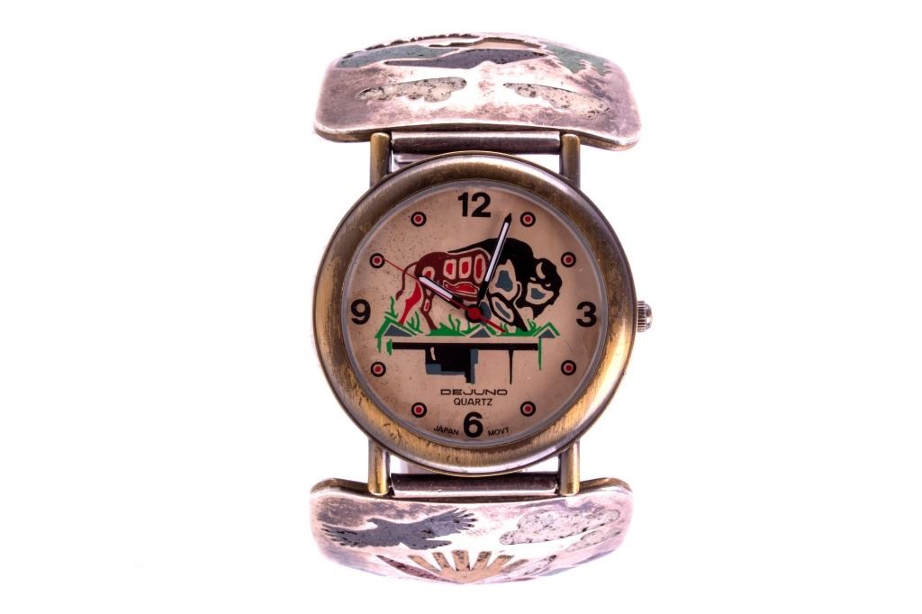 Featured in this lot is this sterling silver Dejuno quartz watch from Navajo artist Randy Jones. The watch shoes a sterling silver design with brass colored decoration of plains, buffalo, and teepee's with a watch face including a decoration of buffalo. The condition of this watch is good, with no obvious signs of damage. The measurements of this watch are 2 3/8" x 2 3/8" x 1 3/8".