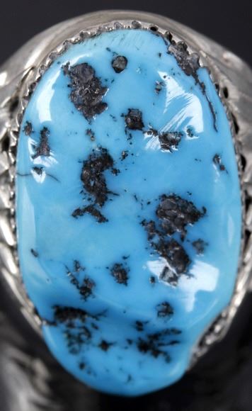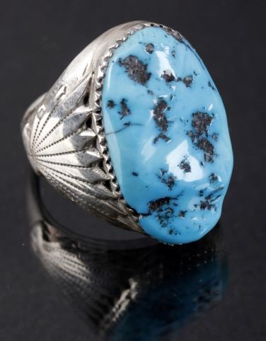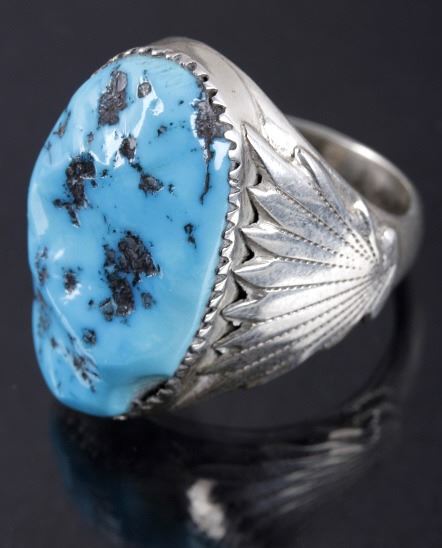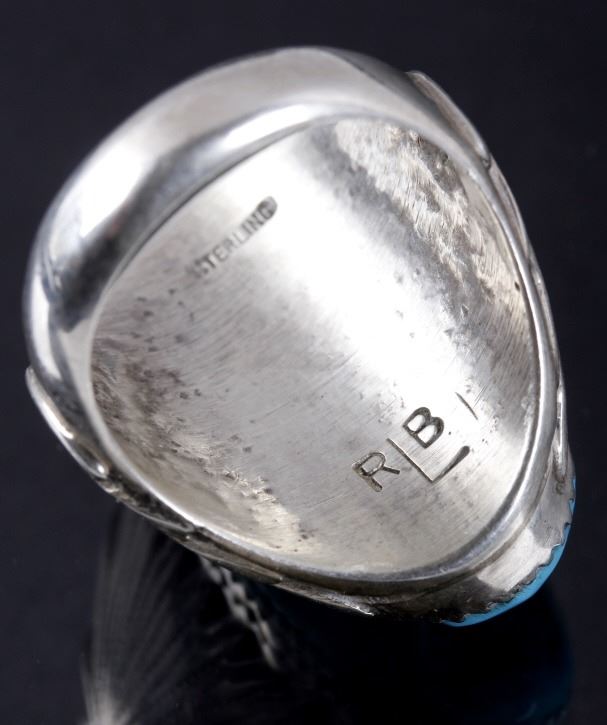 Available now for bidding is a signed Navajo Native American Indian ring, composed of sterling silver, and boasting a large sleeping beauty turquoise nugget front and center. The turquoise was polished, but left with a raw texture. Flanking the stone on each side are traditional Navajo sunburst patterns. The ring shows the "RLB" hallmark of Robert Leekya, and is also stamped "Sterling", indicating its .925% silver purity. The ring is in good condition overall, with a tightly set stone, and wonderful white mirror tone on the silver. The ring measures to a US size 10 1/4.