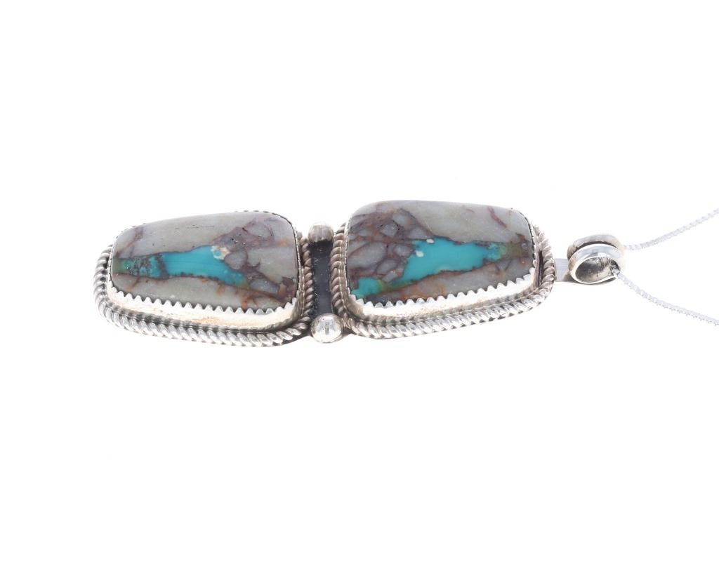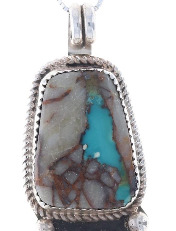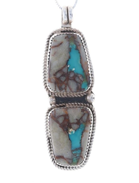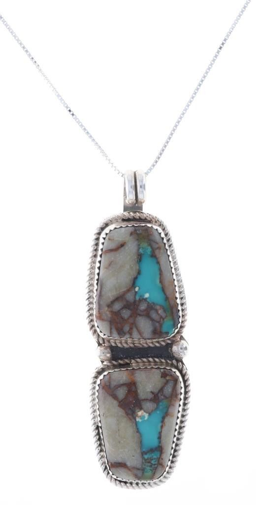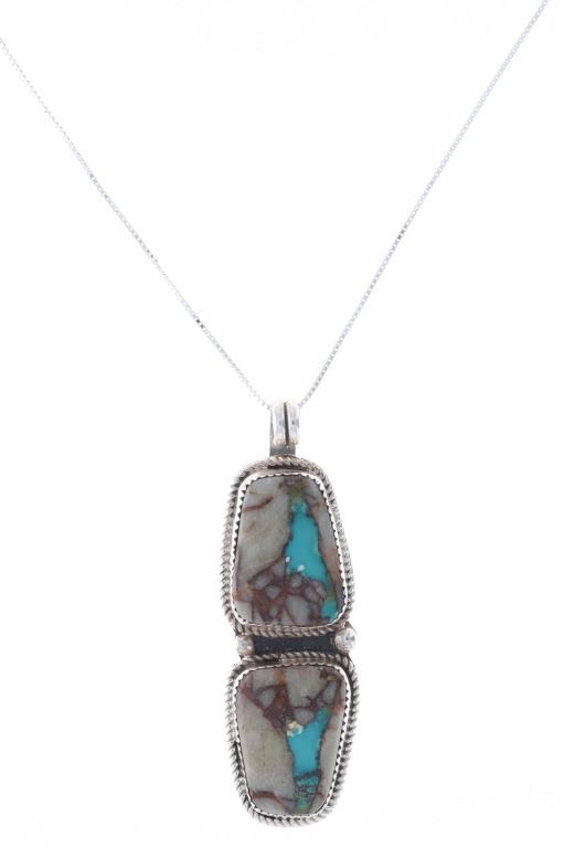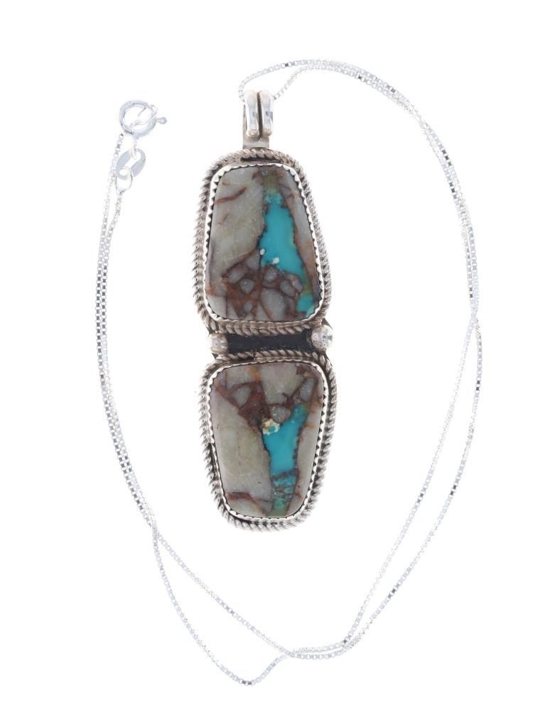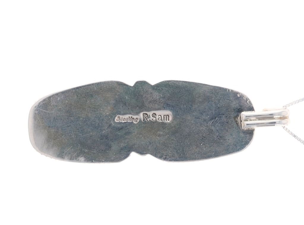 Featured in this lot is this Blue Gem turquoise in agate sterling necklace done by renowned Navajo silversmith Russell Sam. This two piece pendant necklace shows two cabochons of agate with a small piece of Blue Gem turquoise in each. Both cabochons are set in sterling with a rope style border and two sterling beads in between them. The pendant is set on a sterling box chain. The back of the pendant shows the makers hallmark and the sterling stamp reading, "Sterling R. Sam". The necklace is in good condition with no signs of damage present. The cabochons measure 7/8" L x 5/8" W. The necklace from clasp to clasp measures 18" L. The necklace weighs 19.7 grams.