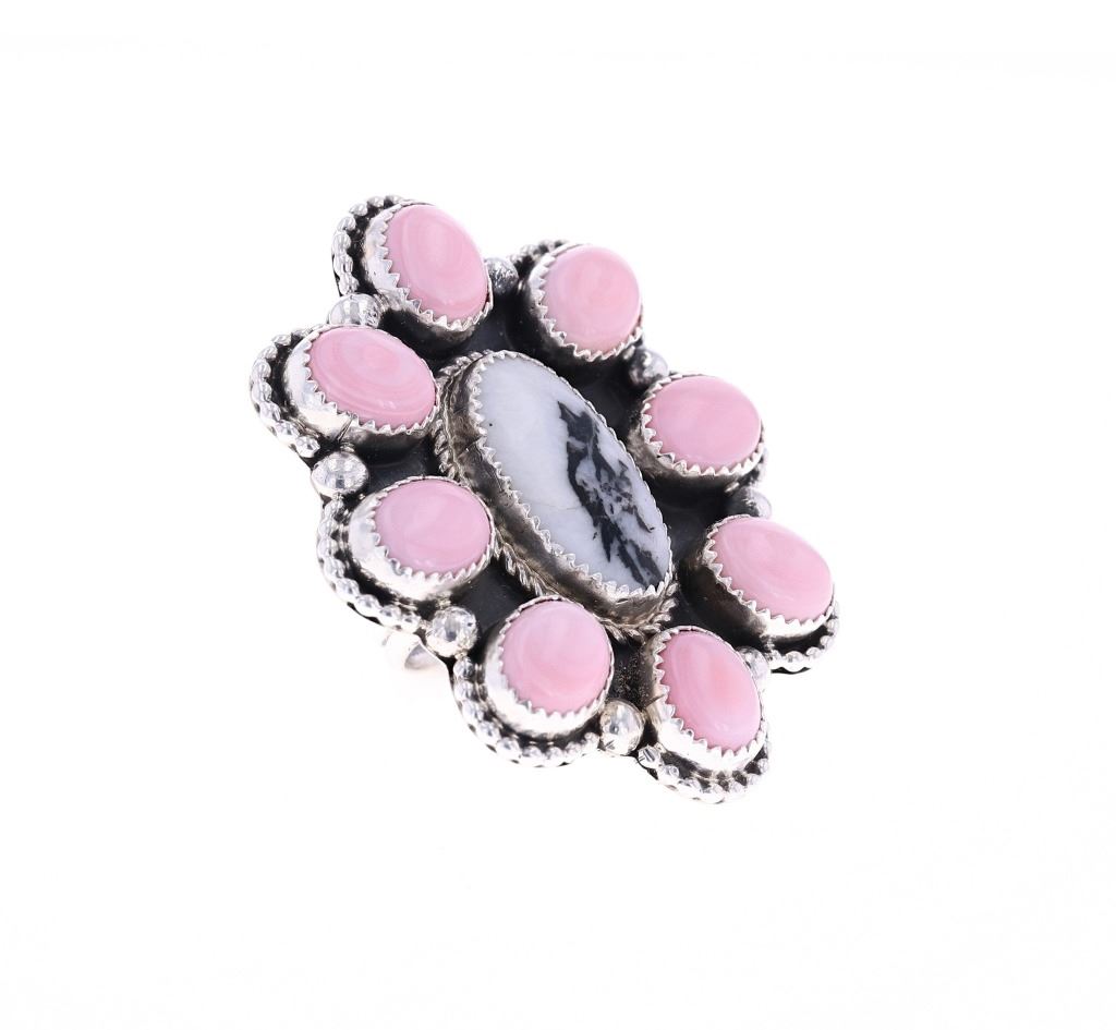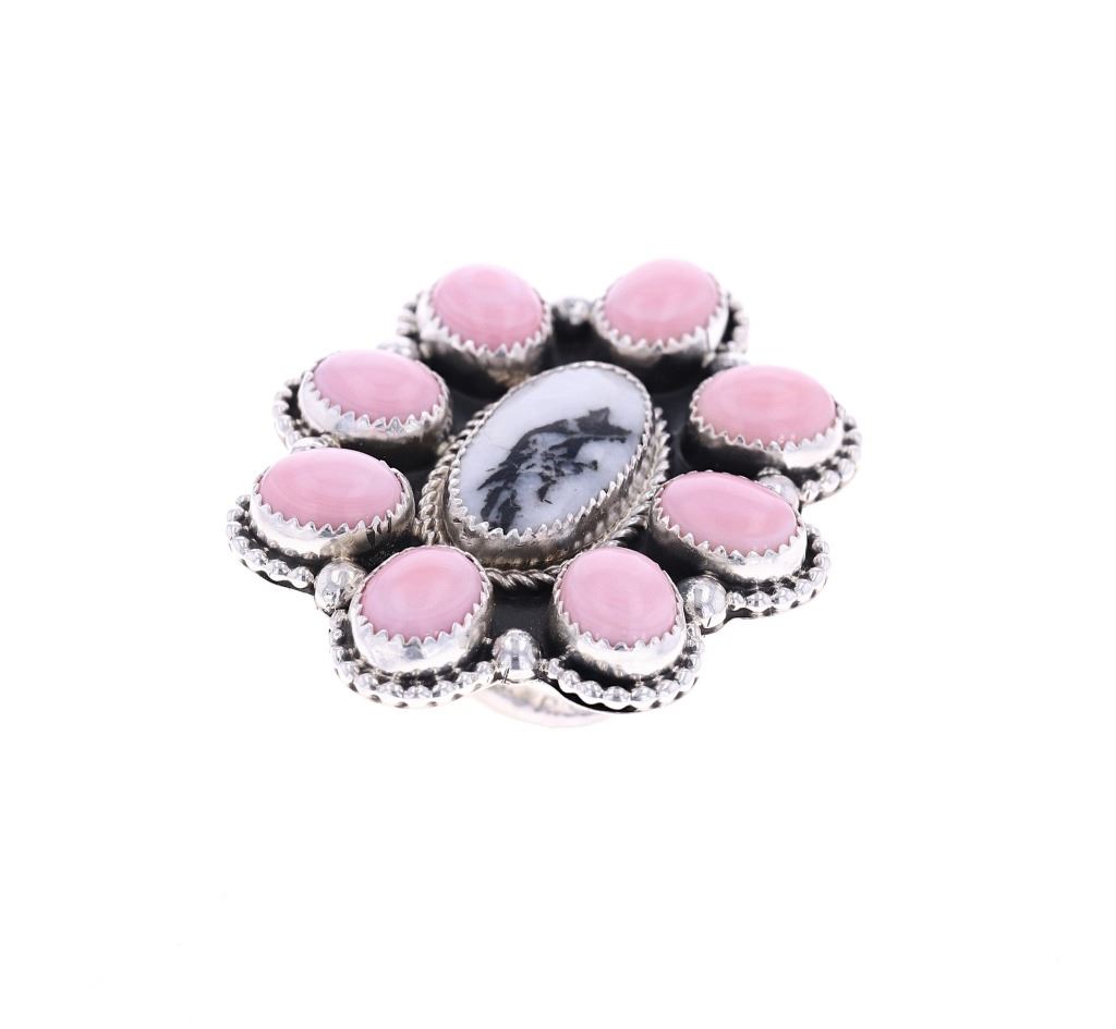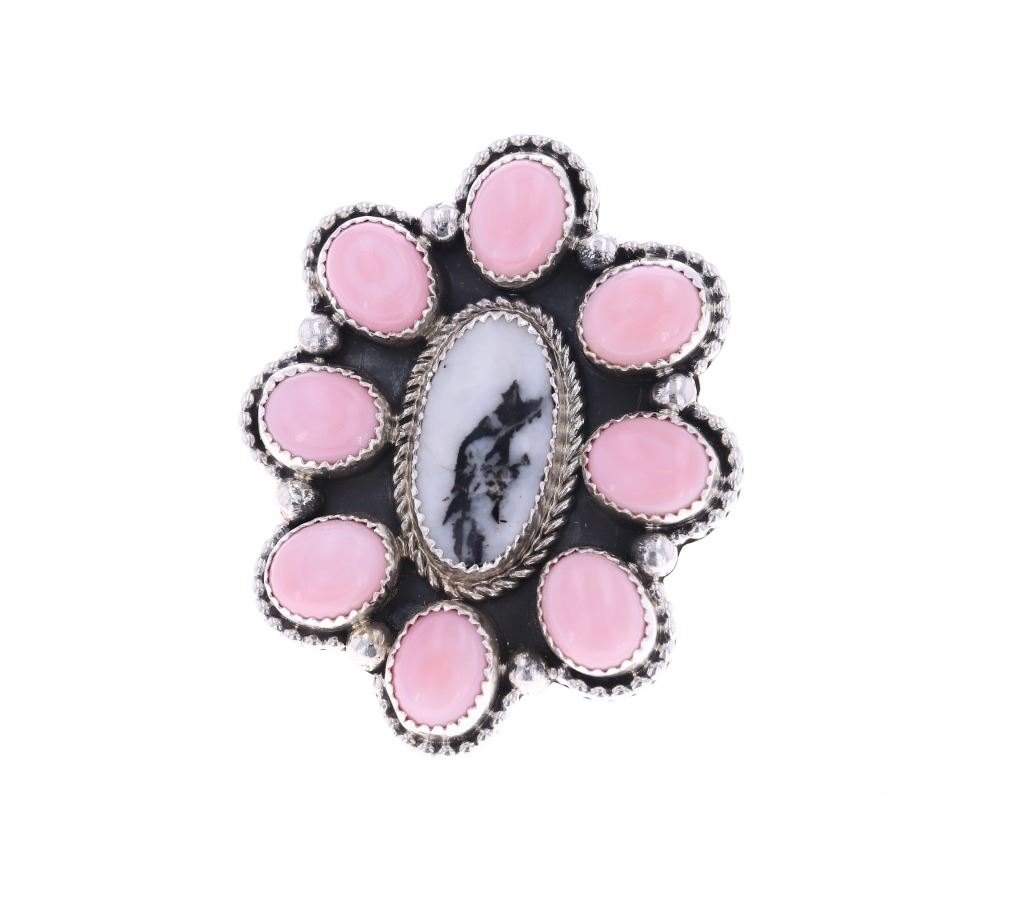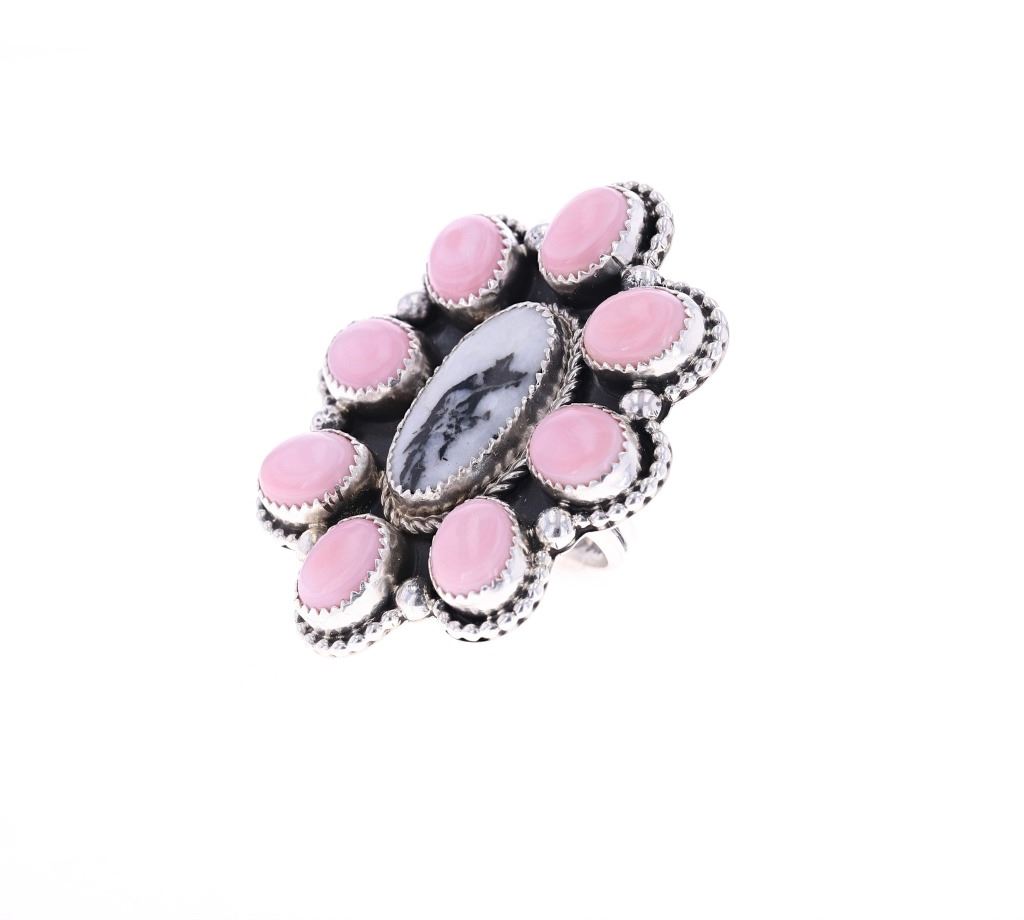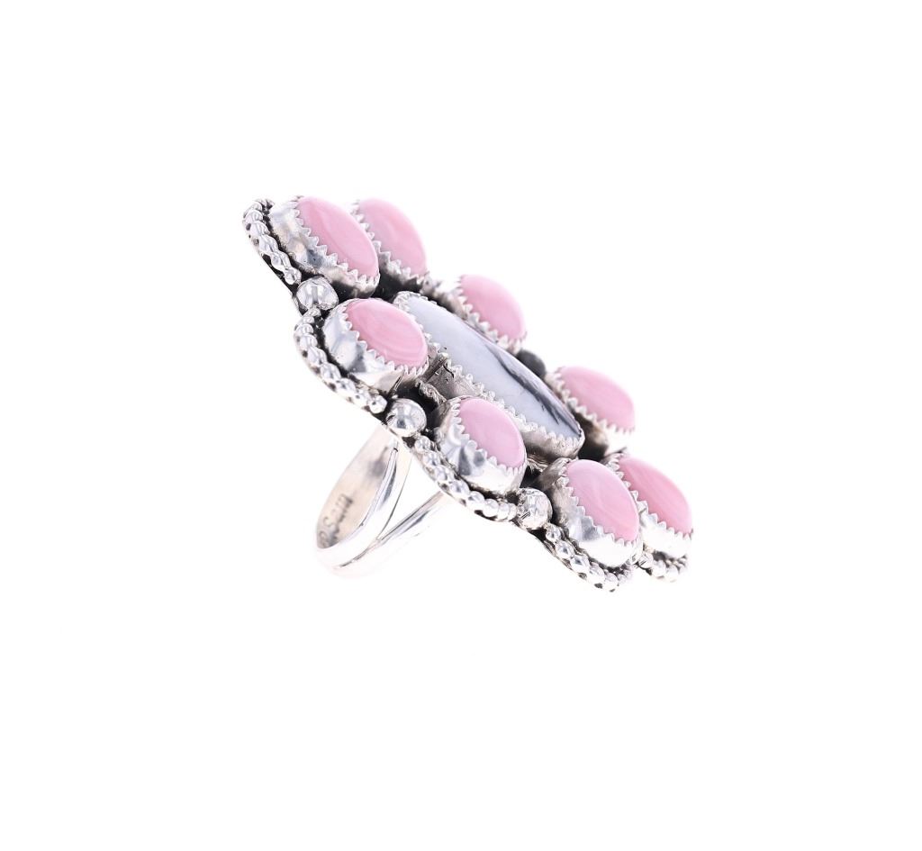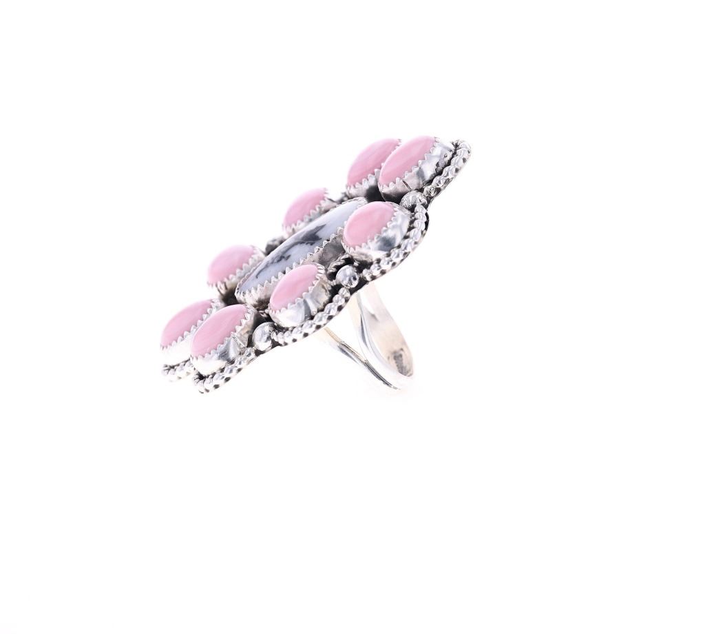 Featured in this lot is a sterling silver pink conch ring from Navajo artist, R. Sam. The ring features a wonderfully and professionally crafted sterling silver, pink conch, and white buffalo turquoise construction and shows a scalloped edge with twisted rope borders and a total of eight pink conch oval cut cabochon with a central stone of oval cut white buffalo turquoise cabochon. The ring is marked as follows: R. Sam - Sterling. The condition of this Navajo ring is good with no obvious signs of damage and shows good overall condition. The measurements of this ring are 2 1/8" x 1 5/8" x 1 1/8" and shows a ring size of US 6 1/2. The collective weight of this ring is 25.4g.*