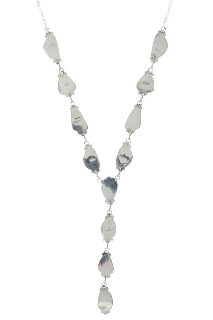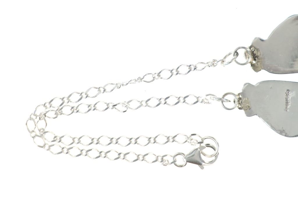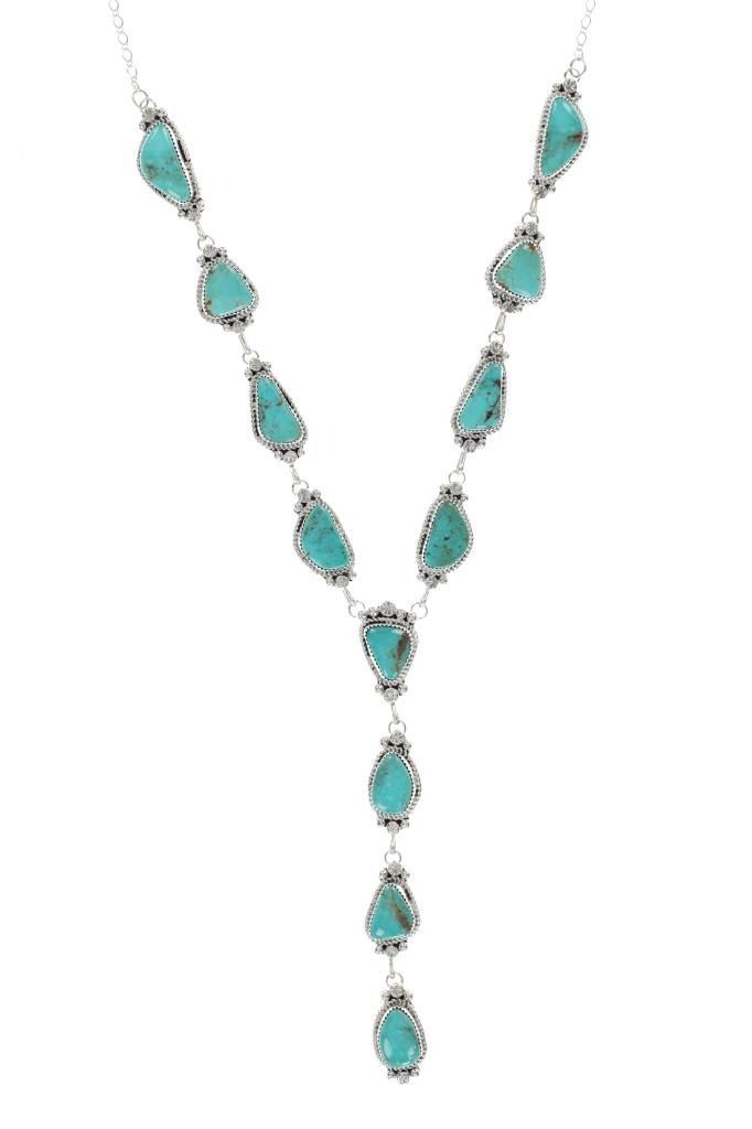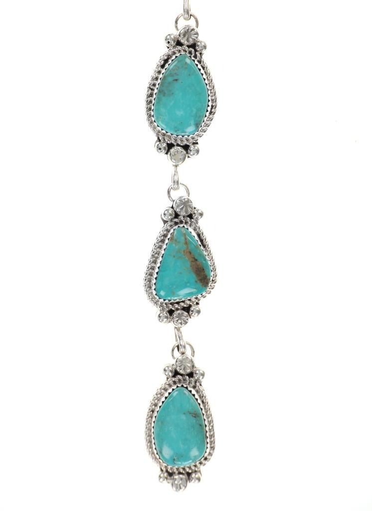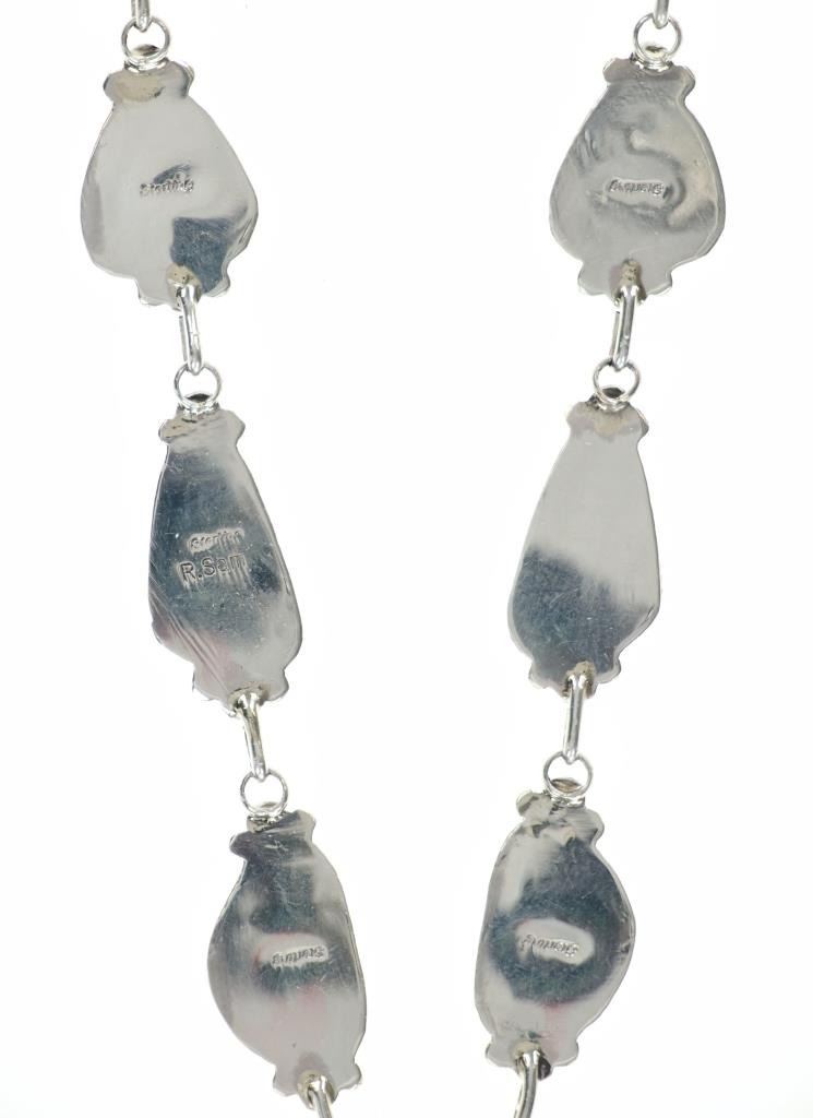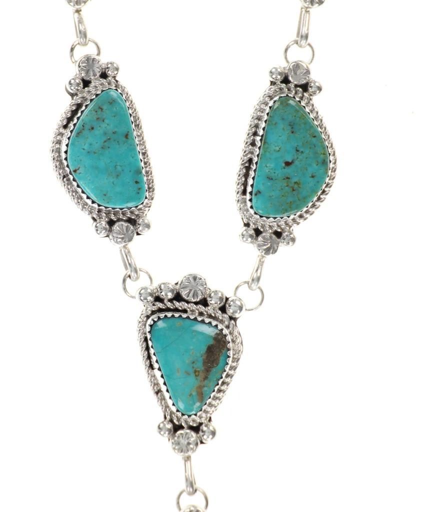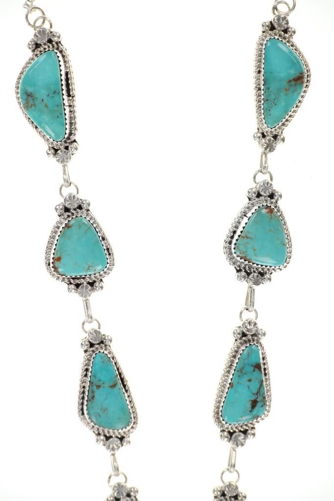 Featured in this lot is a sterling silver turquoise necklace from Navajo artist, R. Sam. The necklace features a wonderfully and professionally crafted sterling silver and cripple creek turquoise construction. It shows a sterling silver link chain with linked pendants with sterling silver frames and twisted rope borders. There are a total of 12 cripple creek turquoise cabochon set into the center of the pendant links. Each of the links and the hanging arrangement are marked as follows: Sterling - R. Sam. The condition of this Navajo necklace is good with no obvious signs of damage and shows good overall condition. The measurement of this necklace from clasp to clasp is 22 1/4" and the central arrangement measures 5 3/4" x 13 1/2". The collective weight of this necklace is 79.3g.*