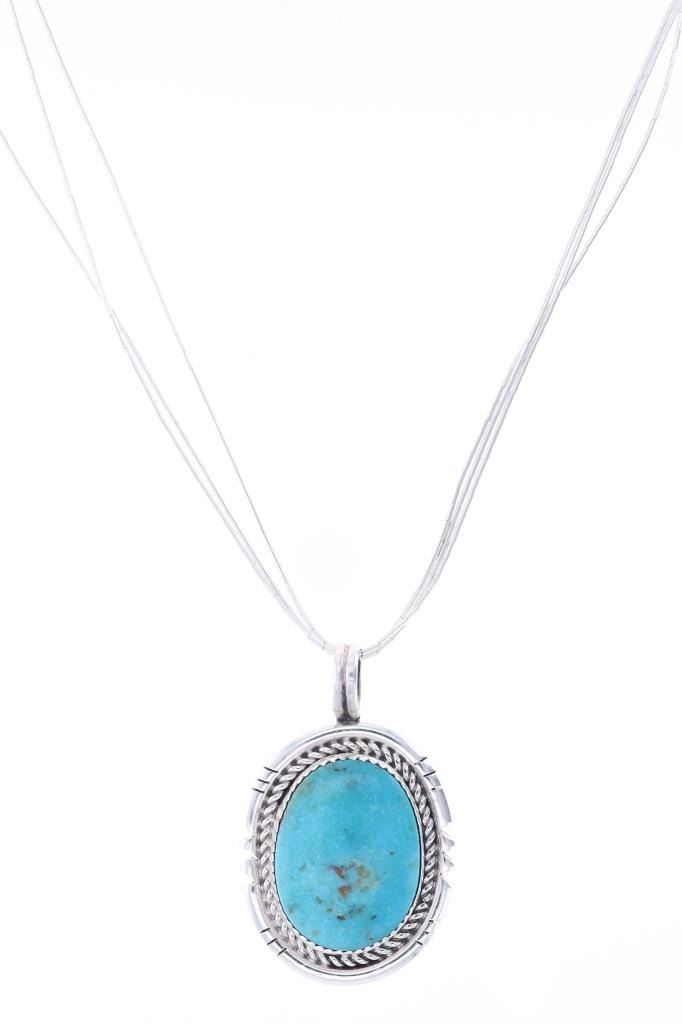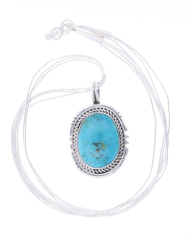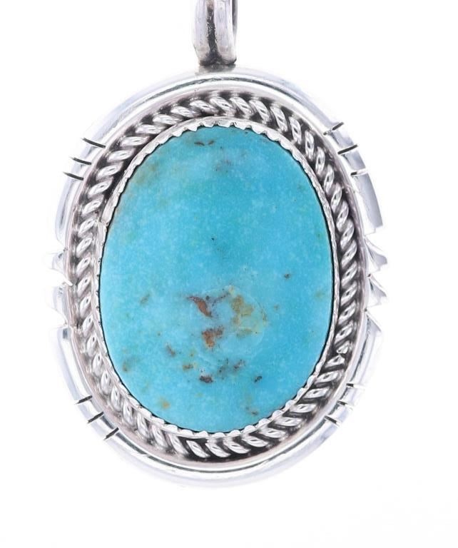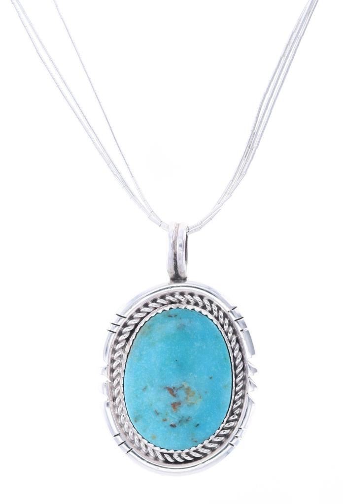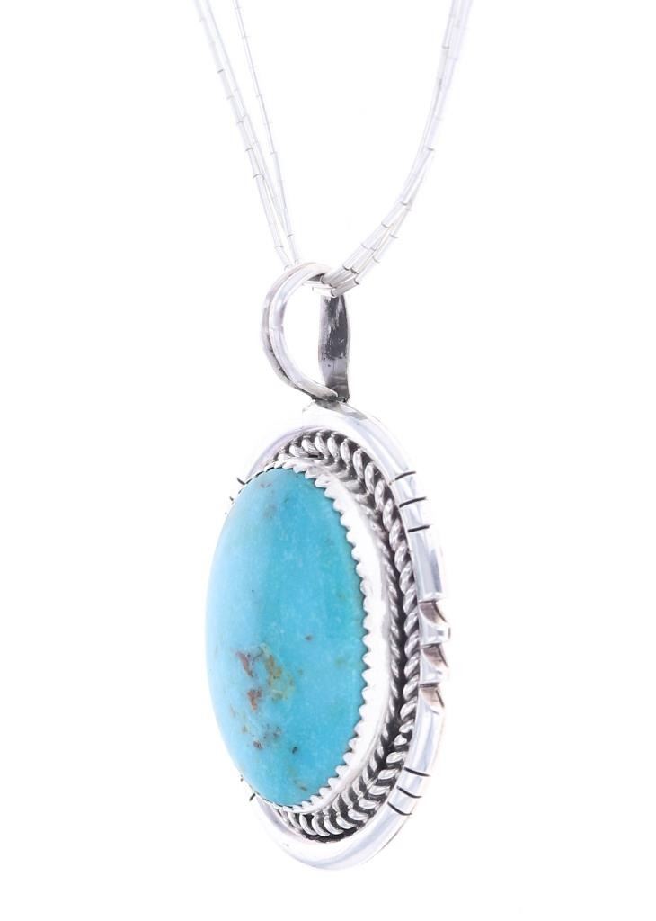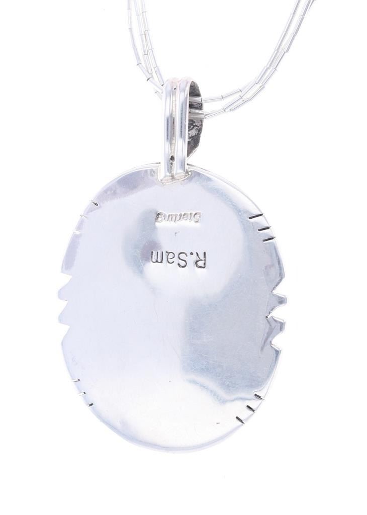 Featured in this lot is this sterling silver Blue Gem turquoise necklace from Navajo artist R. Sam. The necklace features a wonderfully and professionally crafted sterling silver and Blue Gem Turquoise construction that shows a sterling silver pendant and shows a oval cut Blue Gem Turquoise cabochon. The pendant is marked as follows: R. Sam - Sterling. The condition of this Navajo necklace is good with no obvious signs of damage and shows good overall condition. The measurements of this necklace from clasp to clasp 19 1/2" and the pendant measures 1 3/4" x 1 1/8". The collective weight of this necklace is 16.9g.