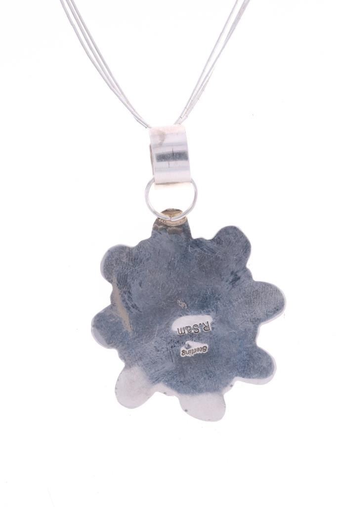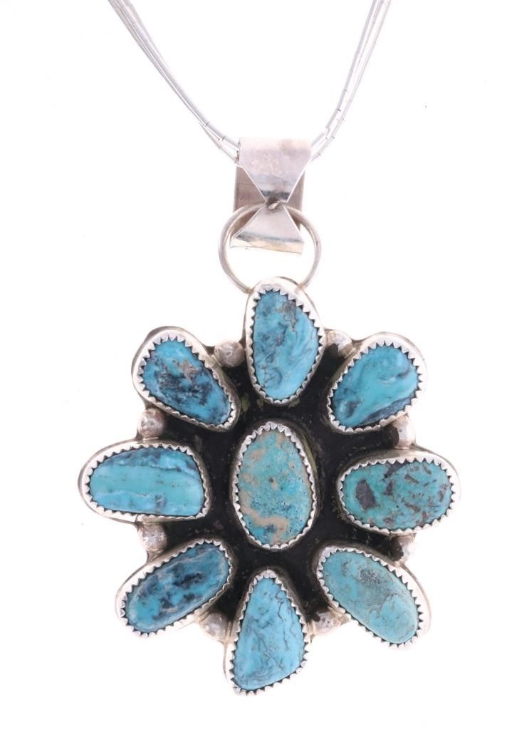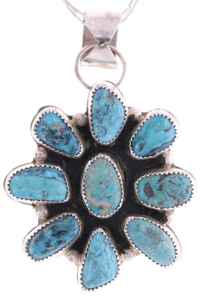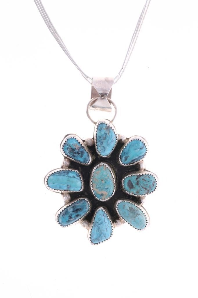 Featured in this lot is a Captivating Sterling Silver Cripple Creek Turquoise Pendant Necklace from Navajo Diné artist R. Sam. The pendant necklace features a wonderfully and professionally crafted Sterling Silver and Cripple Creek turquoise construction. Navajo craftsmanship is seen in this delicate design that captures the essence of timeless beauty. The liquid silver three strand with a hook clasp holds a sterling silver mounting of eight sawtooth bezel mounted Cripple Creek turquoise cabochons separated by silver beads which surround a larger Cripple Creek cabochon. The pendant necklace is in very nice condition, pendant measures 12"L closed, pendant is 2.25" diameter. Collective weight 22.4 grams.