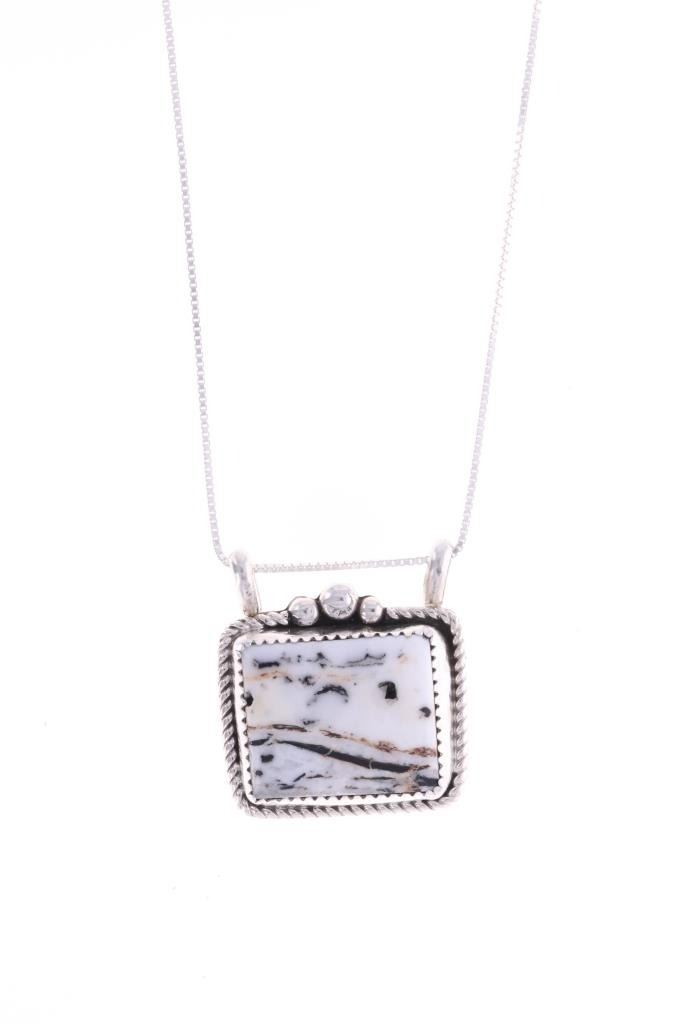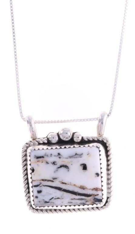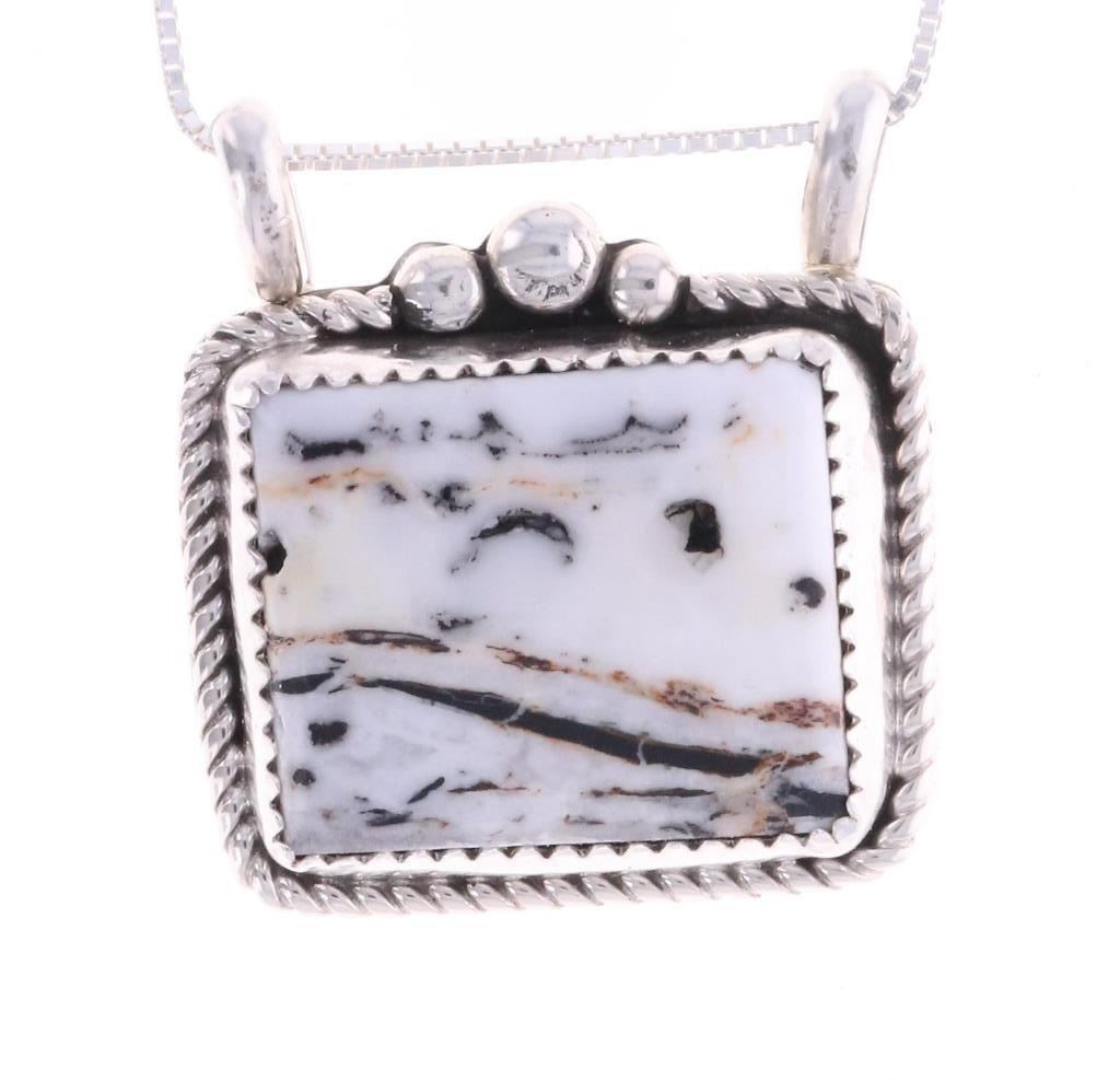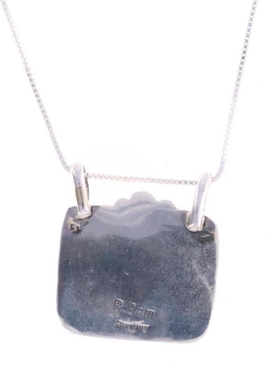 Featured in this lot is this sterling silver and white buffalo turquoise necklace from Navajo artist R. Sam. The necklace features a wonderfully and professionally crafted sterling silver construction that shows a square cut white buffalo turquoise cabochon set into the center with a sterling silver box chain. The back of the pendant is marked as follows: R. Sam - Sterling. The condition of this Navajo necklace is well preserved with no obvious signs of damage and shows a well preserved overall condition. The measurements of this pendant is 1 1/8" x 1 1/8" and the chain length is 17 1/2". The collective weight of this necklace is 11.6g.