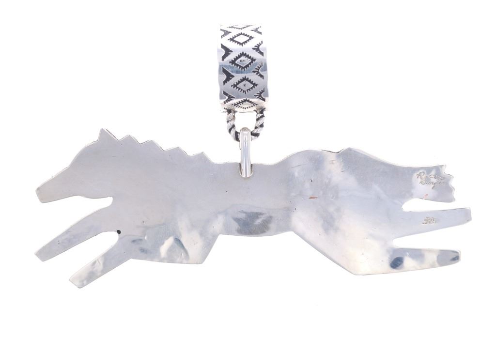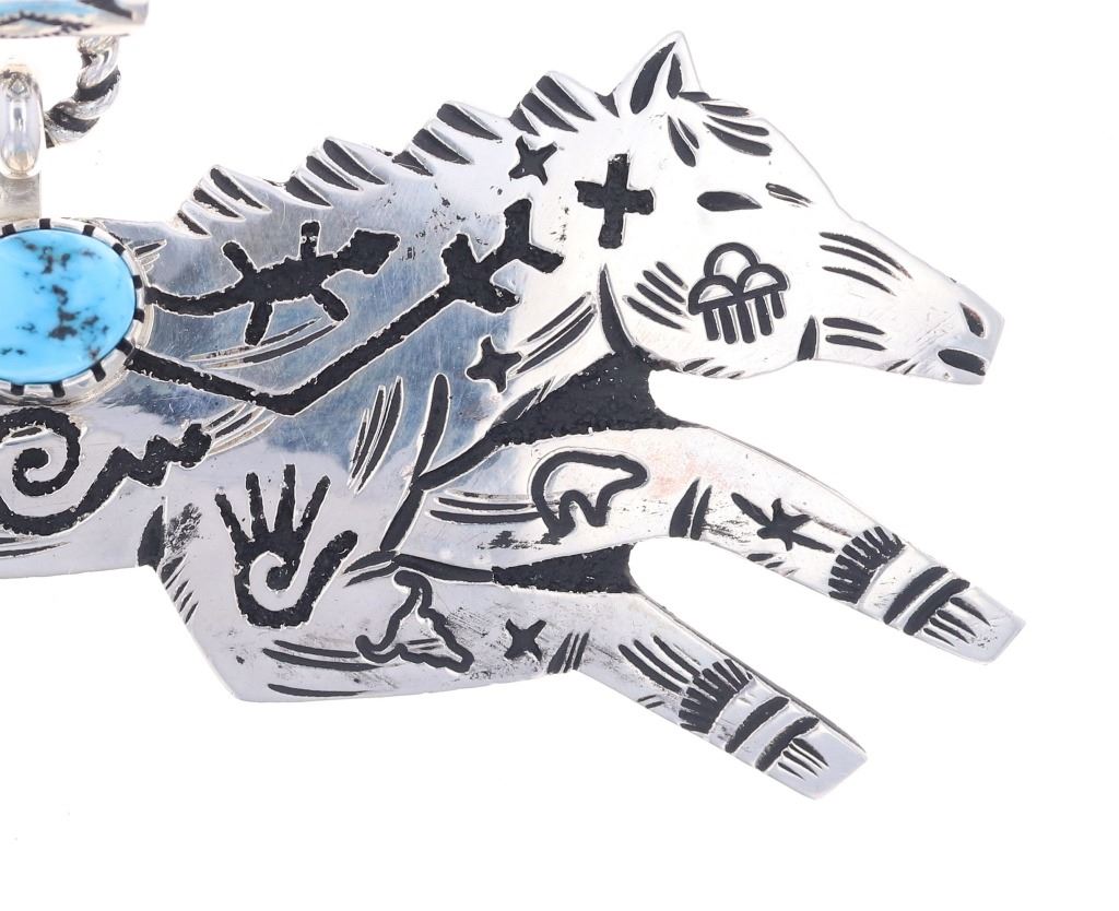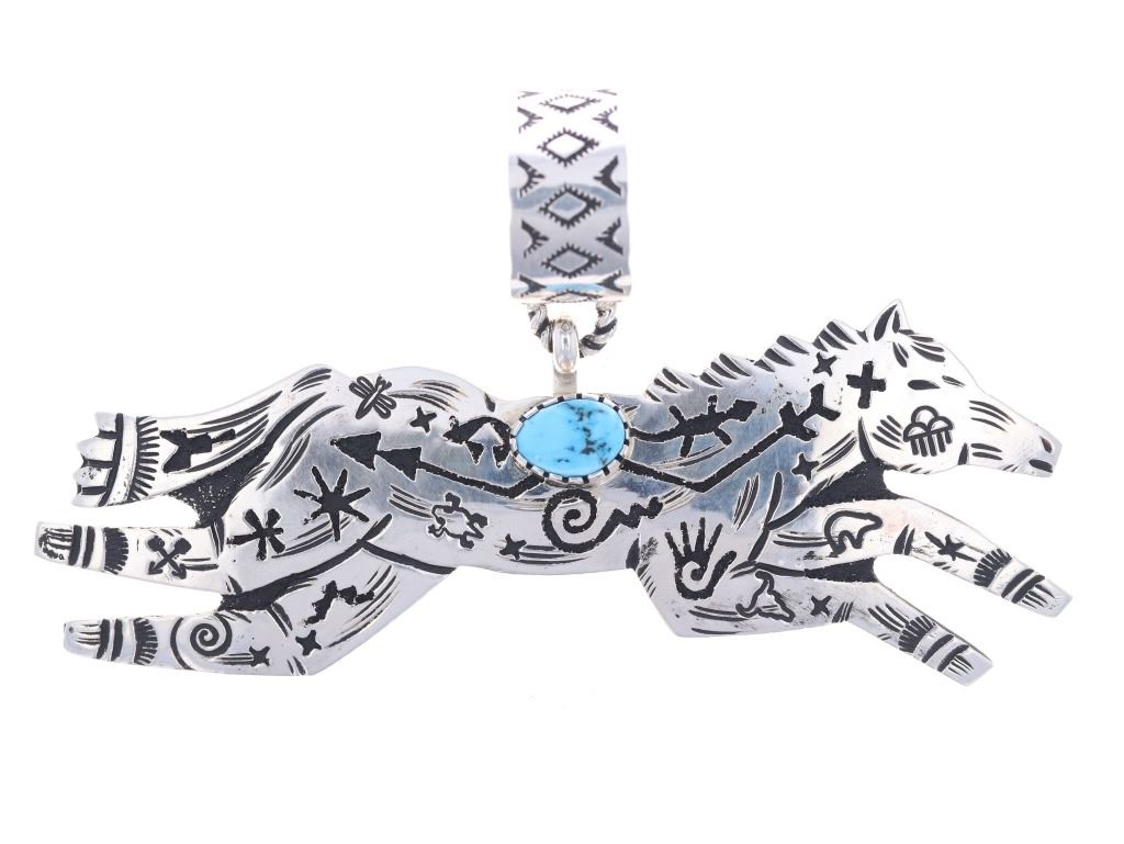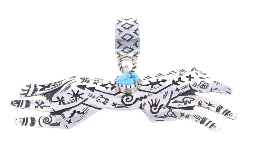 Featured in this lot is a sterling silver turquoise horse pendant from Navajo artist, Richard Singer. The pendant features a wonderfully and professionally crafted sterling silver and turquoise construction that shows a stamped and tooled horse pendant with an oval cut sleeping beauty turquoise cabochon to the face of the pendant. The pendant is marked as follows: R. Singer - .925. The condition of this Navajo pendant is good with no obvious signs of damage and shows good overall condition. The measurements of this pendant are 2 7/8" x 4 1/4" x 7/8". The collective weight of this pendant is 30.97g.*