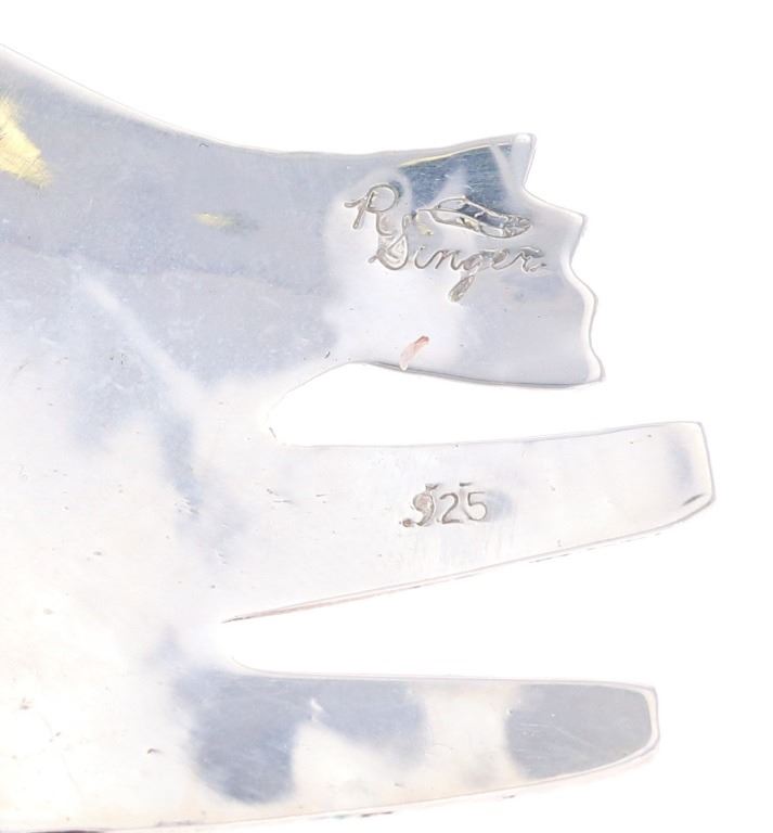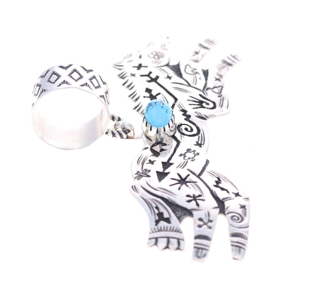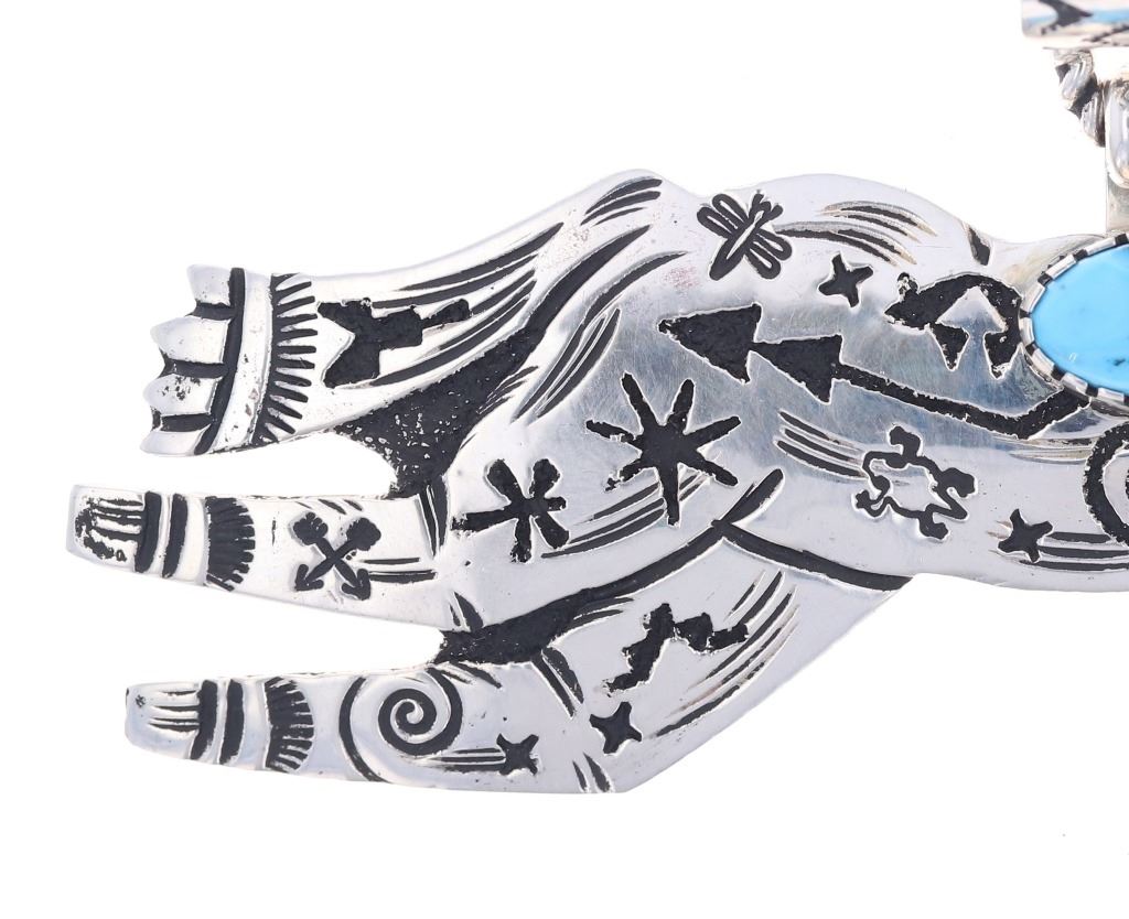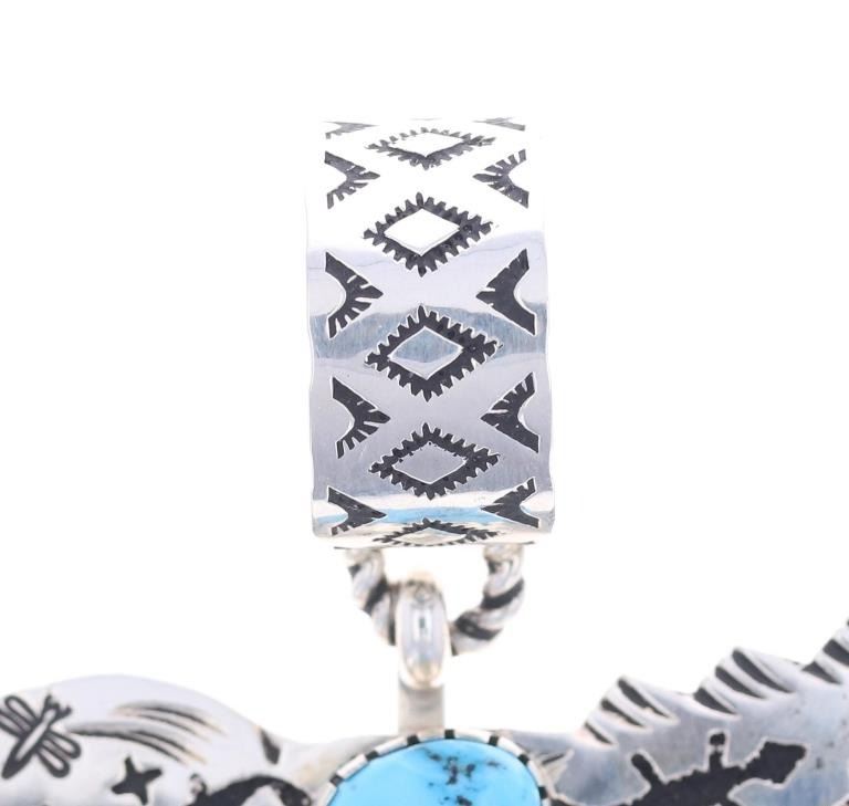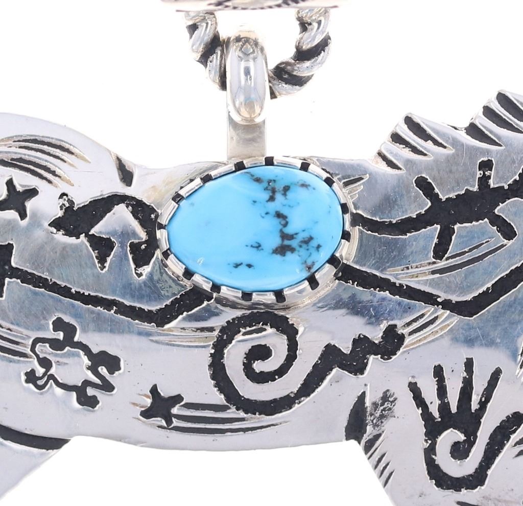 Featured in this lot is a sterling silver turquoise horse pendant from Navajo artist, Richard Singer. The pendant features a wonderfully and professionally crafted sterling silver and turquoise construction that shows a stamped and tooled horse pendant with an oval cut sleeping beauty turquoise cabochon to the face of the pendant. The pendant is marked as follows: R. Singer - .925. The condition of this Navajo pendant is good with no obvious signs of damage and shows good overall condition. The measurements of this pendant are 2 7/8" x 4 1/4" x 7/8". The collective weight of this pendant is 30.97g.*