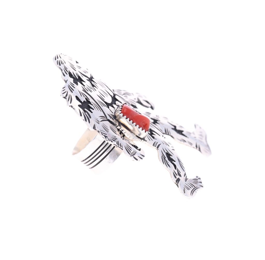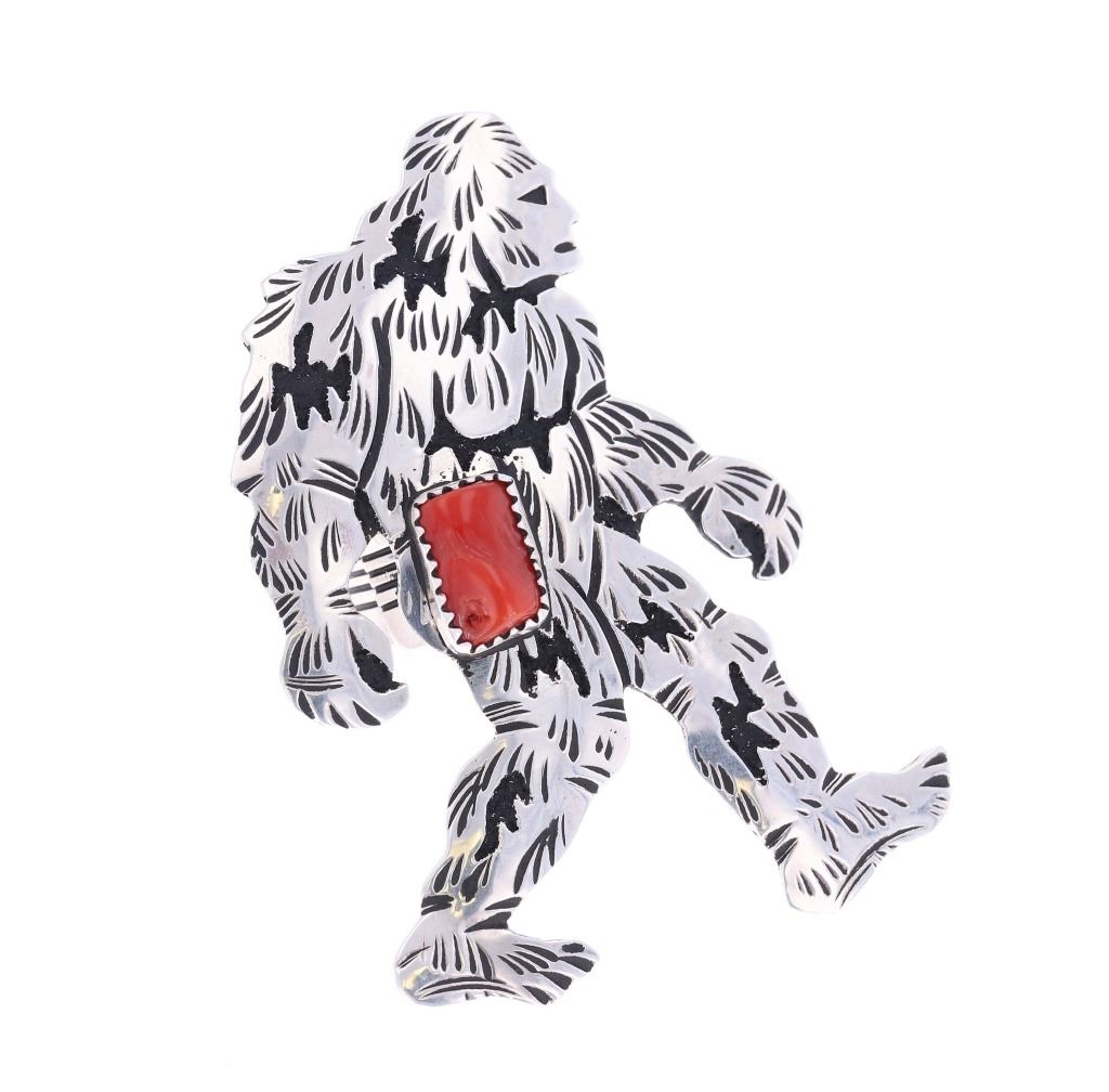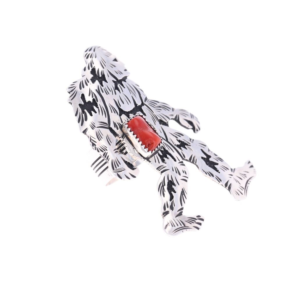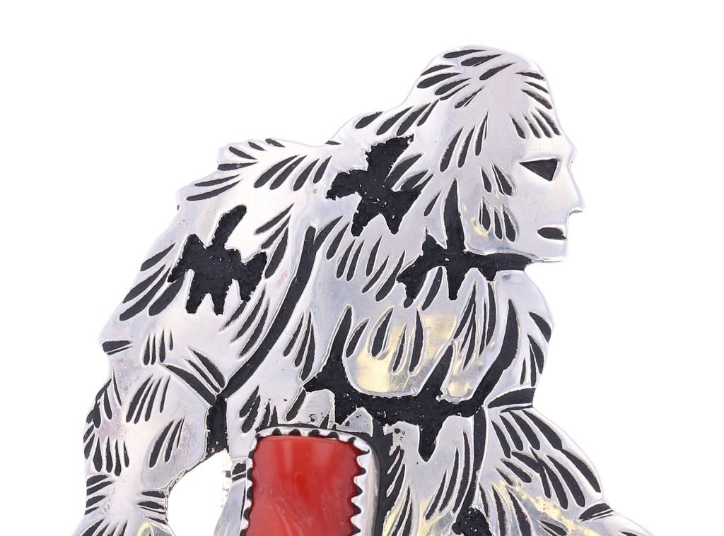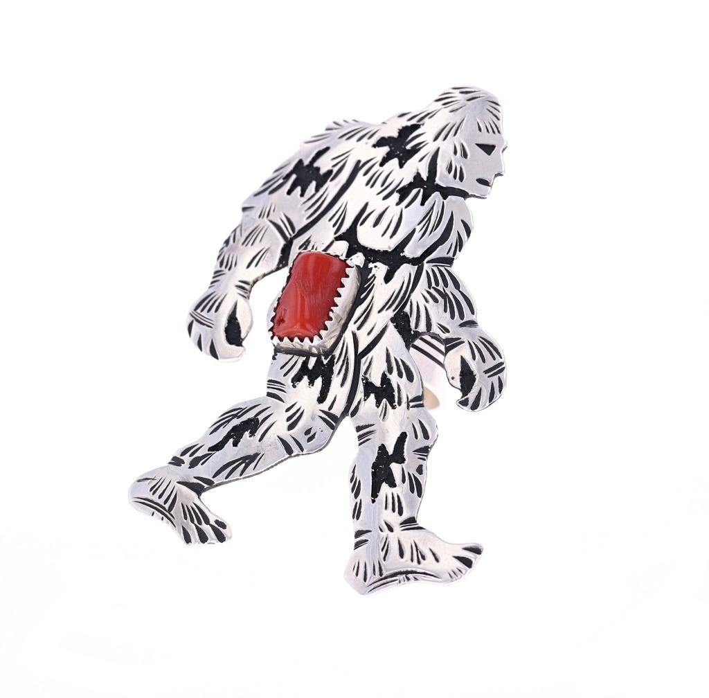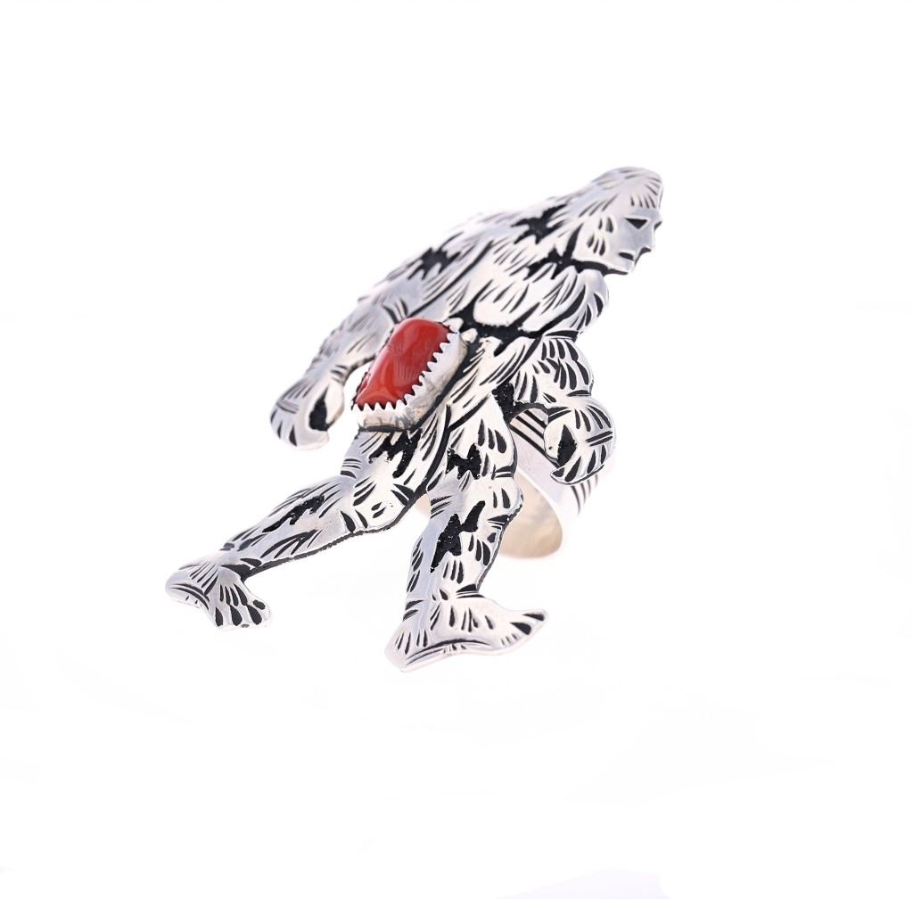 Featured in this lot is this sterling silver and red branch coral Sasquatch ring from Navajo artist Richard Singer. The ring features a wonderfully and professionally crafted sterling silver and red branch coral construction that shows the likeness of Sasquatch walking in its magnificent glory with a rectangular red branch coral cabochon set into the center of the ring. The ring is marked as follows: R. Singer (with a feather) - .925. The condition of this Navajo ring is good with no obvious signs of damage and shows good overall condition. The measurements of this ring is 2 1/2" x 1 3/4" x 1 1/8" and the ring size is adjustable. The collective weight of this ring is 20.4g.