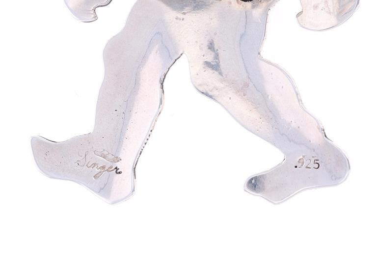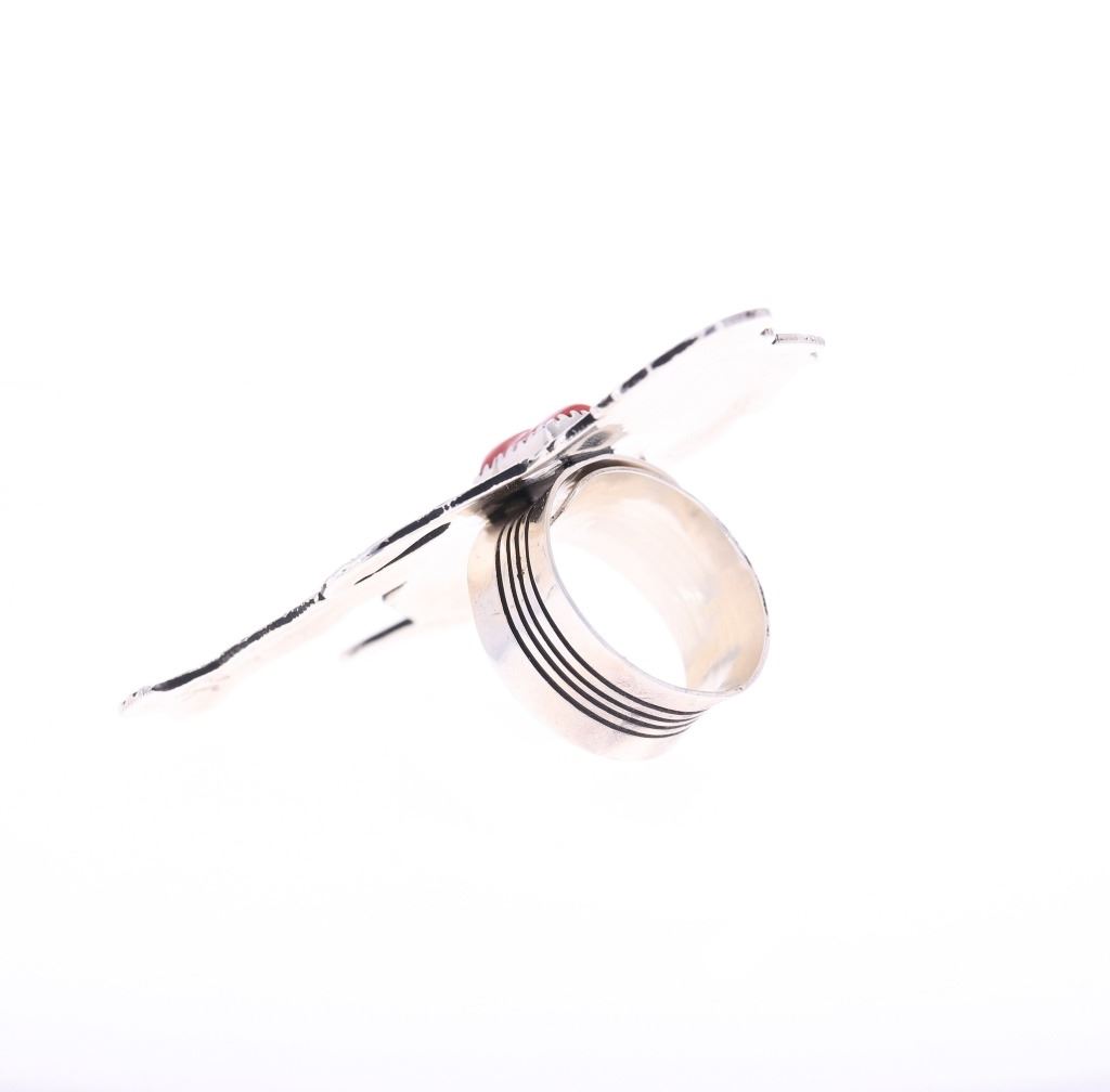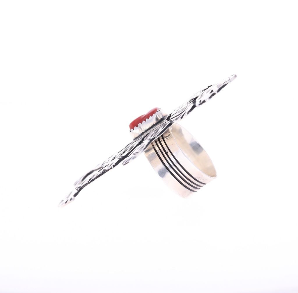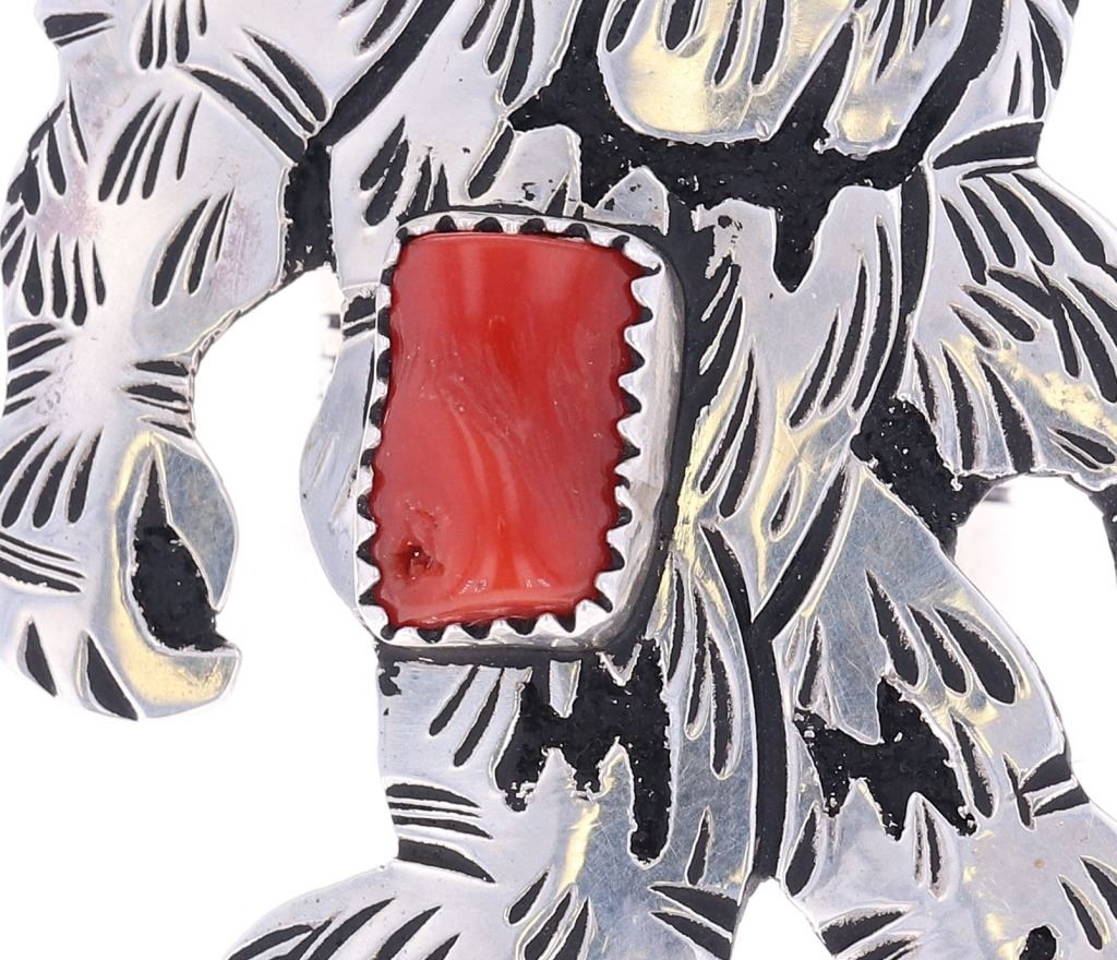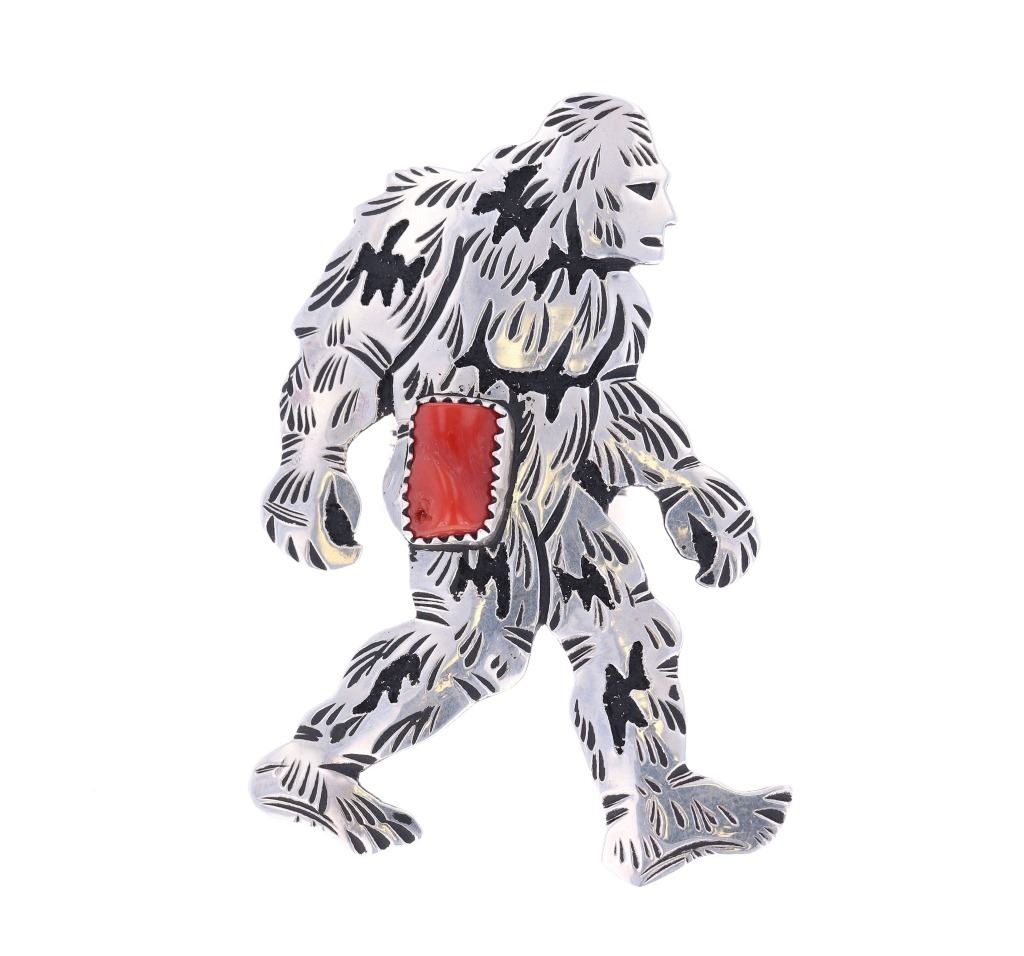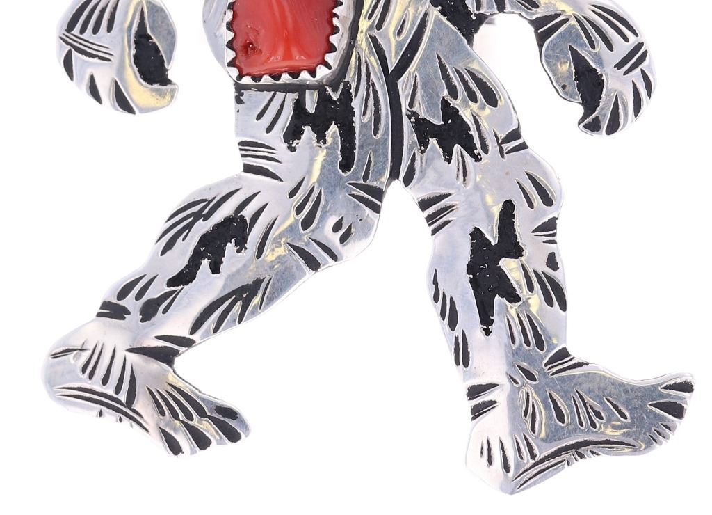 Featured in this lot is this sterling silver and red branch coral Sasquatch ring from Navajo artist Richard Singer. The ring features a wonderfully and professionally crafted sterling silver and red branch coral construction that shows the likeness of Sasquatch walking in its magnificent glory with a rectangular red branch coral cabochon set into the center of the ring. The ring is marked as follows: R. Singer (with a feather) - .925. The condition of this Navajo ring is good with no obvious signs of damage and shows good overall condition. The measurements of this ring is 2 1/2" x 1 3/4" x 1 1/8" and the ring size is adjustable. The collective weight of this ring is 20.4g.