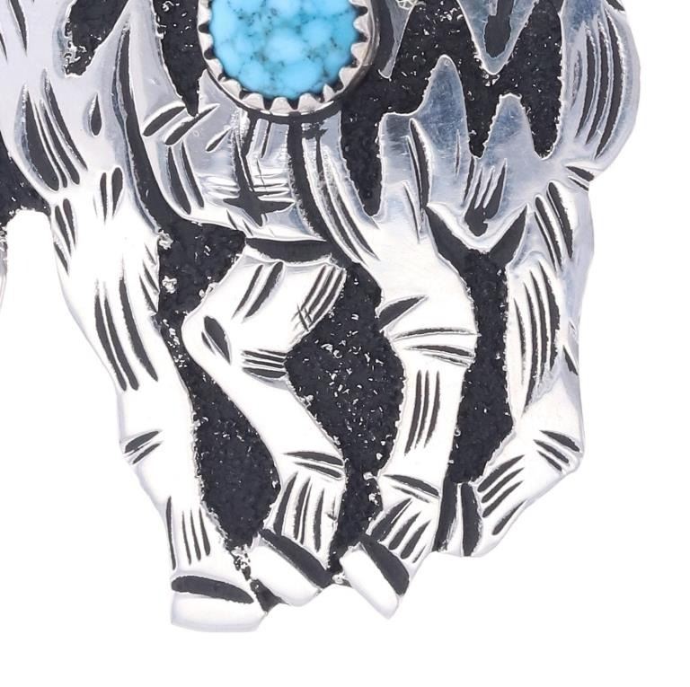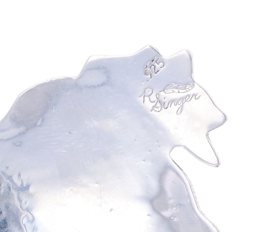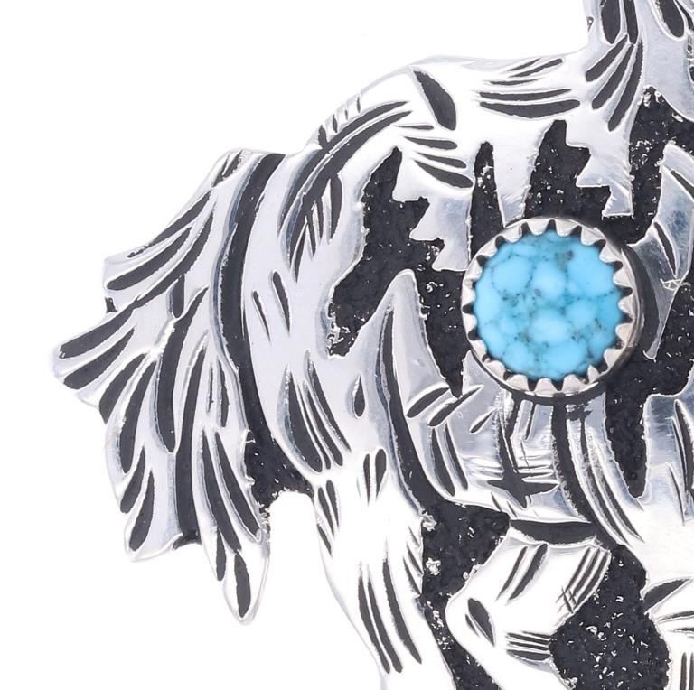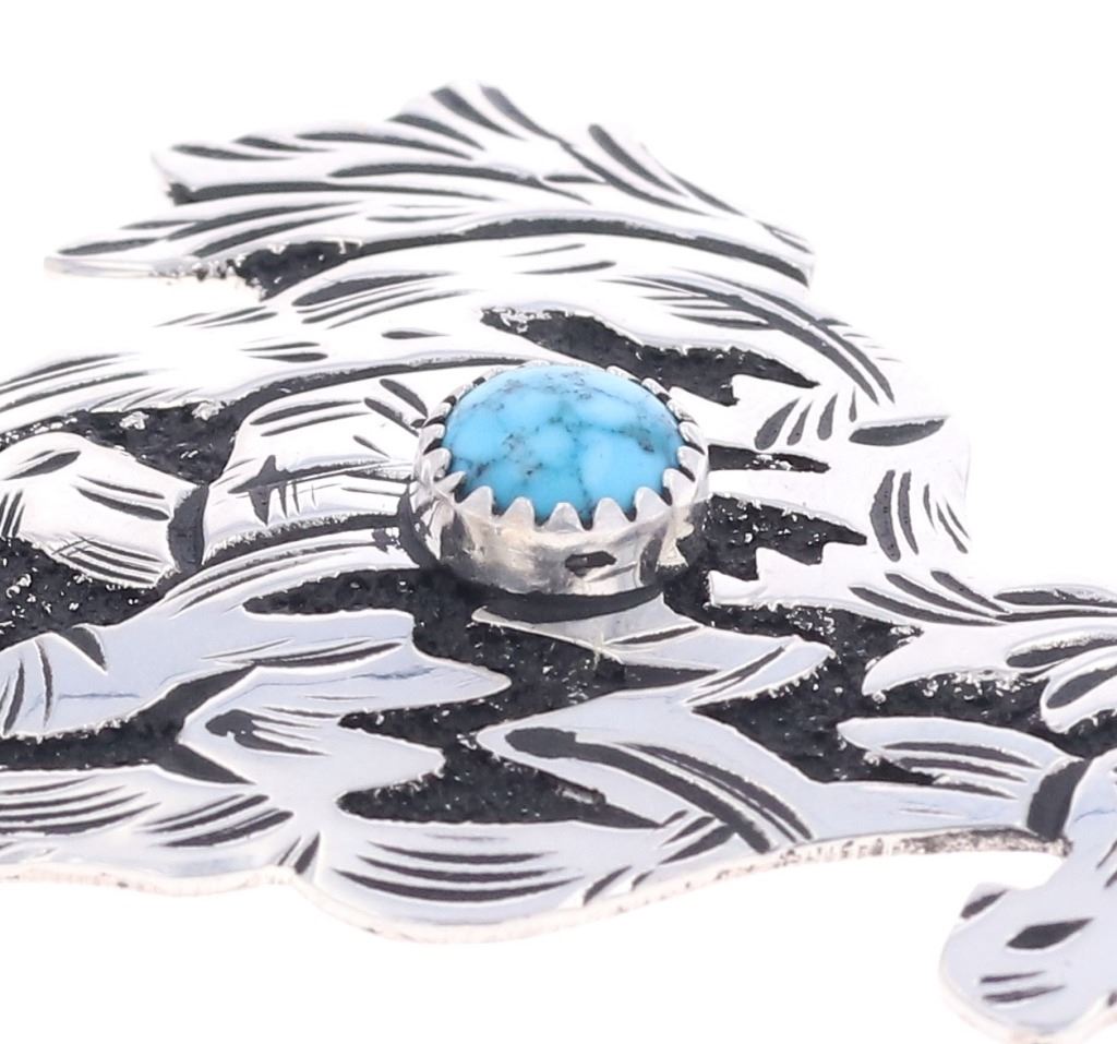 Featured in this lot is a sterling silver necklace pendant from Navajo artist, Richard Singer. The pendant has a professionally crafted sterling silver and Kingman Turquoise construction that shows tooled and stamped decoration with life-like features with a round Kingman turquoise cabochon set into the center. The pendant is marked as follows: .925 - R. Singer with a feather. The condition of this Navajo pendant is good with no obvious signs of damage and shows good overall condition. The measurements of this pendant are 2 3/4" x 1 3/4" x 5/8". The collective weight of this pendant is 13.2g.*