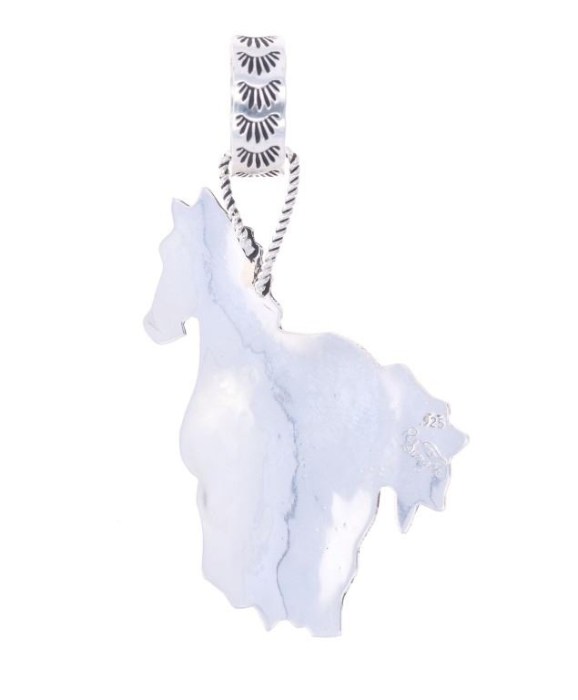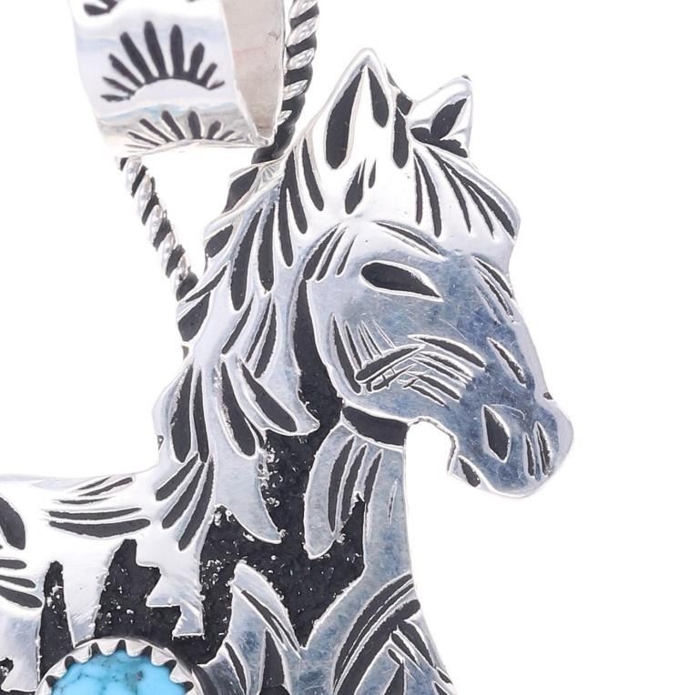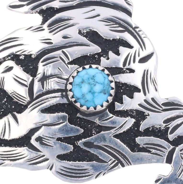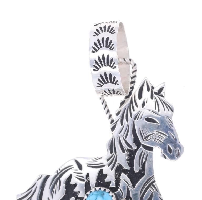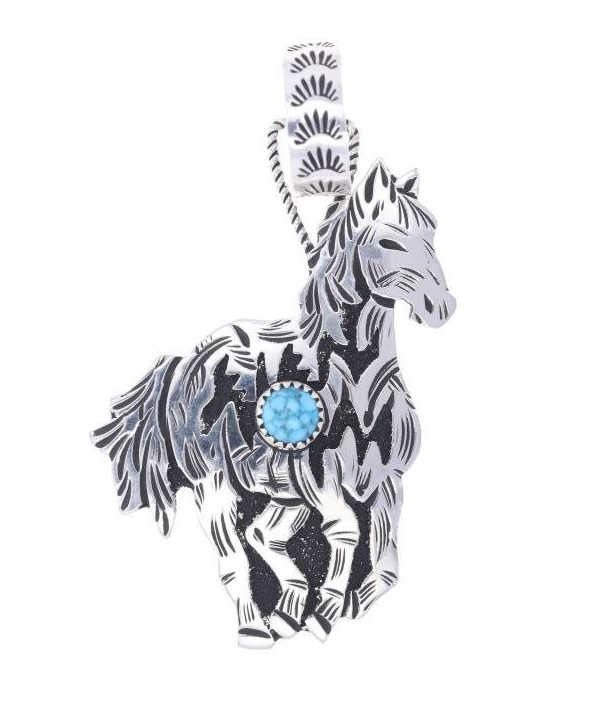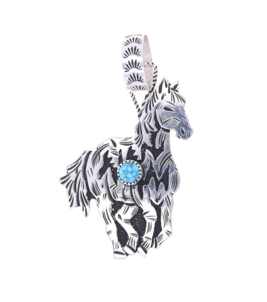 Featured in this lot is a sterling silver necklace pendant from Navajo artist, Richard Singer. The pendant has a professionally crafted sterling silver and Kingman Turquoise construction that shows tooled and stamped decoration with life-like features with a round Kingman turquoise cabochon set into the center. The pendant is marked as follows: .925 - R. Singer with a feather. The condition of this Navajo pendant is good with no obvious signs of damage and shows good overall condition. The measurements of this pendant are 2 3/4" x 1 3/4" x 5/8". The collective weight of this pendant is 13.2g.*