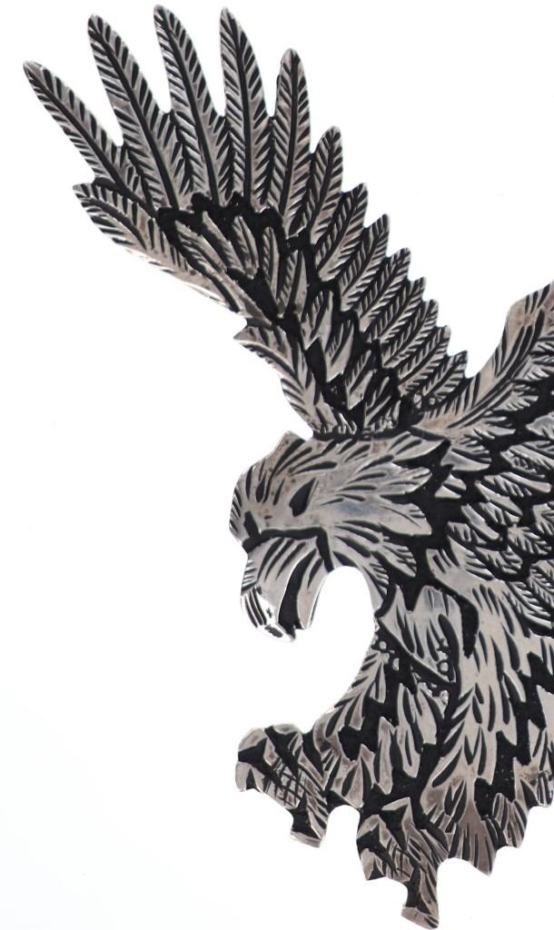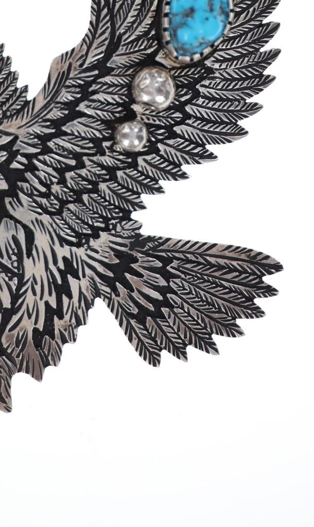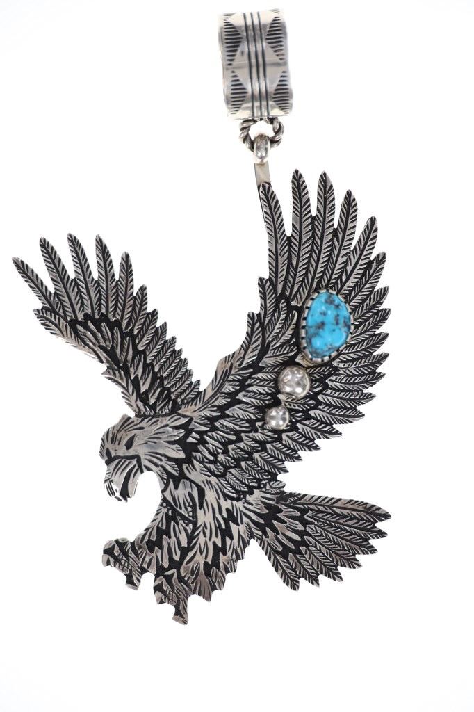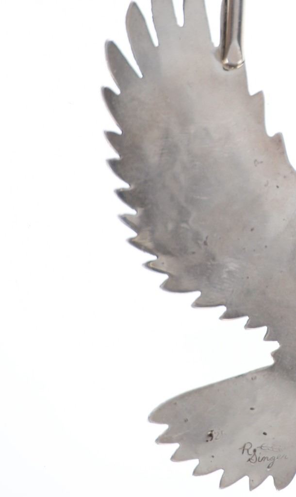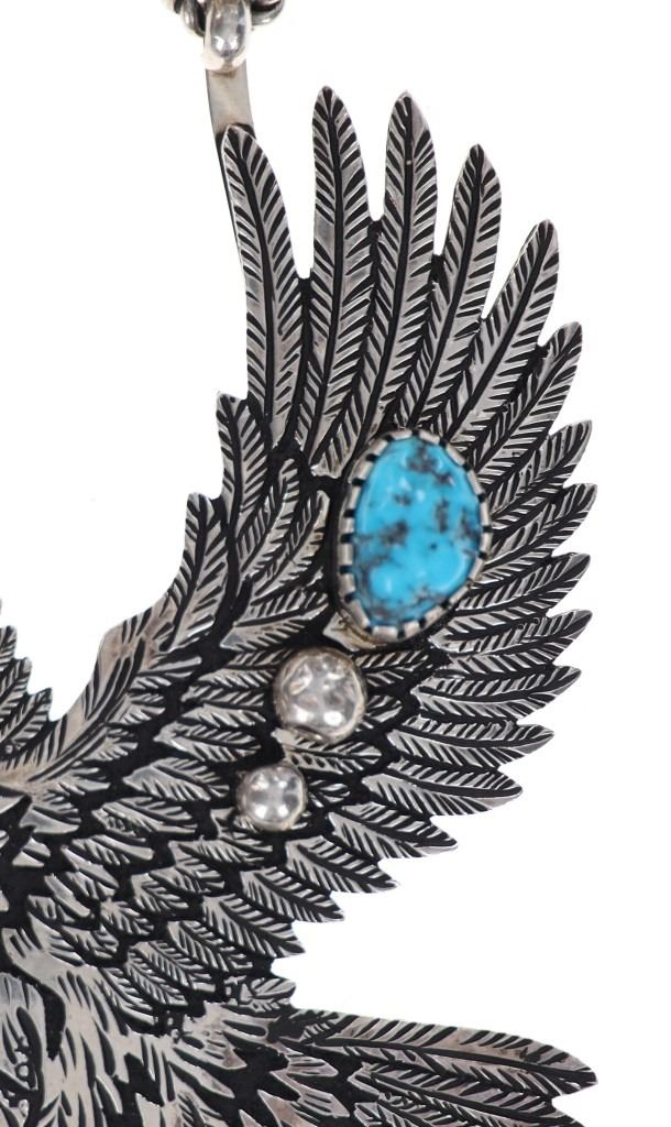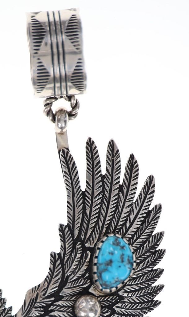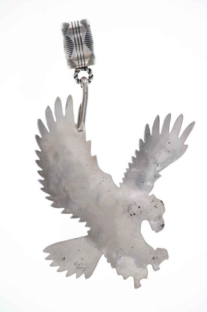 Featured in this lot is this sterling silver and turquoise eagle pendant from Navajo artist R. Singer. The pendant features a wonderfully and professionally crafted sterling silver and Kingman Turquoise construction that shows a the likeness of an eagle poised to catch its prey with great attention to detail of the feathers and is adorned with a rough cut Kingman Turquoise cabochon set into the right wing. The pendant is marked on the back as follows: R. Singer (Feathers) - Sterling. The condition of this Navajo pendant is well preserved with no obvious signs of damage and shows a well preserved overall condition. The measurements of this pendant are 4 1/4" x 2 3/4" x 7/8". The collective weight of this pendant is 37.7g.