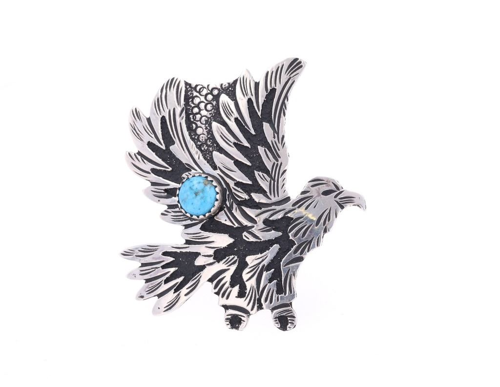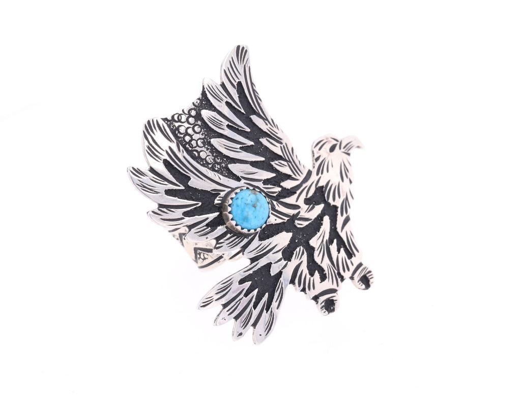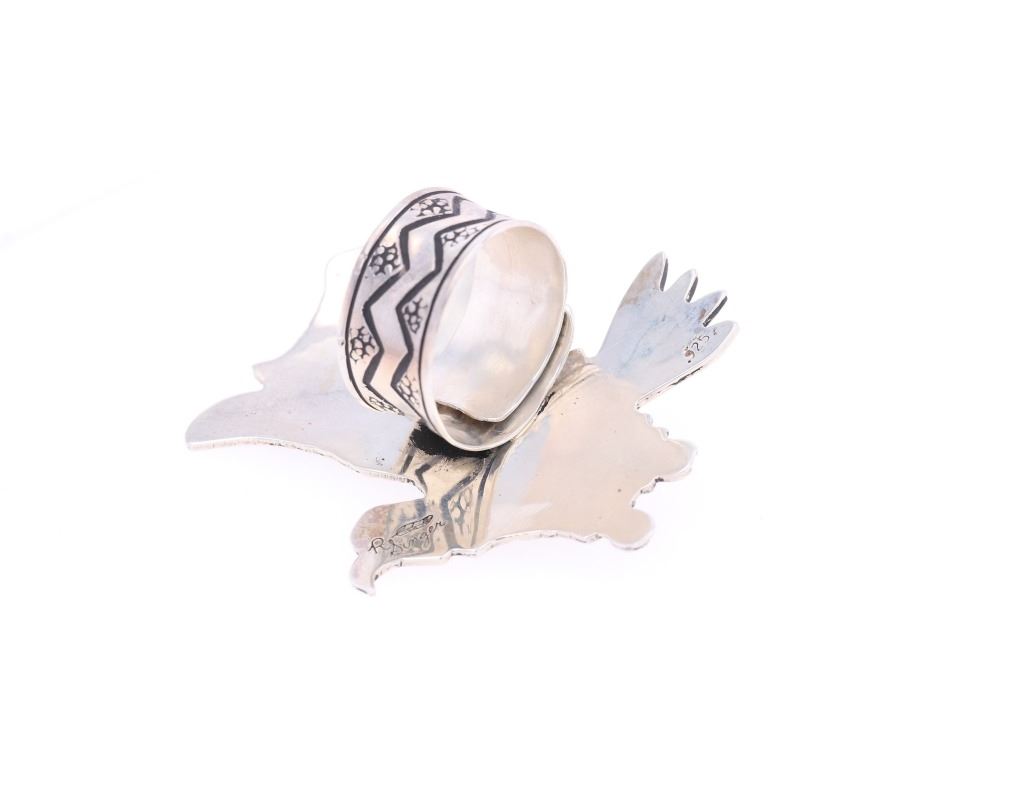 Featured in this lot is this sterling silver and turquoise ring from Navajo artist Richard Singer. The ring features a wonderfully and professionally crafted sterling silver and Sleeping Beauty turquoise construction that shows a life like eagle figural for the ring face that features a round cut Sleeping Beauty turquoise cabochon set in the center of the eagle's wings. The ring size is adjustable with the hallmark on the back of the ring face, "R Singer" with a "feather" and is marked '.925'. The condition of this Navajo ring is good with no obvious signs of damage and shows good overall condition. The measurements of this ring is 1.75"W x 1.75"L x .75"D, collective weight is 16.8g.