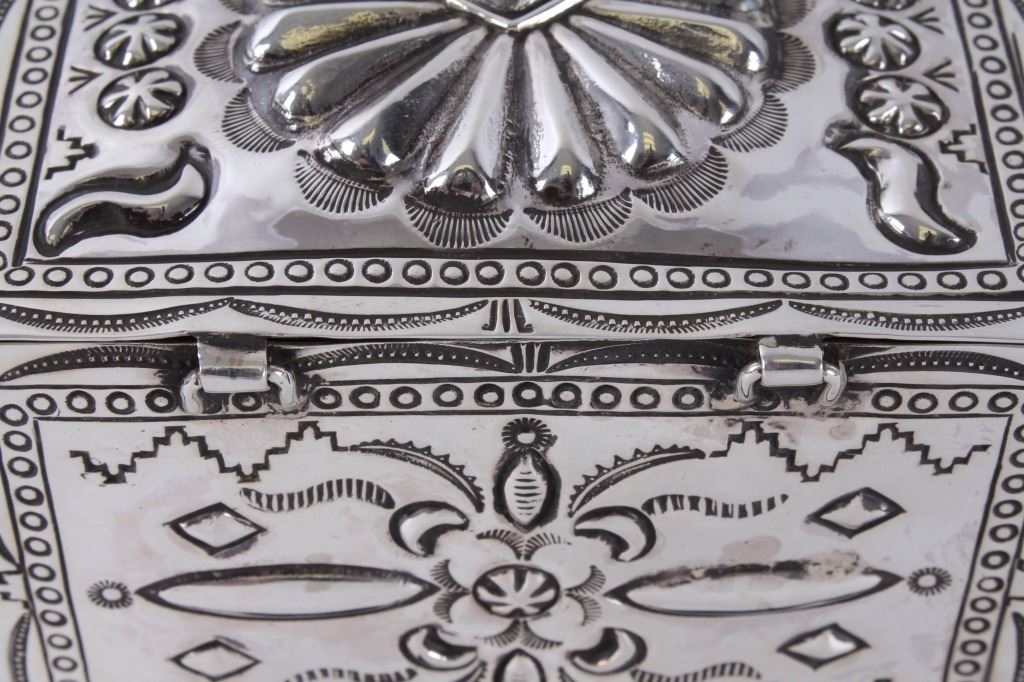 The lot features an outstanding, solid sterling silver box by Randy Begay Jr., a master Navajo Indian silversmith. This is one of only two boxes that Randy Begay Jr. has ever made and is truly a phenomenal, authentic Navajo piece. The box is nicely stamped on the bottom, “RB JR” and “Sterling”, and the piece shows a heavy gauge sterling silver construction with immensely detailed, highly figure repousse (hammered into relief from the reverse side). The box has a hinged lid showing a hinged lock and four small feet. The box has unbelievable detail and is finished with a large repousse, raised tooled center with traditional old pawn tooling. The bottom of the box shows four concho tooled feet. The entire box is in brand new, pristine condition. This is truly only one of two authentic Navajo sterling silver boxes with a fine contemporary age on the market. Measures overall 4 3/8”x3 3/8”x3 1/8”. The box weighs 247.5 grams of sterling silver.