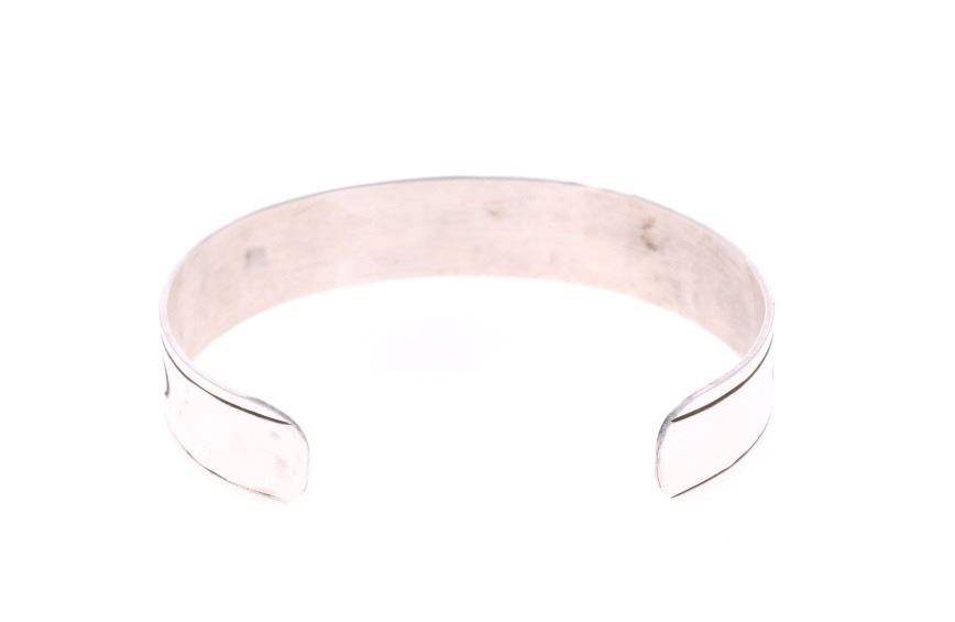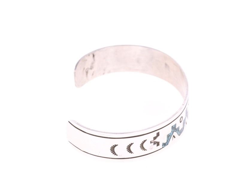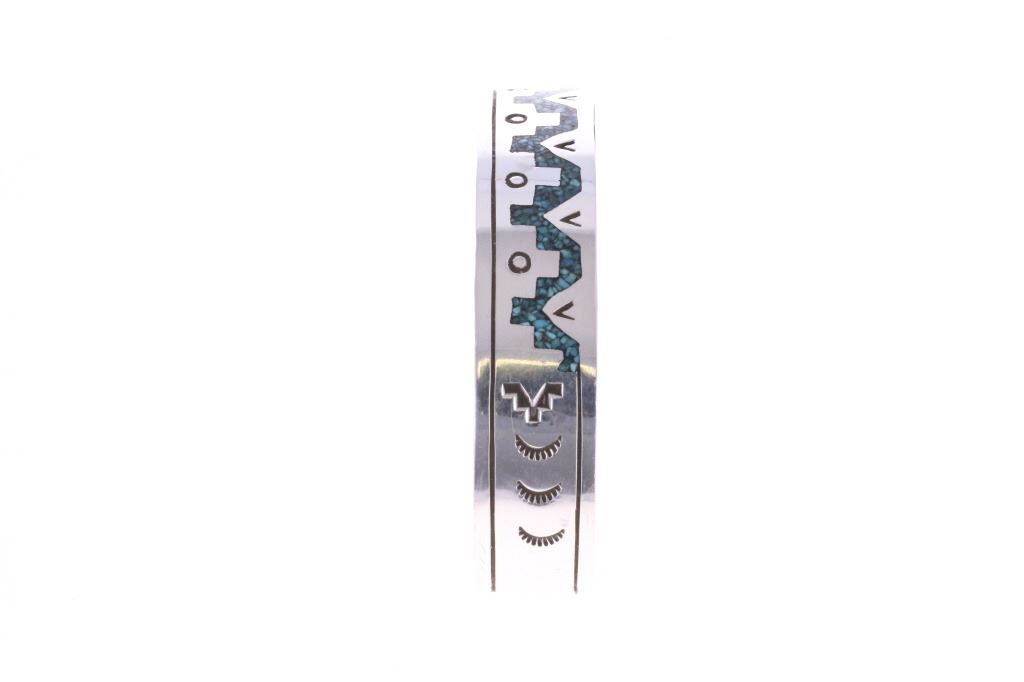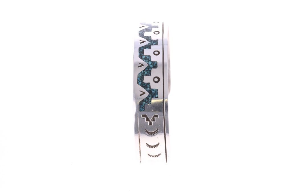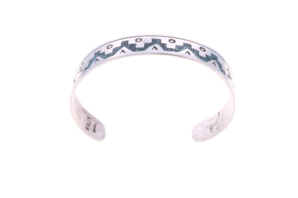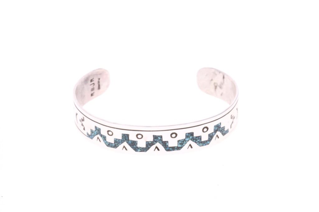 Presented in this lot are Navajo Diné Randy Begay Jr. Sterling Silver Turquoise Chip Inlay Cuff Bracelet. The cuff bracelet features a wonderfully and professionally crafted stamped sterling silver featuring turquoise chip inlay and stamped geometric designs of traditional Navajo cultural symbols. The Begay family includes several prominent Navajo silversmiths renowned for chip inlay work featuring turquoise and coral. Chip inlay, a technique where channels are filled with crushed stone and resin then polished smooth, was popularized in the 1970s and remains a classic Navajo style. Navajo Randy Begay Jr. is a highly respected, master Navajo silversmith, with his distinct hallmark "RBJR Sterling" appearing on collectible pieces like squash blossoms, bracelets, and unique items like a silver-clad knife. He's recognized as a significant contemporary Native American artist whose work is sought after by serious collectors. The artist's hallmark is stamped on the reverse, "RBJR Sterling". The bracelet is in beautiful condition. Measures 6.5" inside circumference including 1.25" opening, .5"W x 2.5"L x 1.75"D, weight is 16oz.