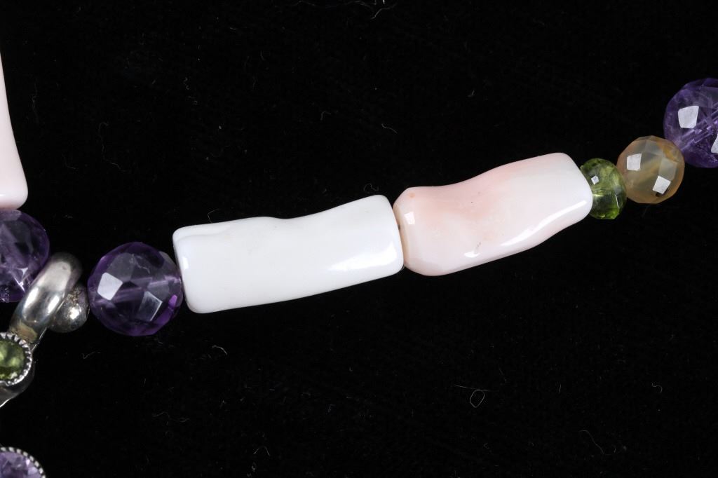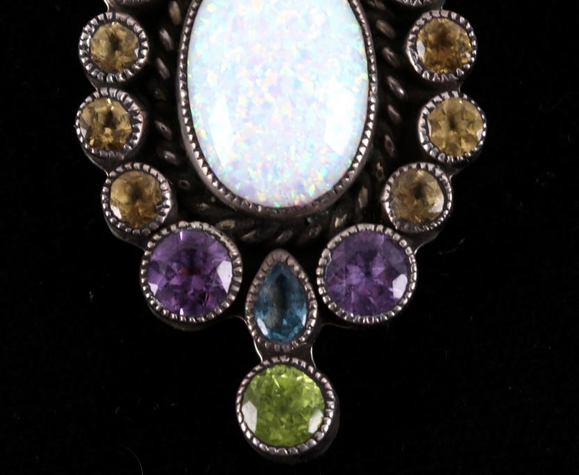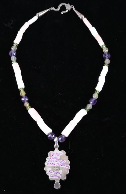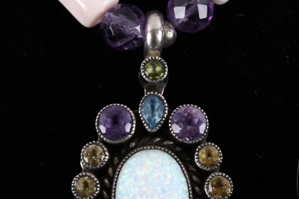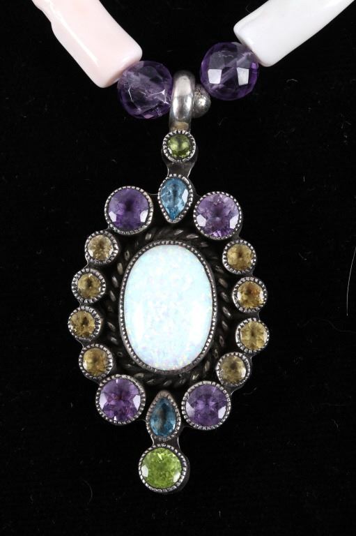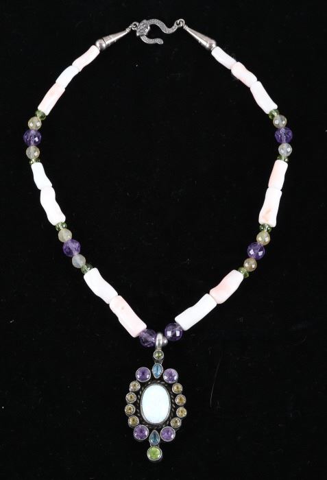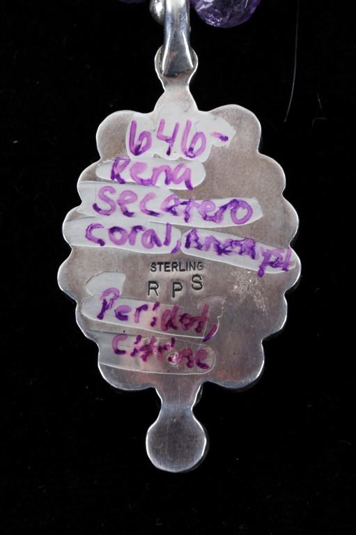 Featured in this lot is this multi stone necklace from Navajo artist Rayna Platero Secatero. The necklace features a wonderfully and professionally crafted sterling silver and multi stone construction that features Angel Cheek Coral, quartz, amethyst, Peridot, and citrine gemstones; along with a central fire opal stone set into the pendant. The necklace is marked 'sterling' on the aglets and on the back of the pendant is marked 'sterling' and 'RPS' for Rayna Platero Secatero. The condition of this necklace is good with no obvious signs of damage and shows good overall condition. The measurements of this necklace from clasp to clasp is 16 3/4" and the pendant measures 2 1/4" x 1 1/8" x 1/4". The collective weight of this necklace is 50.3g.*