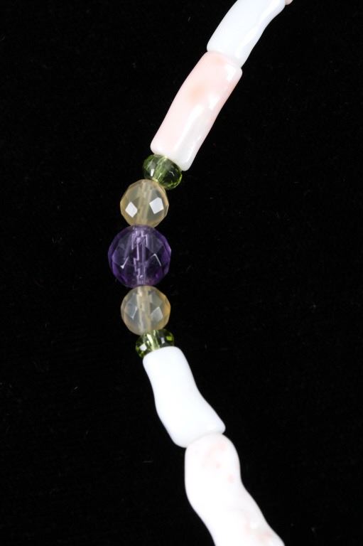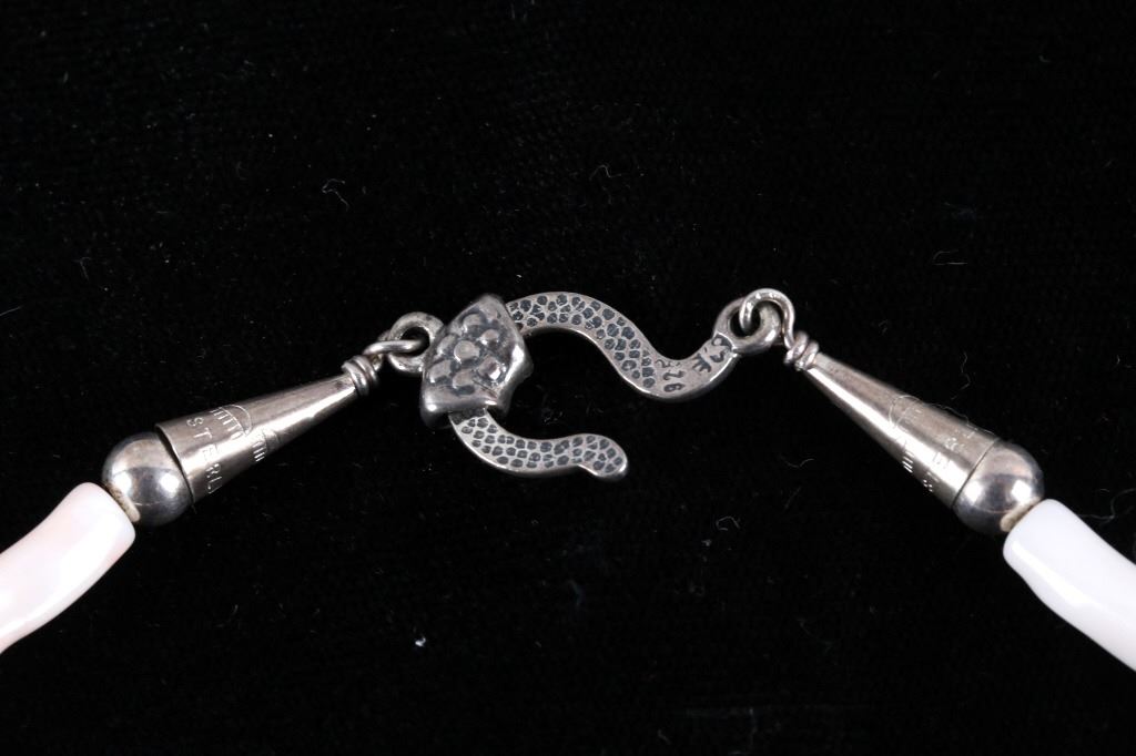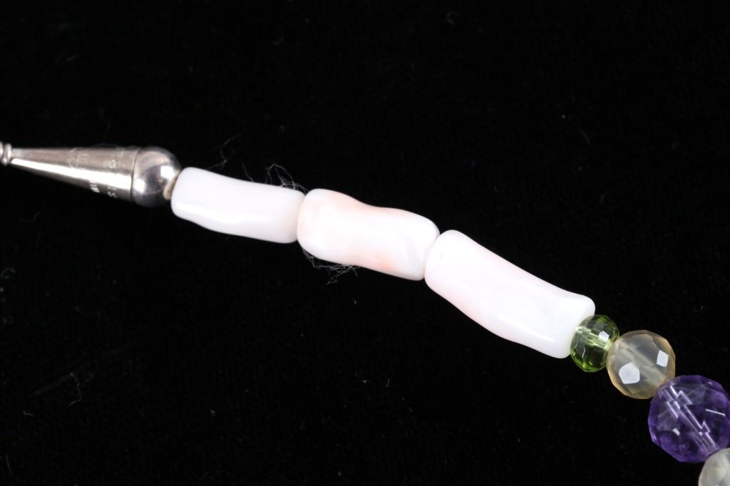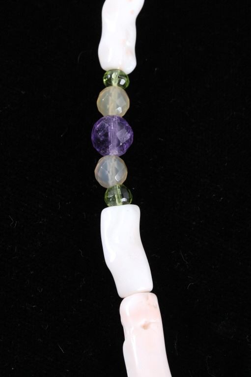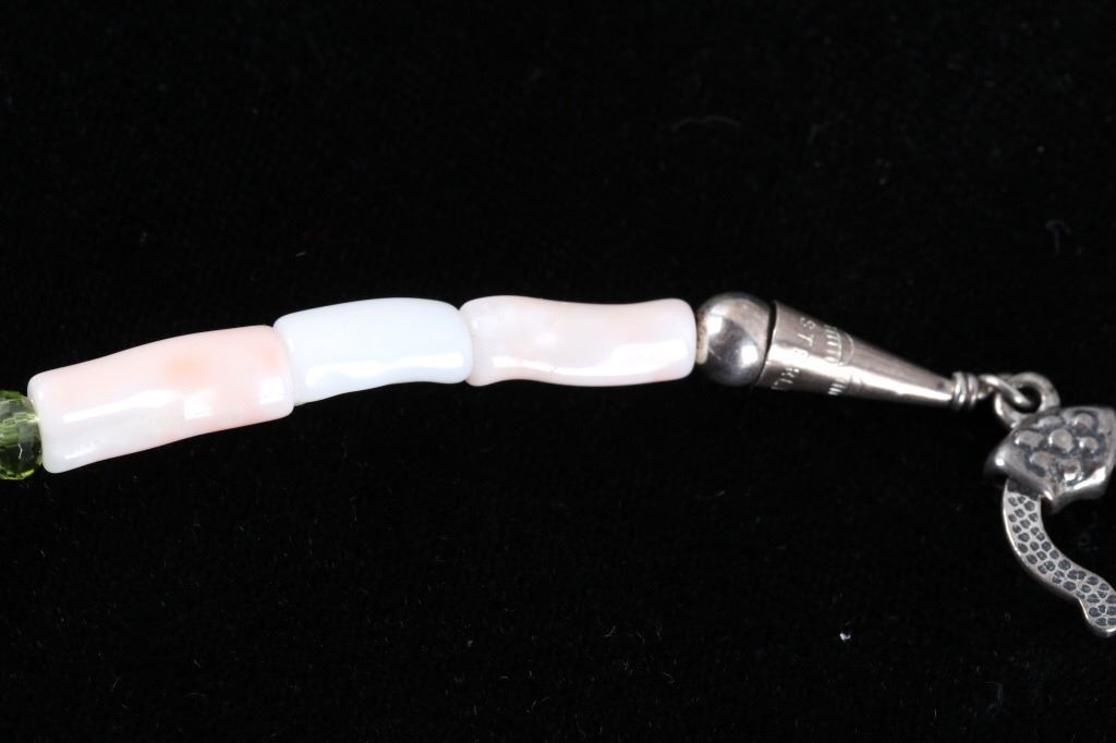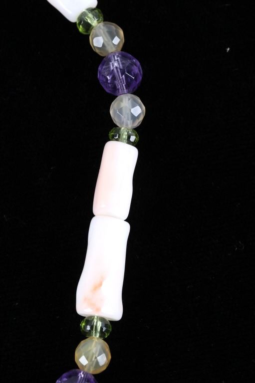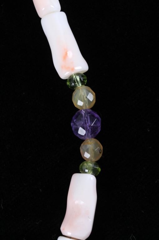 Featured in this lot is this multi stone necklace from Navajo artist Rayna Platero Secatero. The necklace features a wonderfully and professionally crafted sterling silver and multi stone construction that features Angel Cheek Coral, quartz, amethyst, Peridot, and citrine gemstones; along with a central fire opal stone set into the pendant. The necklace is marked 'sterling' on the aglets and on the back of the pendant is marked 'sterling' and 'RPS' for Rayna Platero Secatero. The condition of this necklace is good with no obvious signs of damage and shows good overall condition. The measurements of this necklace from clasp to clasp is 16 3/4" and the pendant measures 2 1/4" x 1 1/8" x 1/4". The collective weight of this necklace is 50.3g.*