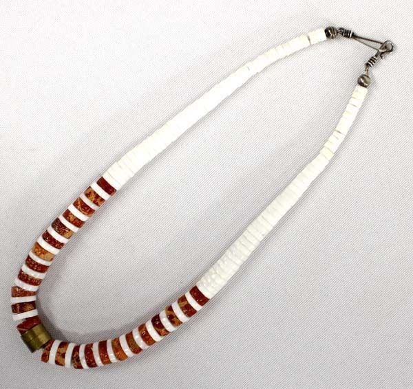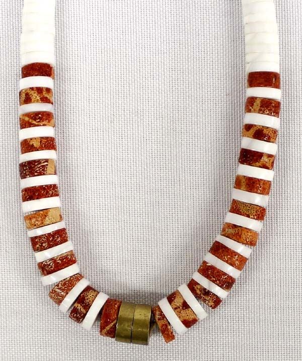 Native American Navajo Red and White Shell Choker Necklace, 2 brass accent beads, measures 14''L end to end
