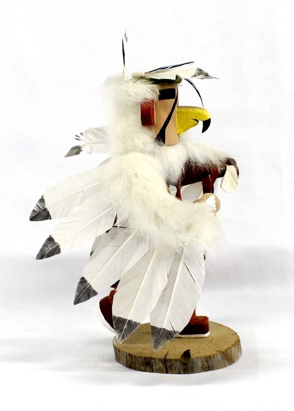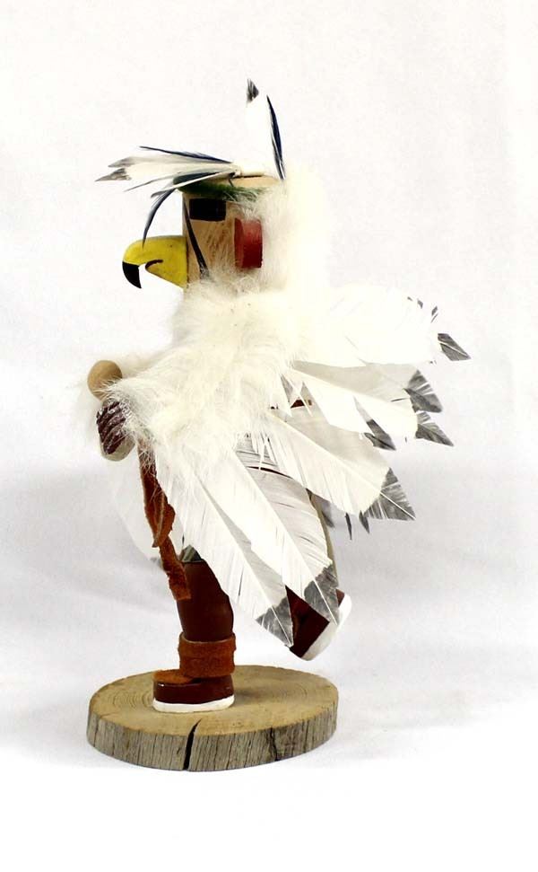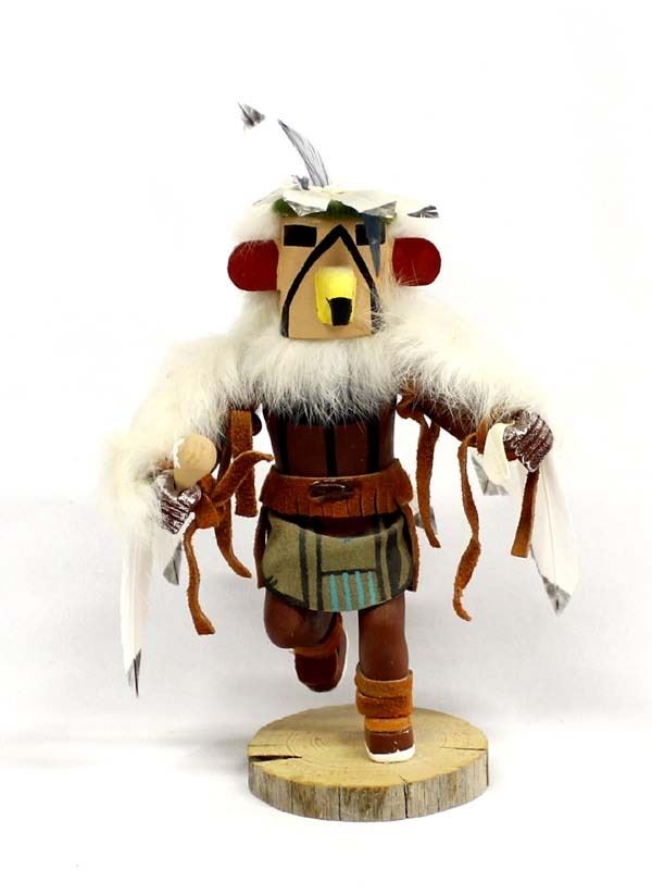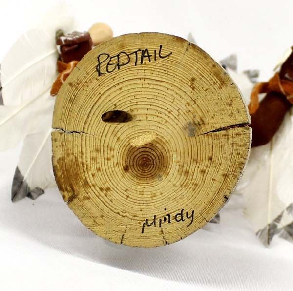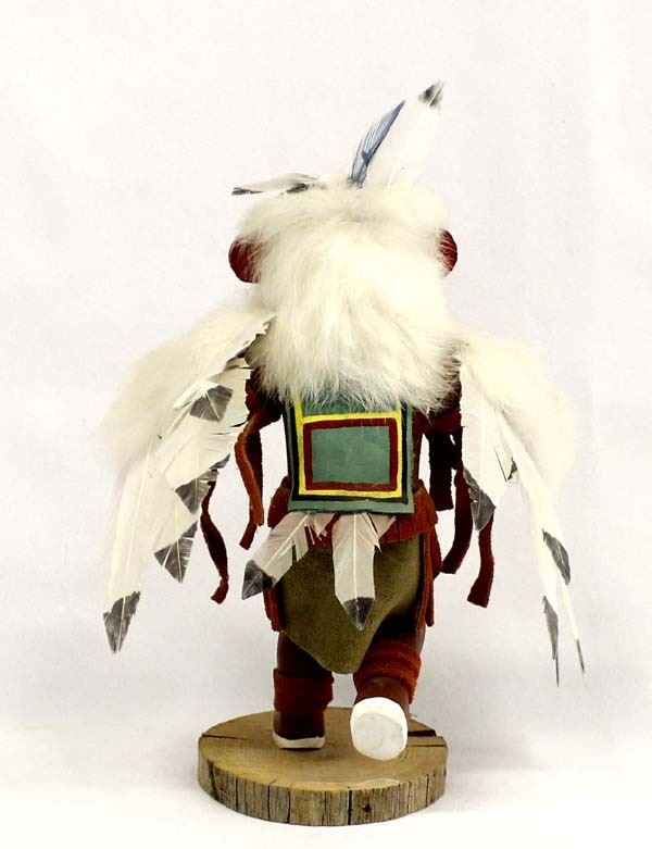 Native American Navajo Redtail Hawk Kachina by Mindy, measures 10'' x 6'', signed on the bottom, embellished with feathers, rabbit fur, and leather