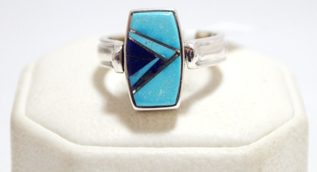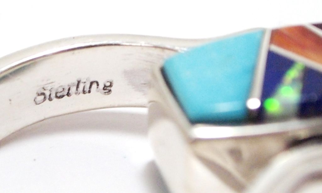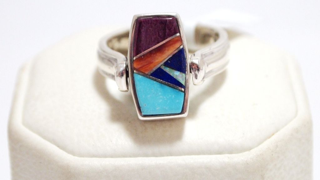 Spinner measures 5/8" tall by 3/8" wide. Size: 6. Stones present: Turquoise, Charoite, Spiny Oyster, Lapis Lazuli, Opal.