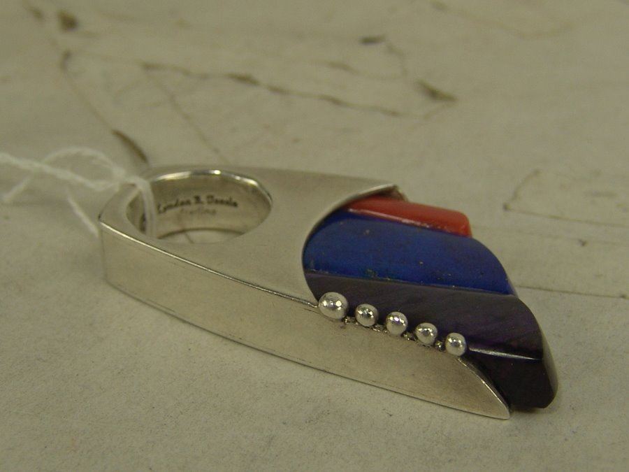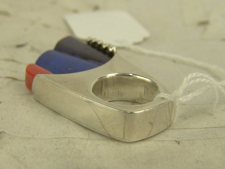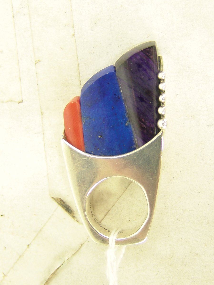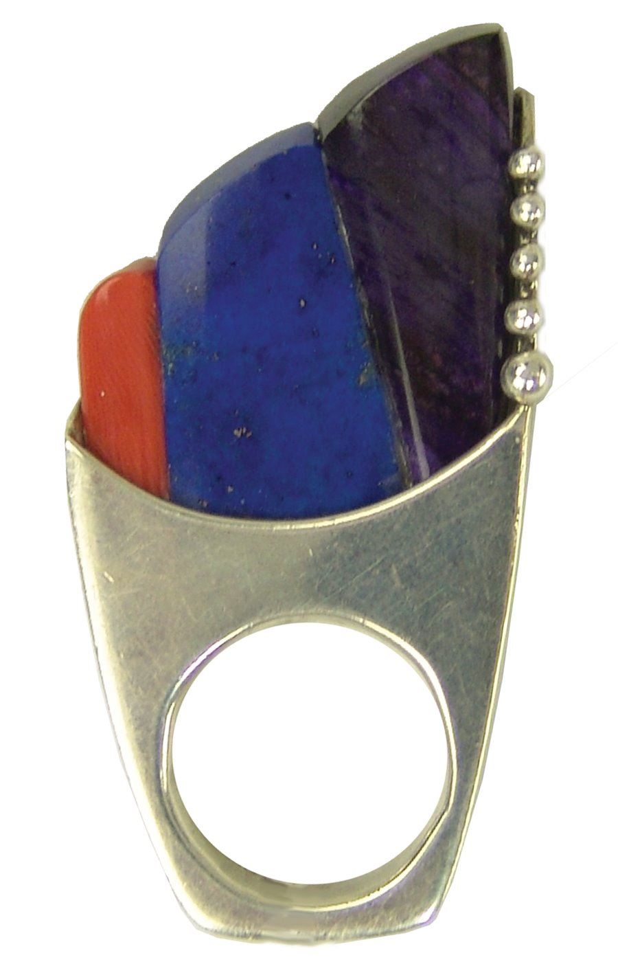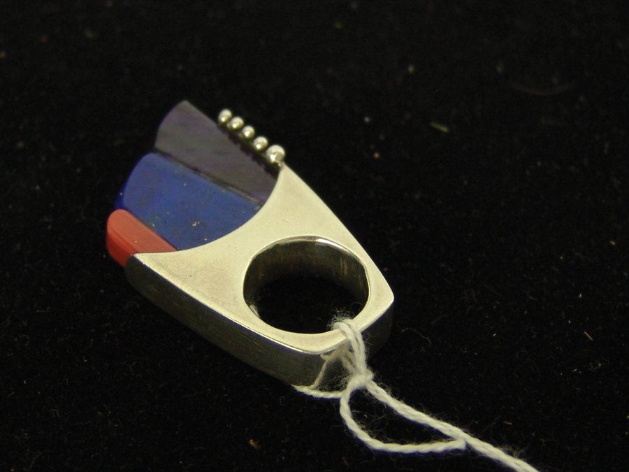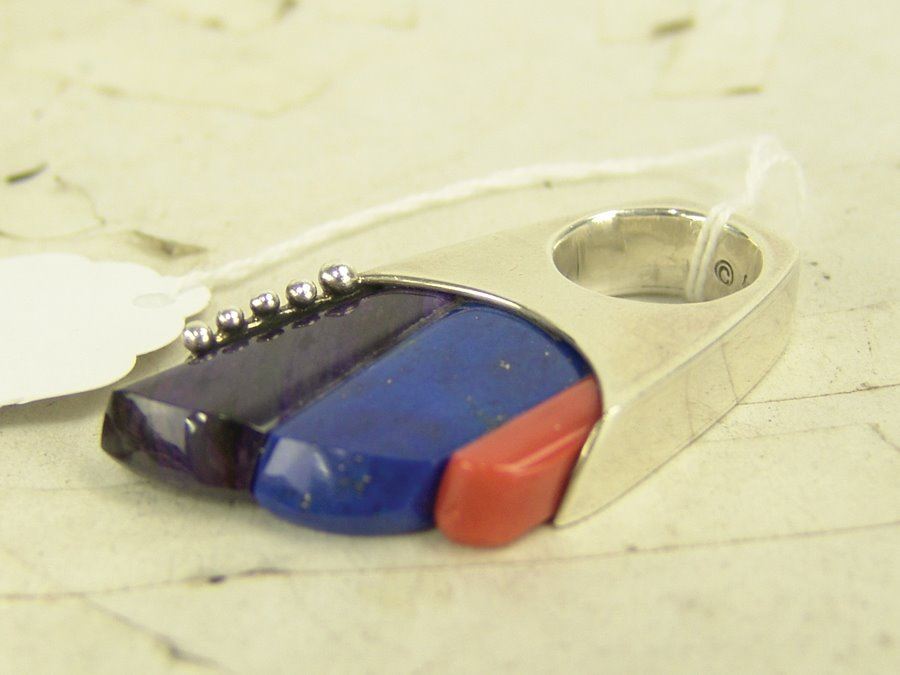 Outstanding, contemporary original design all silver ring with carved insets of coral, lapis, and sugalite, and with simple silver dot accents. This can also be worn as a pendant. Very good condition.,,2-3/8", size 6