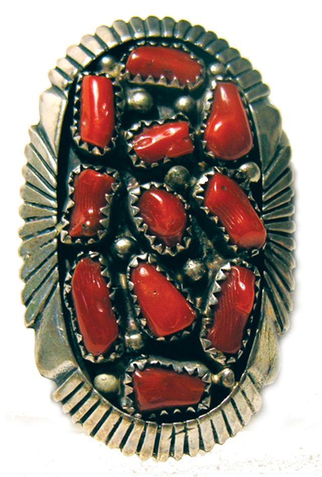 Circa 1970, Beautiful file work silver ring set with 11 oxblood coral cabochons, hallmarked R S. Size 4