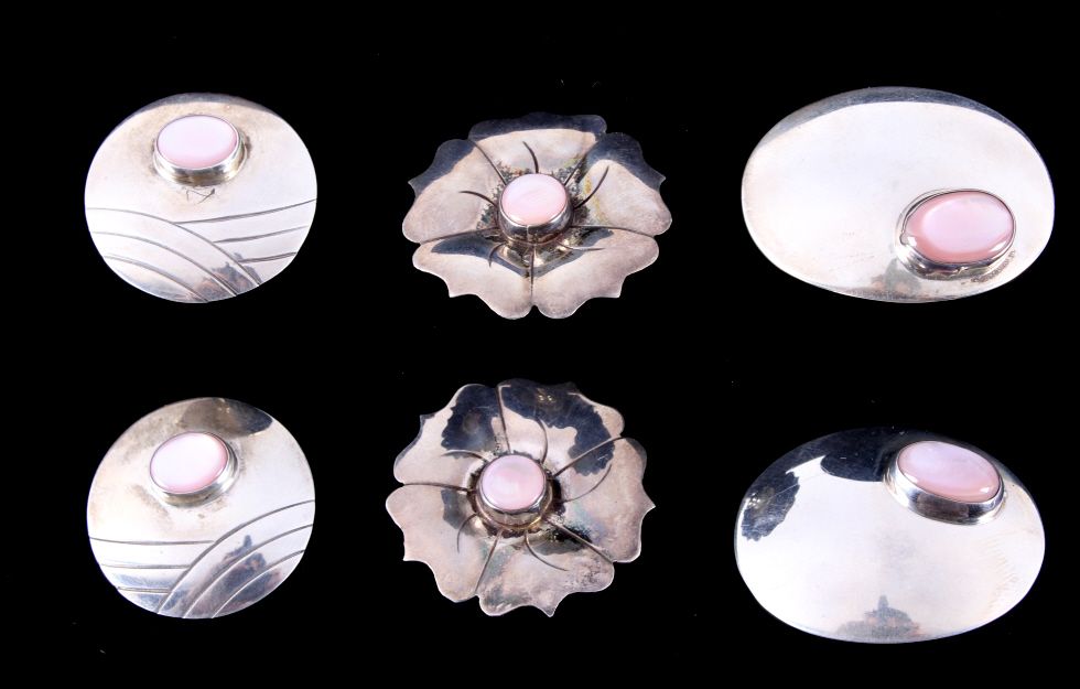 The lot features three sets of hand made  Navajo Native American Indian earrings. All  three sets have beautiful rose quartz set  stones with unique sterling silver design.  Each set of these are marked Sterling. Largest measures 1.25"x1.5"