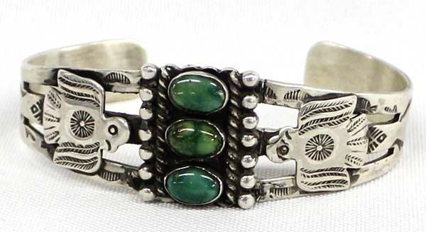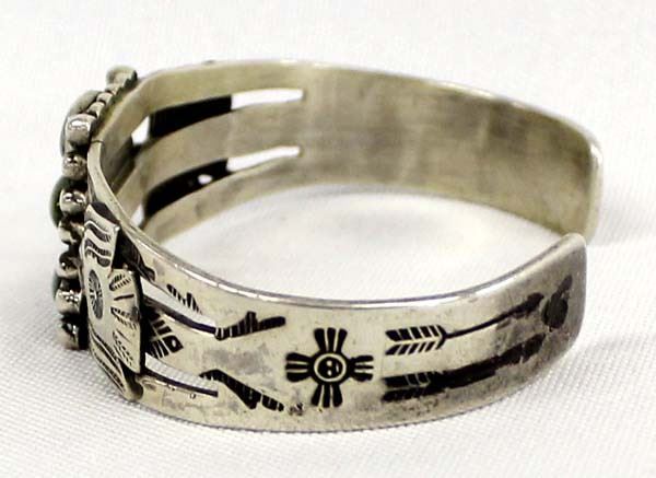 1930-1940's Native American Navajo Route 66 Sterling Turquoise Bracelet, inside measures 6'' which includes the opening x .75'', gorgeous dark green cabochons (3/8'' x .25''), thunderbird embellishments along with hand stamped directional symbols and arrows, the band has been repaired