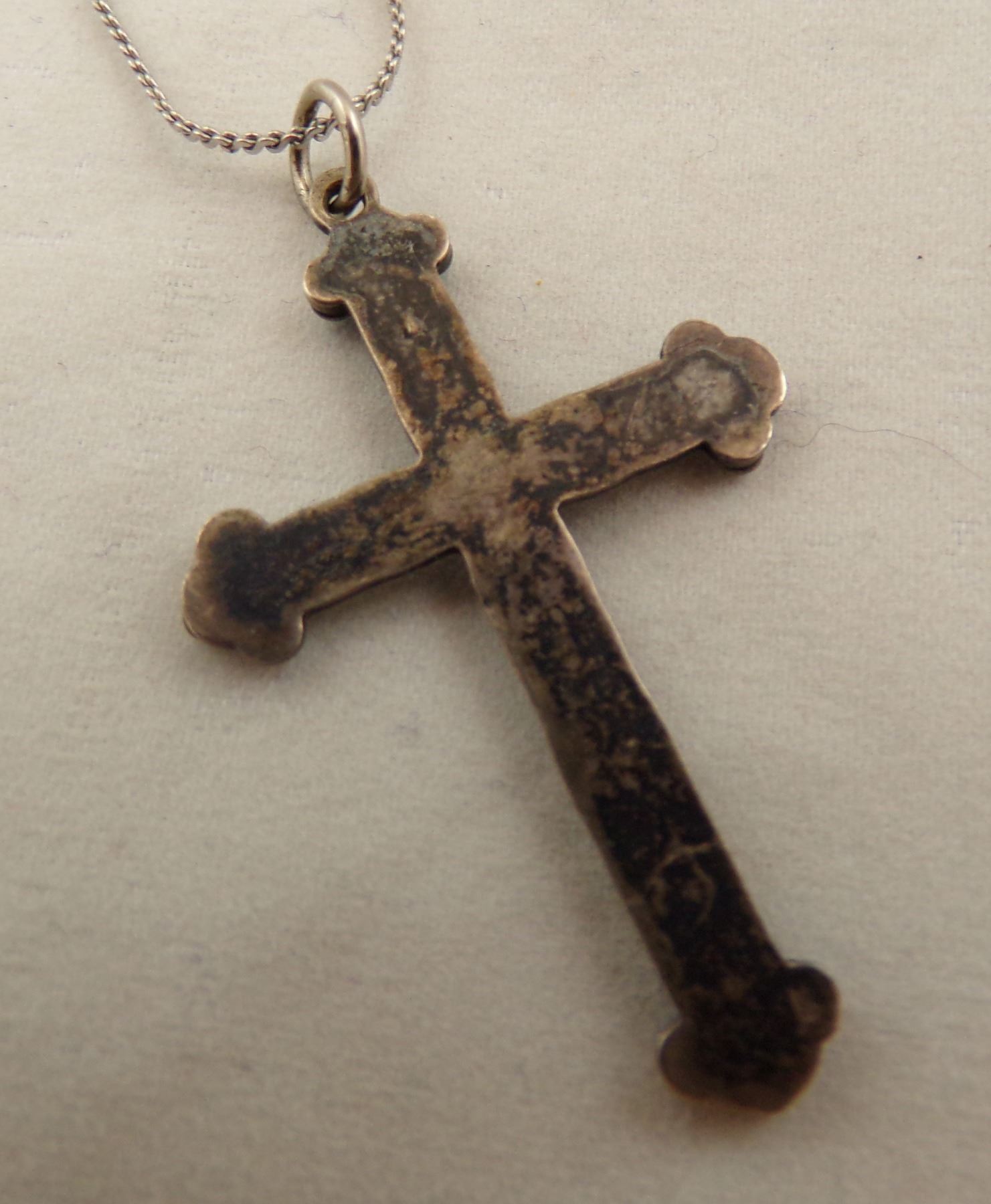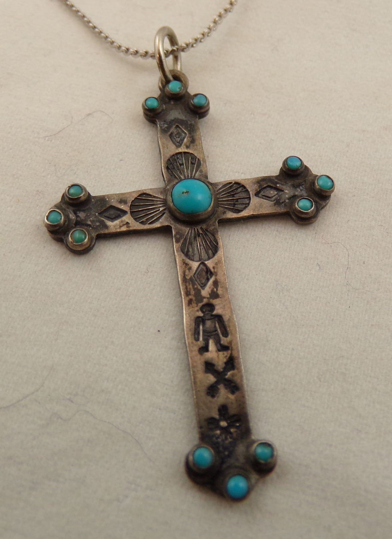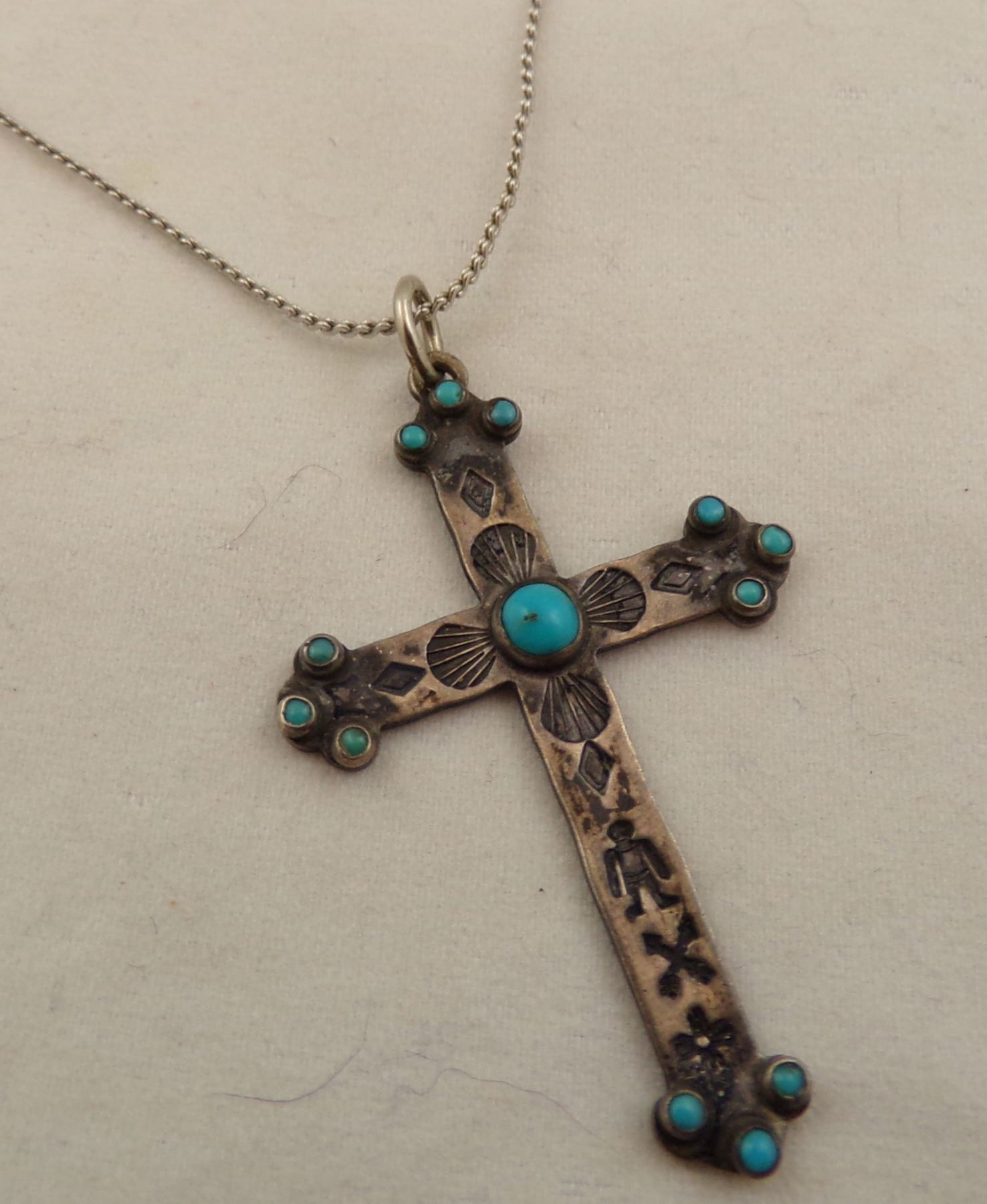 Vintage Native American Navajo Route 66 Sterling Turquoise Cross Pendant Necklace, pendant measures 2''L x 1.25''W, Route 66 stamped details, chain measures 18''L end to end