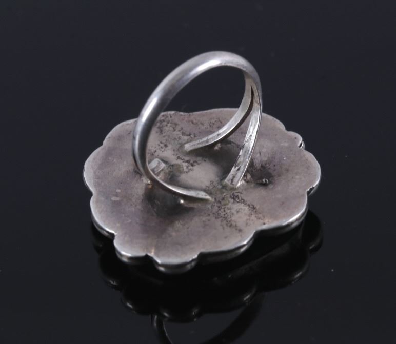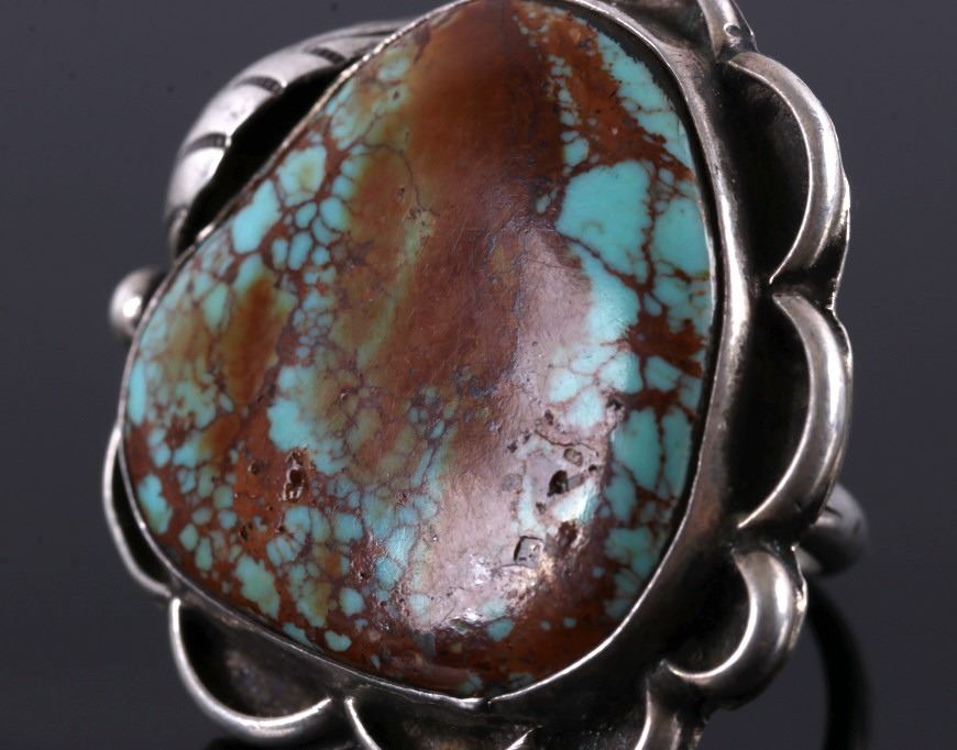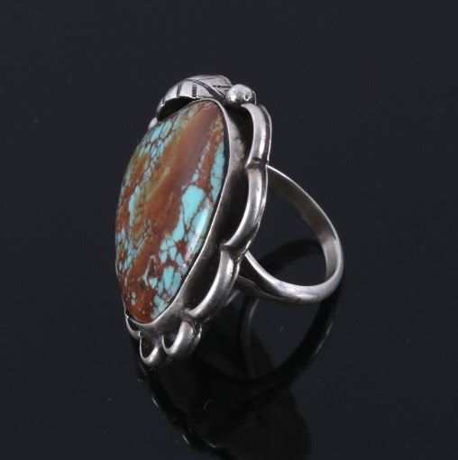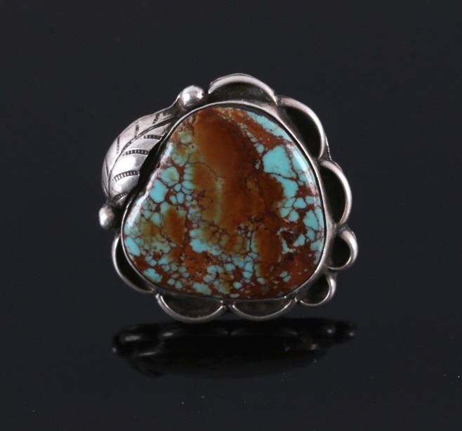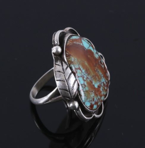 Up for bidding is a Navajo Native American Royston Turquoise silver ring. This ring features a lovely Royston Turquoise cabochon with a detailed silver feather. The ring measures a US size 5 1/2".