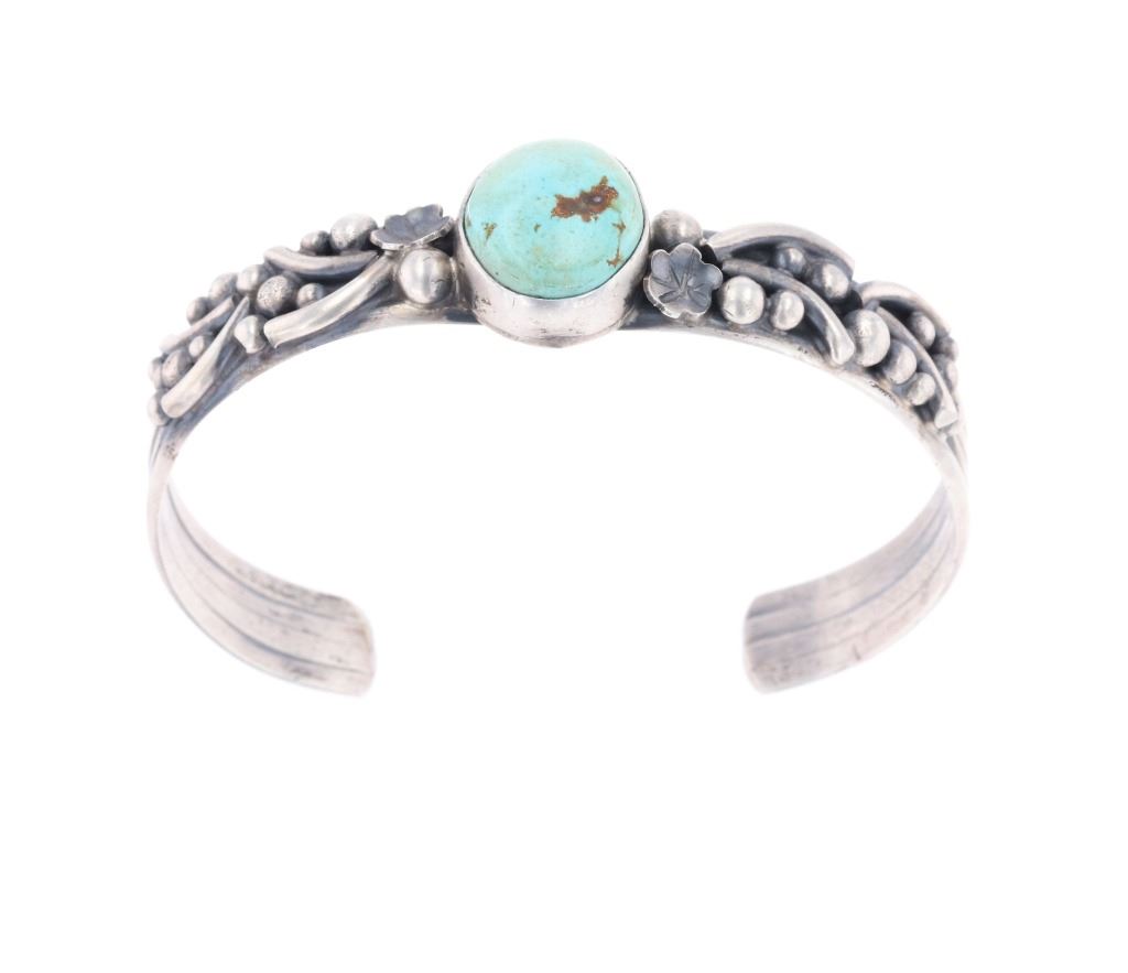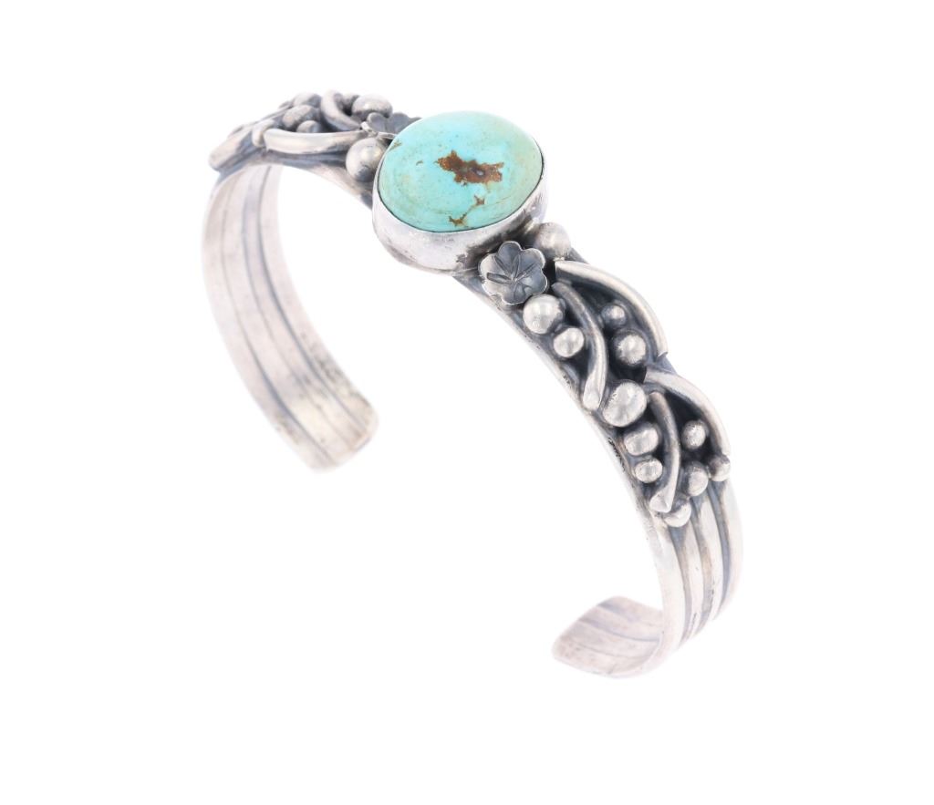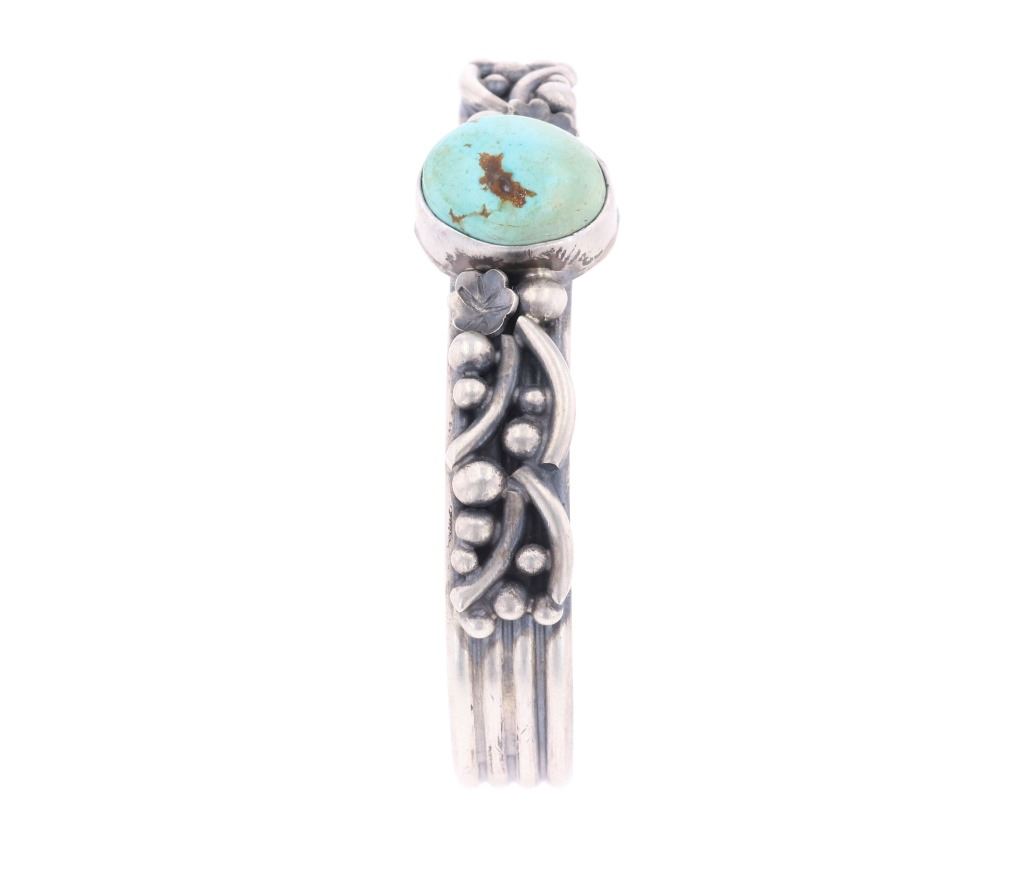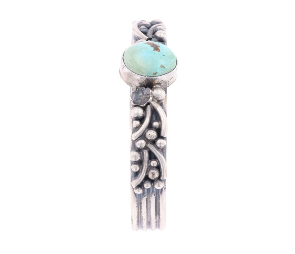 Featured in this lot is this sterling silver and Royston turquoise bracelet from Navajo artist Betta Lee. The bracelet features a wonderful and professionally crafted sterling silver construction with inlaid silver beads, floral decoration, and intertwining vines. The bracelet boasts a medium size, round Royston turquoise cabochon set as the center stone. The artist’s hallmark can be seen on the underside of the bracelet next to a 'sterling' stamp. The condition of this bracelet is good, with no obvious signs of damage. The measurements of this bracelet are 2 1/4" x 2 5/8" x 3/4" and the circumference is 5". The collective weight of the bracelet is 29.3g.