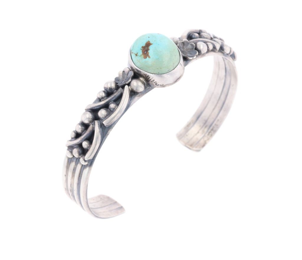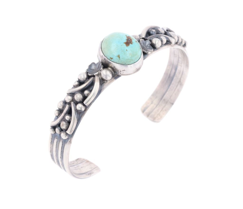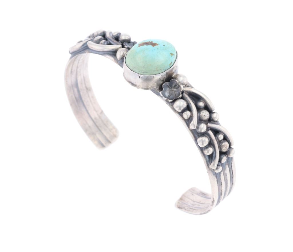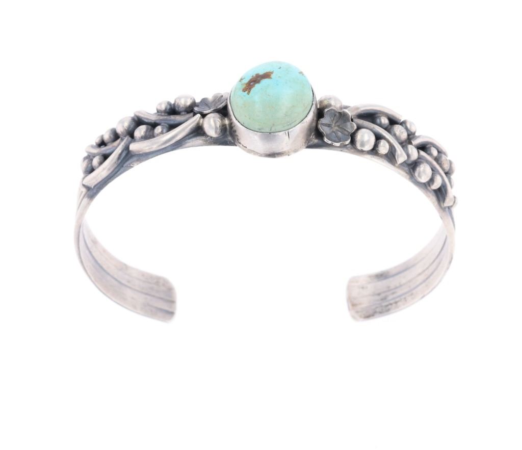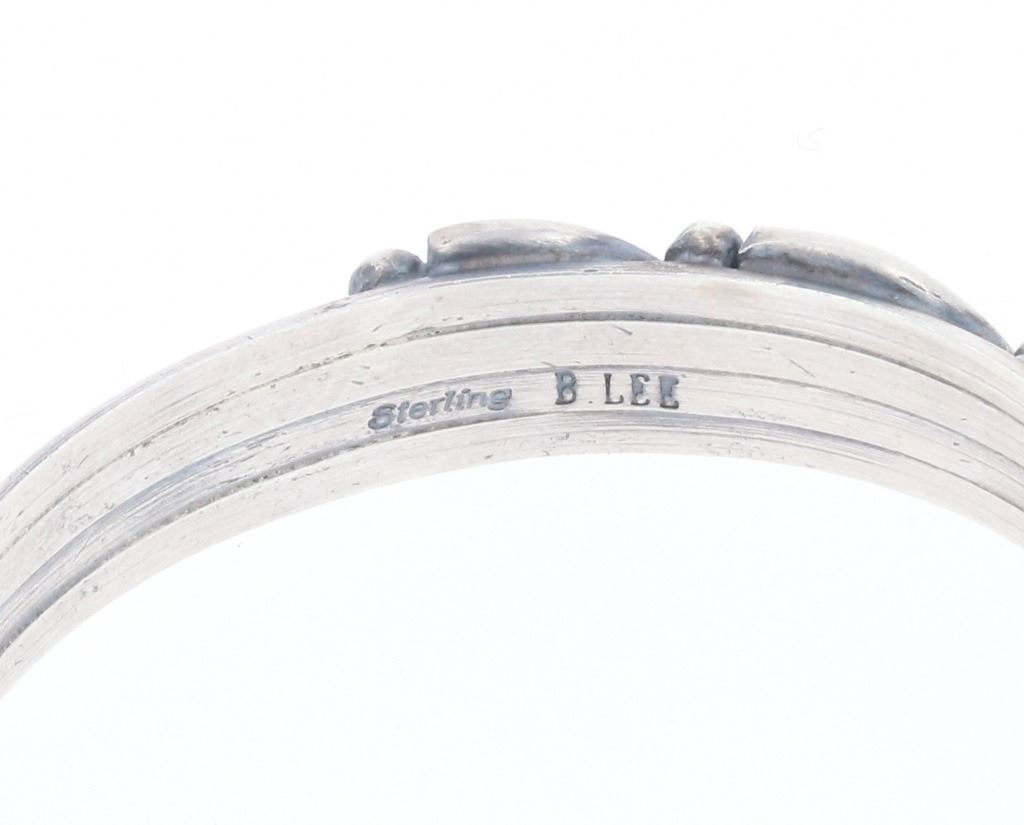 Featured in this lot is this sterling silver and Royston turquoise bracelet from Navajo artist Betta Lee. The bracelet features a wonderful and professionally crafted sterling silver construction with inlaid silver beads, floral decoration, and intertwining vines. The bracelet boasts a medium size, round Royston turquoise cabochon set as the center stone. The artist’s hallmark can be seen on the underside of the bracelet next to a 'sterling' stamp. The condition of this bracelet is good, with no obvious signs of damage. The measurements of this bracelet are 2 1/4" x 2 5/8" x 3/4" and the circumference is 5". The collective weight of the bracelet is 29.3g.