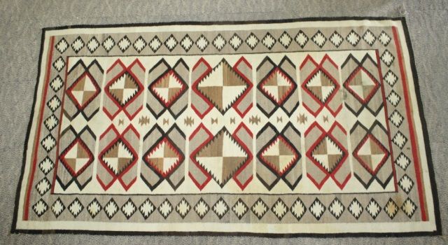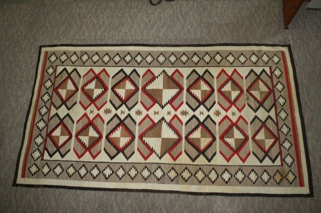 54 1/2" X 98" in excellent condition. A stunning old Navajo weaving in a large size.
