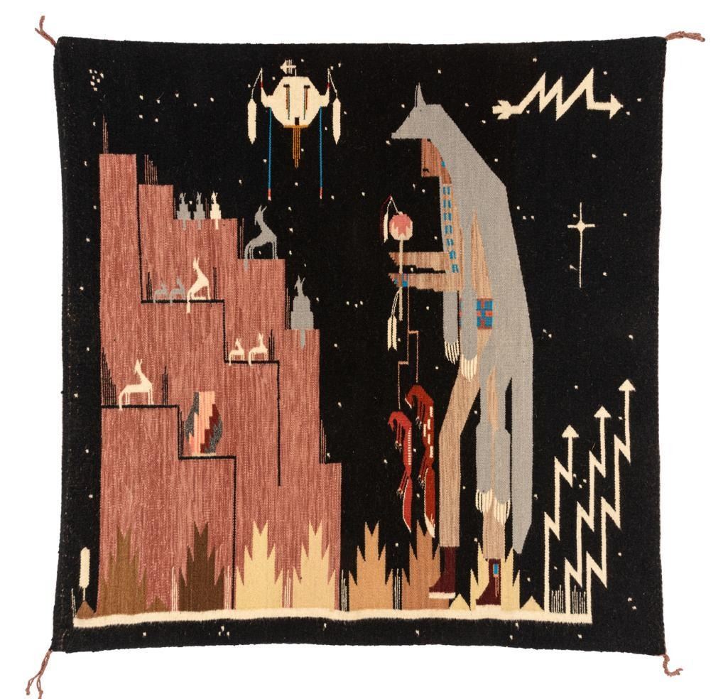 4' x 4' square weaving with a single figure plus numerous animal and arrow design elements. Woven by Margaret Cody. Contemporary.
