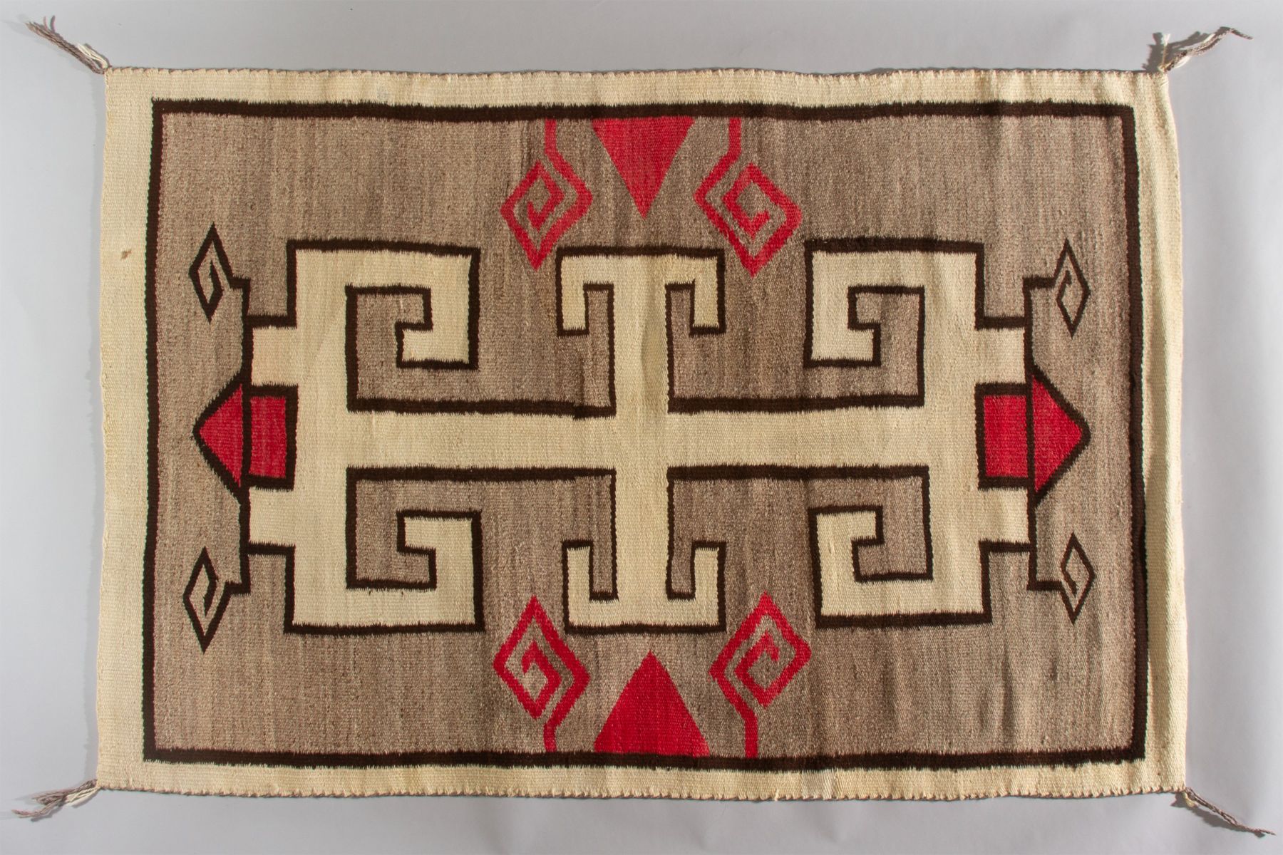 Bold designed antique Navajo rug with interesting red and black spiral motifs surrounding a large, hooked medallion on a field hand-carded, variegated grayish brown, Ca. 1915-1925. Hand woven from all Native handspun and hand-dyed, smooth, long staple Churro cross sheep wool on a wool warp..