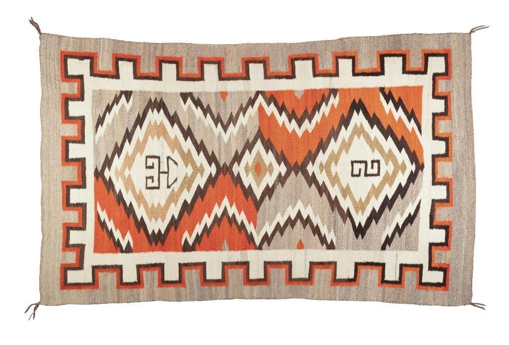 5'9" x 4'. J.B. Moore Crystal area weaving with pictures of brands in two central medallions. Woven with Churro sheep wool. Circa 1900.
