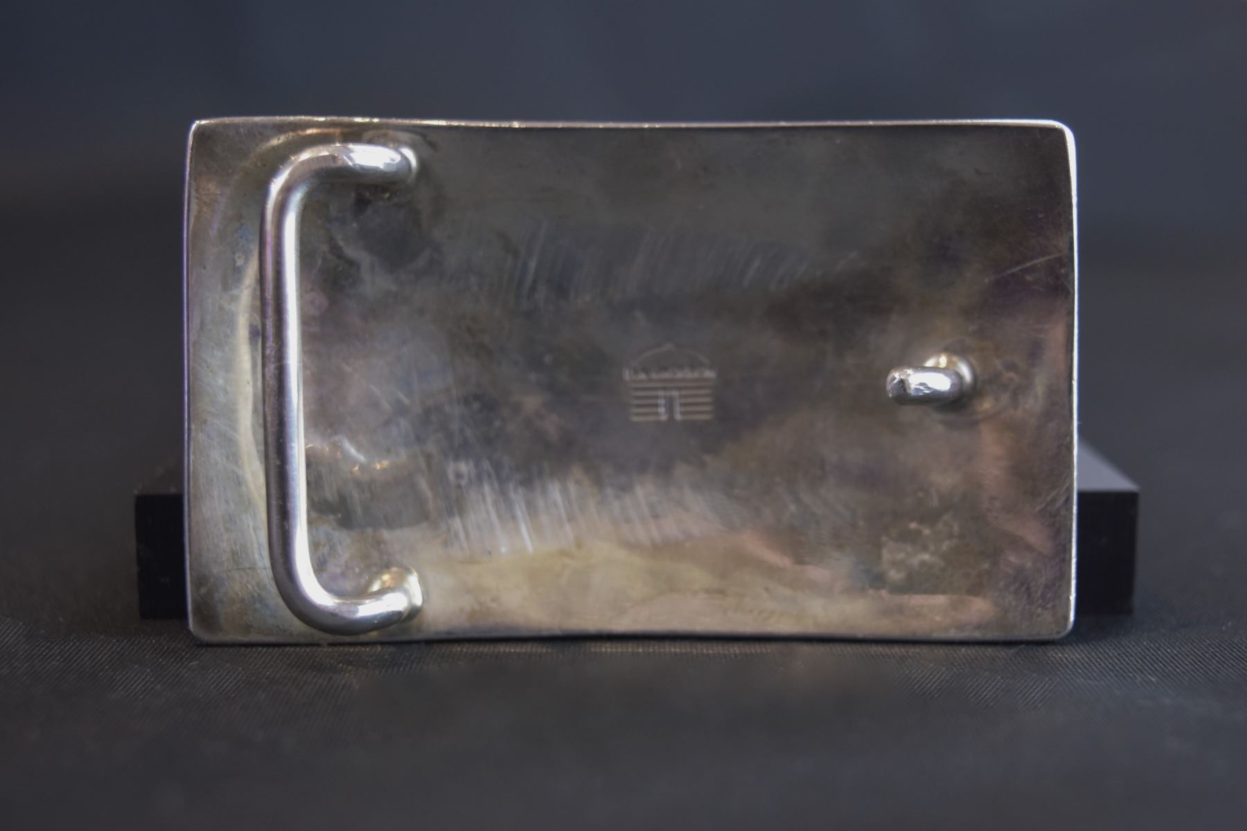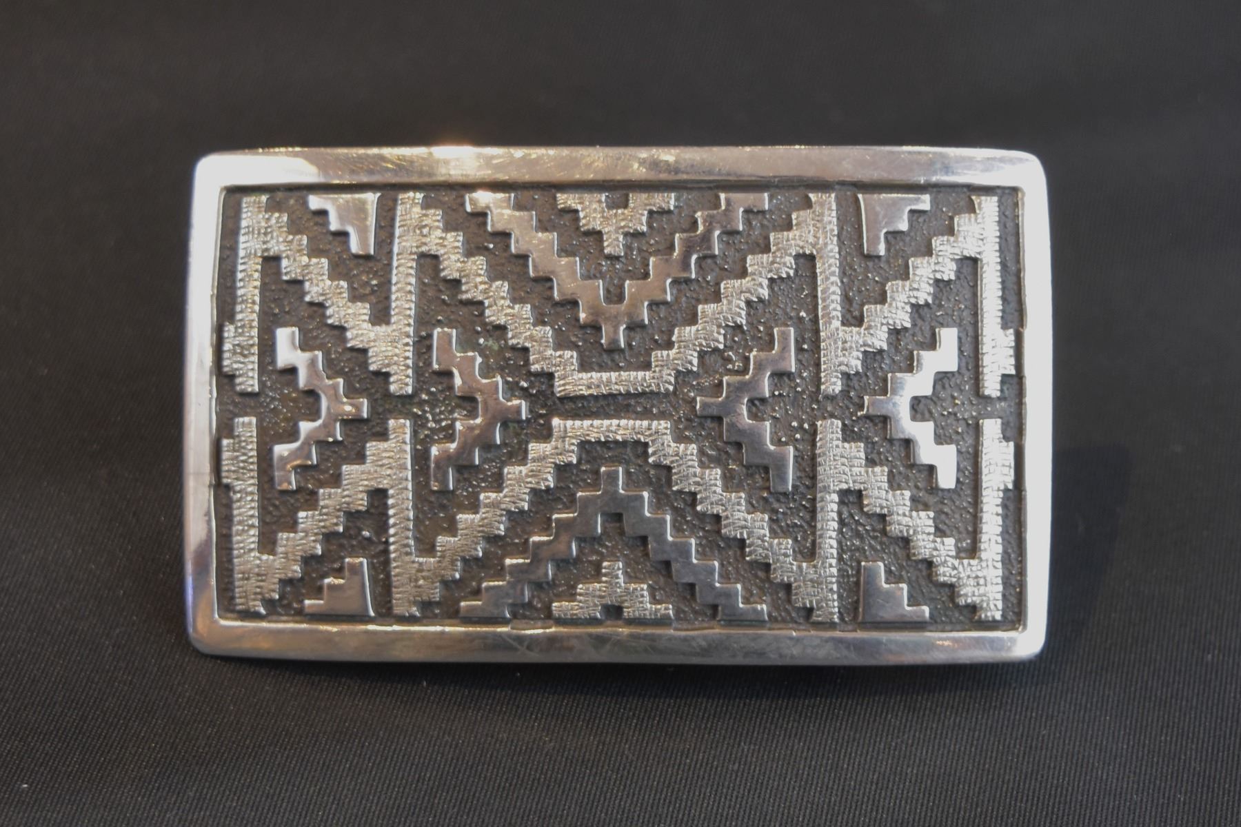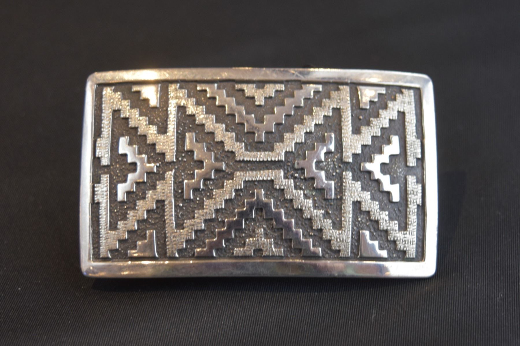 By award-winning Navaho artist Dan Jackson, whose mother was Bernice Charlie, a fine weaver who inspired his design. (See also matching bracelet and bolo tie.) Buckle: 3" W, 1 3/4" H, 49 grams