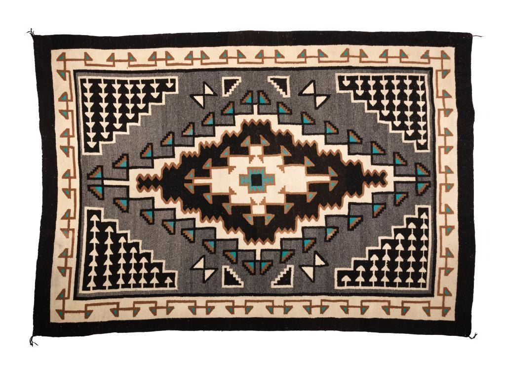 7'5" x 5'2" Two Grey Hills weaving woven from all Native handspun and hand dyed Churro cross and Merino sheep wools with hard to find blue accents. Blue was used in the Two Grey Hills region only in the 1950s era. Classic Two Grey Hills motifs are used throughout in this piece. Circa 1950.