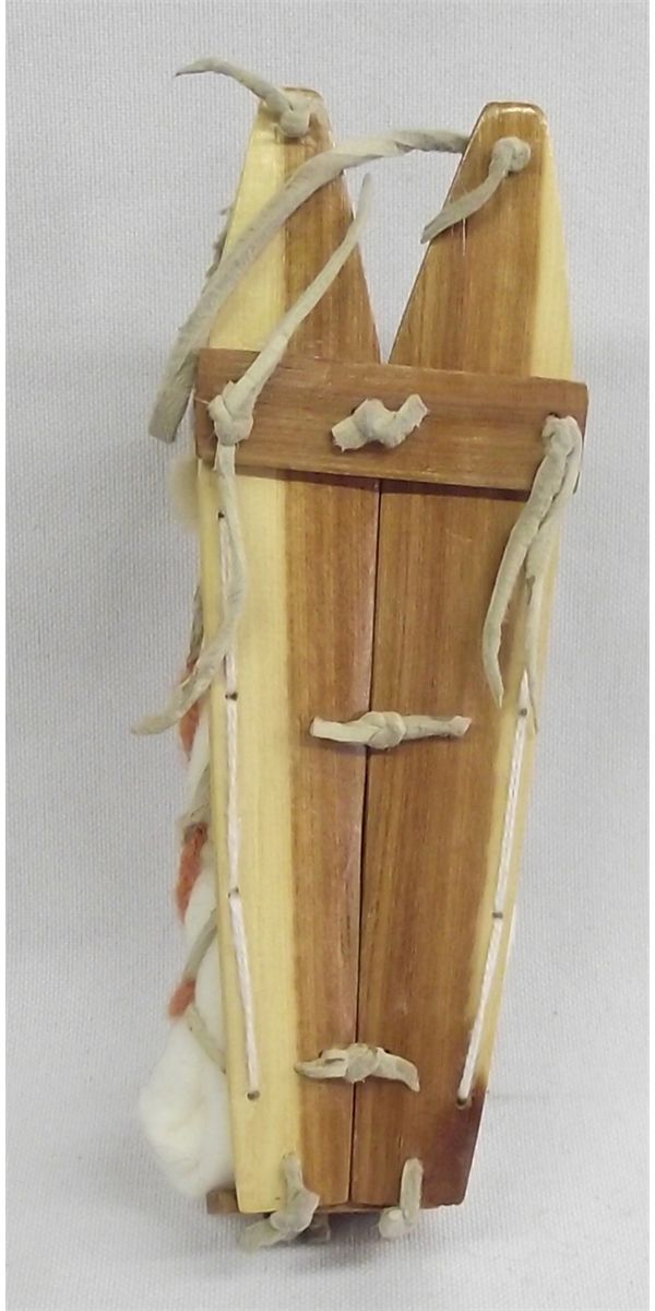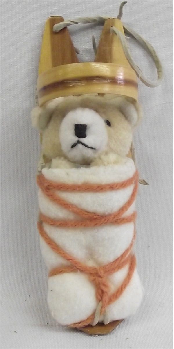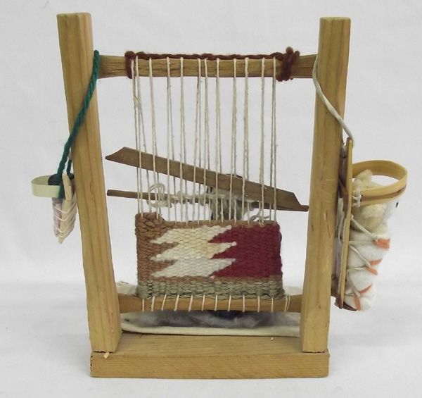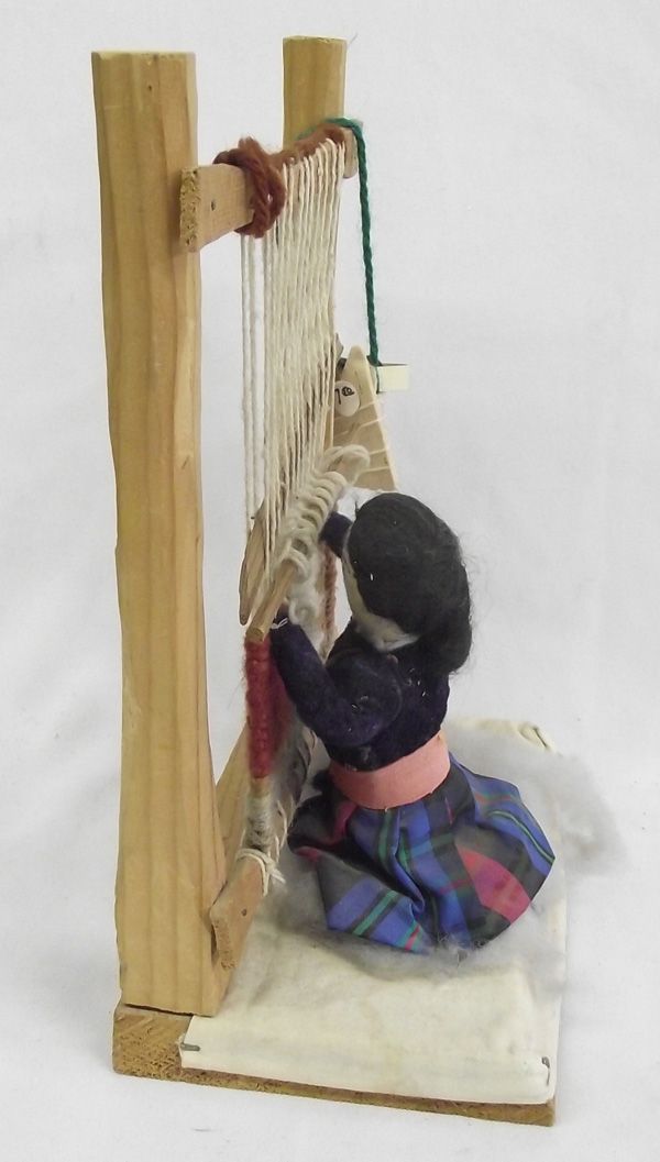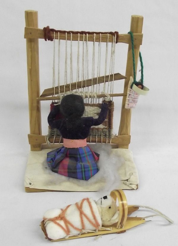Navajo Rug Weaver Doll. 10''H x 8.5'' W. This doll is set up very much like a Navajo rug weaver would work at her loom. The cradleboard to her left has a small bear, probably a child's toy. The setup of the loom is very authentic.