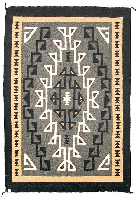 Circa 1970s, Very fine weave earthtone Two Gray Hills rug with crisp geometric designs. Very good condition. 28" x 35" From the Millican Collection.