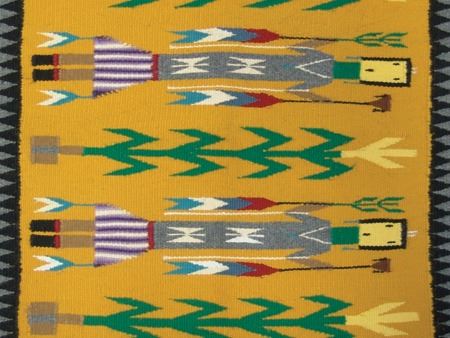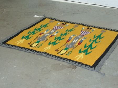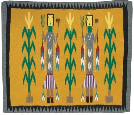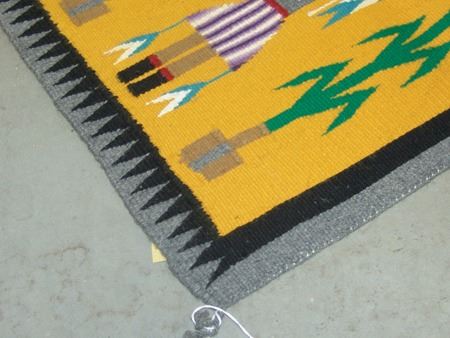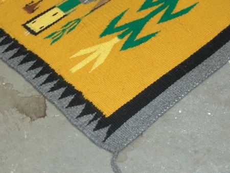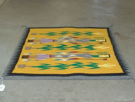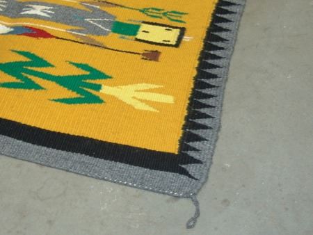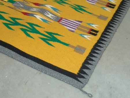 Late 1900s, Unique fine weave Yei figured rug with serrated edges and bright maize field. Excellent condition. 27" x 24"