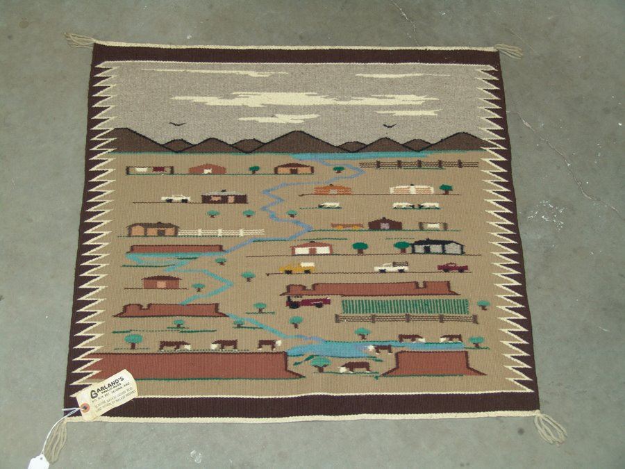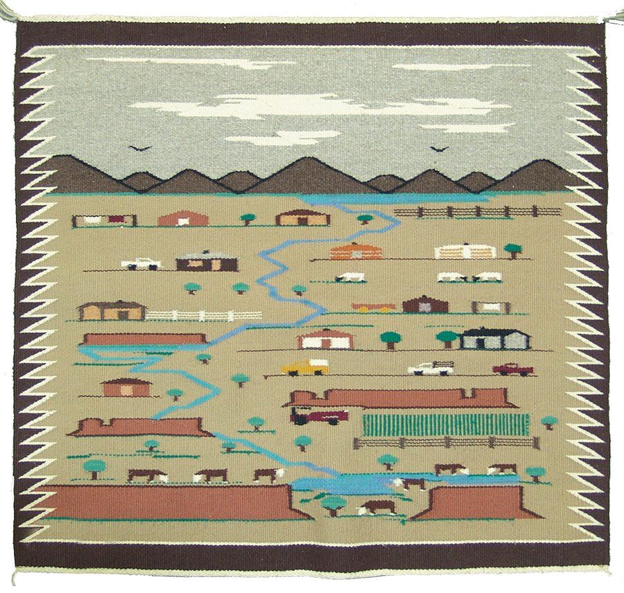 Very fine weave Navajo land pictorial with hogans, mesas, cattle, sheep, cars, trucks, trees, houses, and more. A wonderful example in excellent condition.,Ca. 1980s,29" x 27"