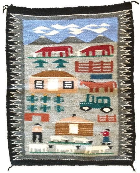 Ca. 1990s, Small fine weave Navajo pictorial with buildings, humans, cows, sheep, and corn plants, plus a tractor, horse, fence, and trees - Navajoland with all its elements. Very good condition. From Many Farms, Arizona. 26" x 21"