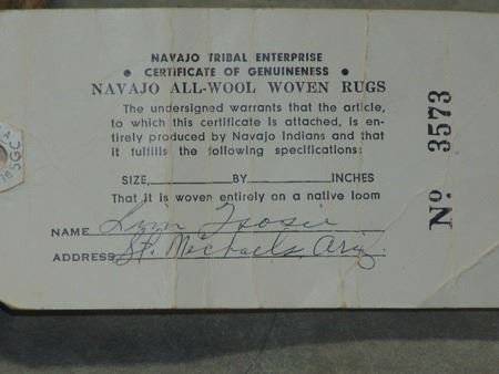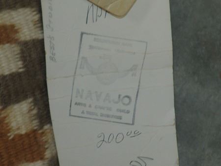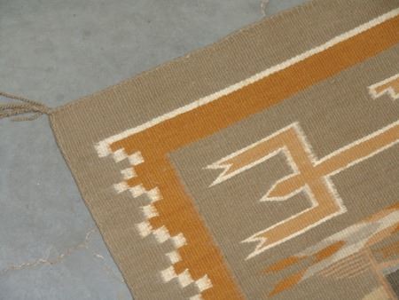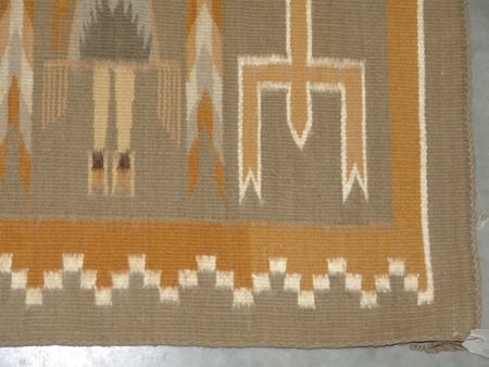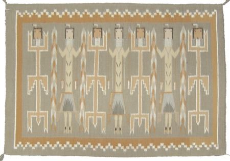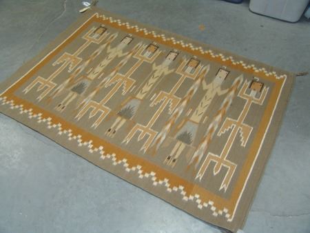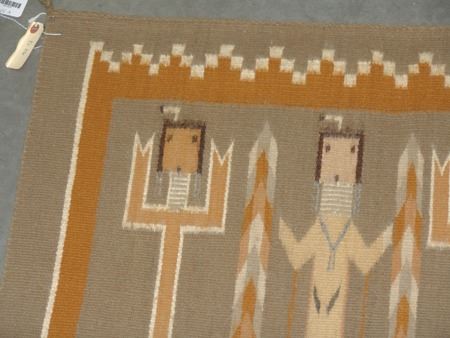 Ca. 1980s, Beautiful fine weave multi figure Yei rug with geometric border done in beautiful natural earth tone colors. Very good condition. With Navajo Arts and Crafts Skilled stamp. 52" x 36"