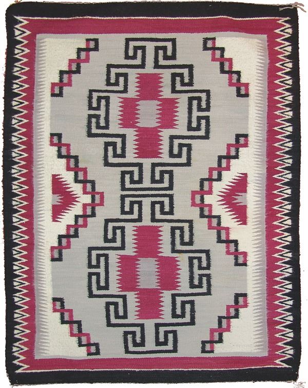 Ca. 1960-1970s 48" x 38" Fine weave regional rug with key type outlined diamonds, and saw tooth edging, and with original Kayenta Trading Post tag. Very good condition.