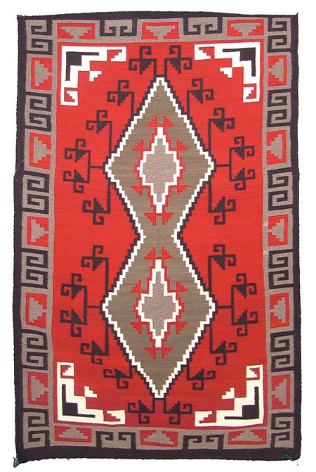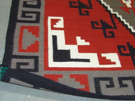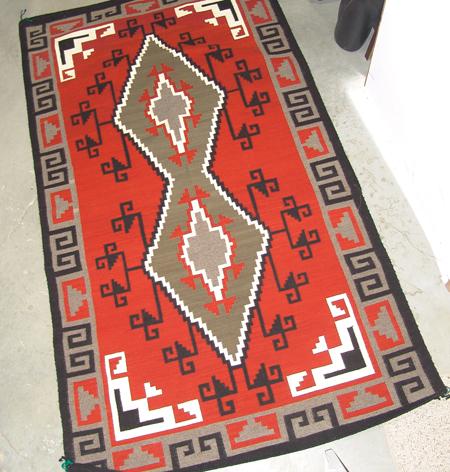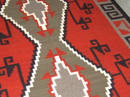 Fantastic large fine weave crystal rug with deep red center, hooks, and key design border. Condition: excellent. 48" x 85"