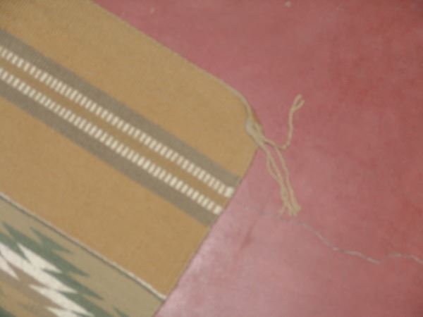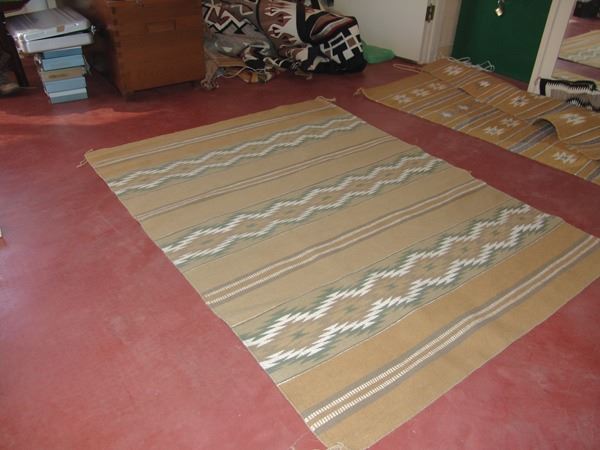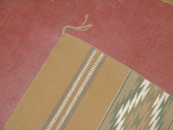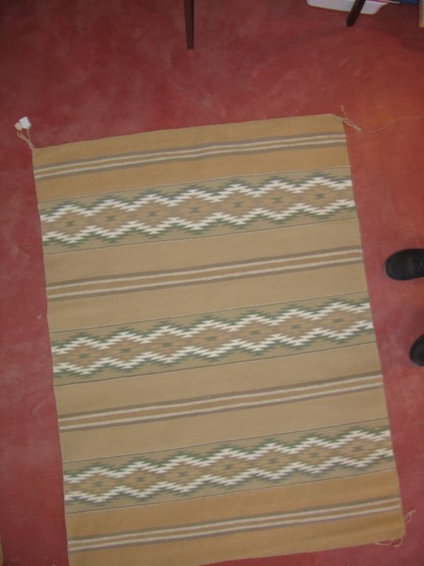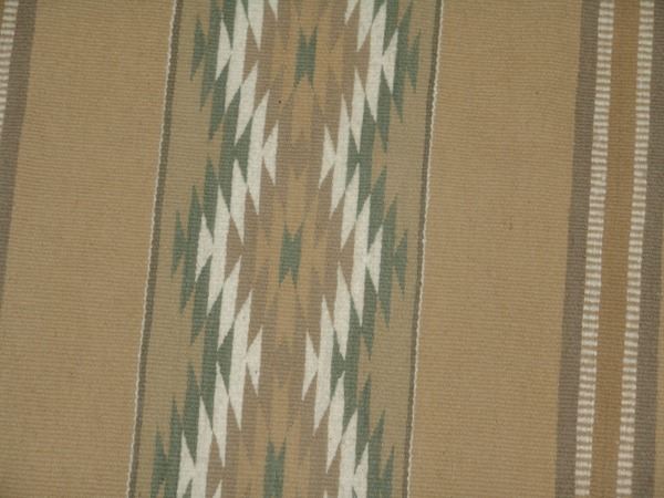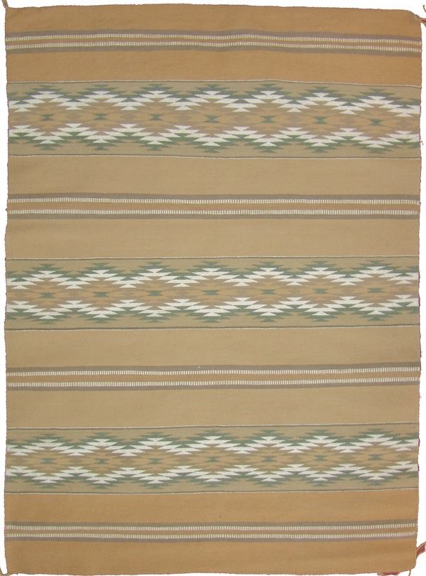 Mid 1900s 62" x 48" Very fine weave Pine Springs/Wide Ruins rug with fine serrated bands and soft earth tones/pastels. Very good condition.