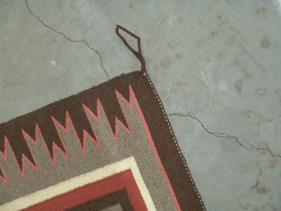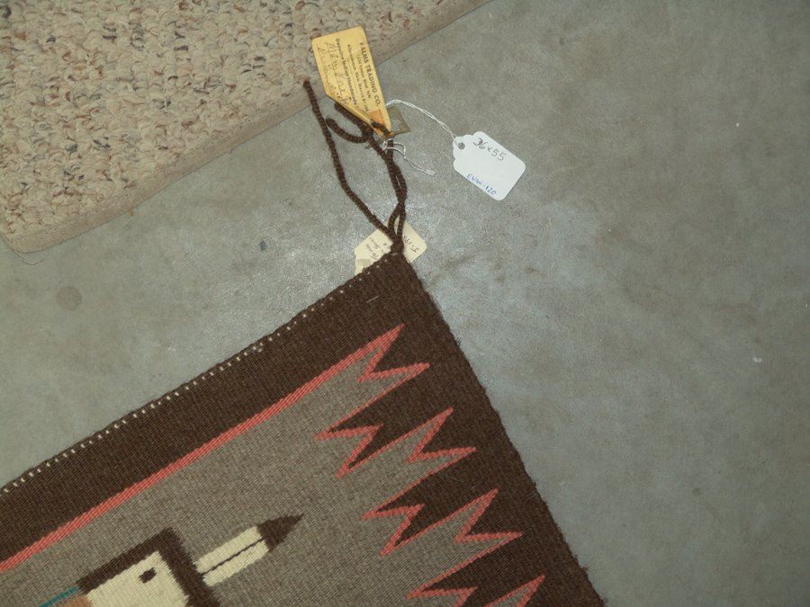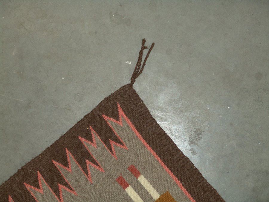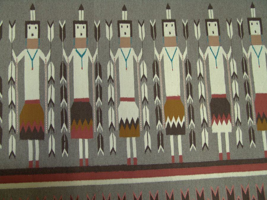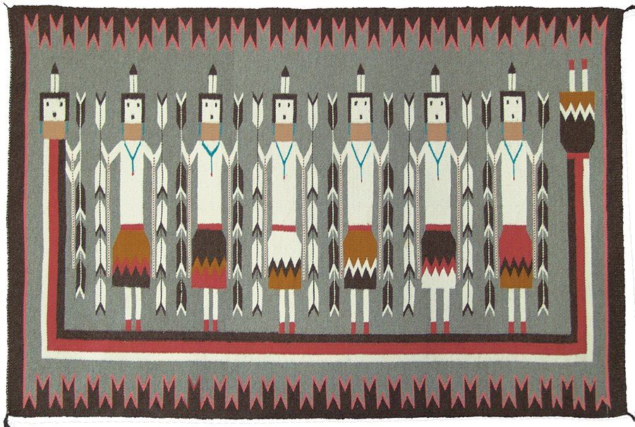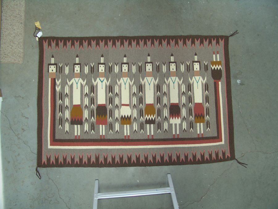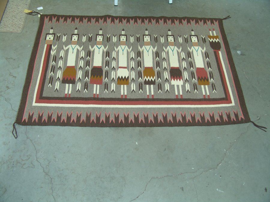 Beautiful fine weave Yei figured rug with outlined sawtooth edges, all done in natural earth tones with a few soft pastel details. Very good condition.,Ca. 1970s,36" x 55"