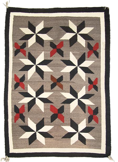 Circa 1960s, Outstanding black, white, and gray Crystal rug covered with Valero stars. Very good condition, nice sturdy weave. 37" x 55"