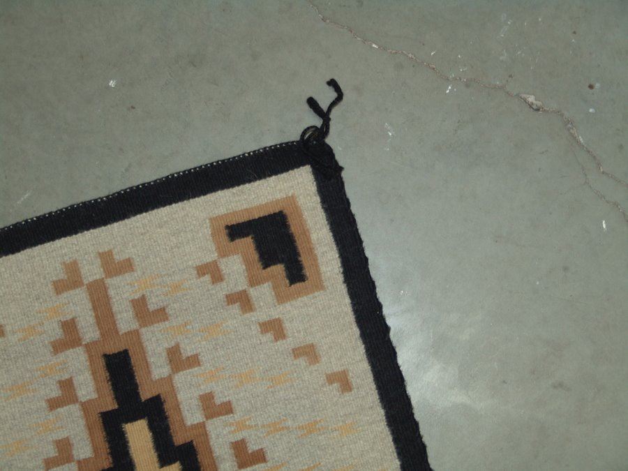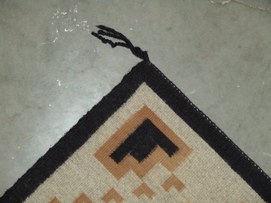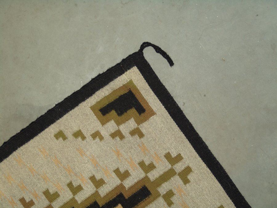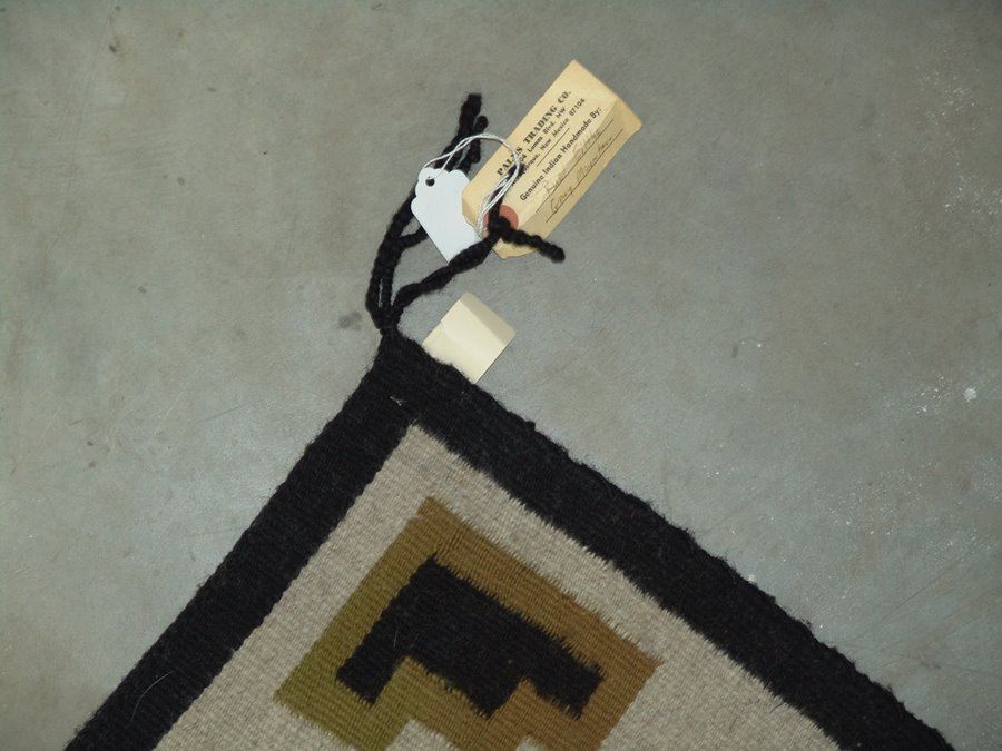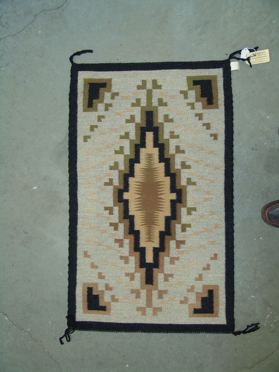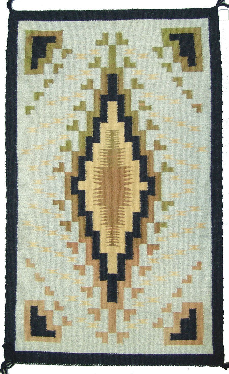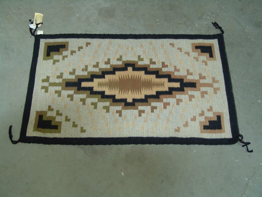 Small fine weave Gray Mountain/Ganado table rug done in natural earth tones with olive green accents. Very good condition but has a small stain.,Ca. 1980s,37" x 23"