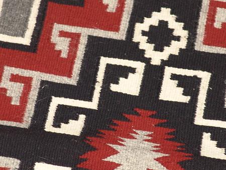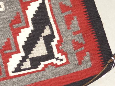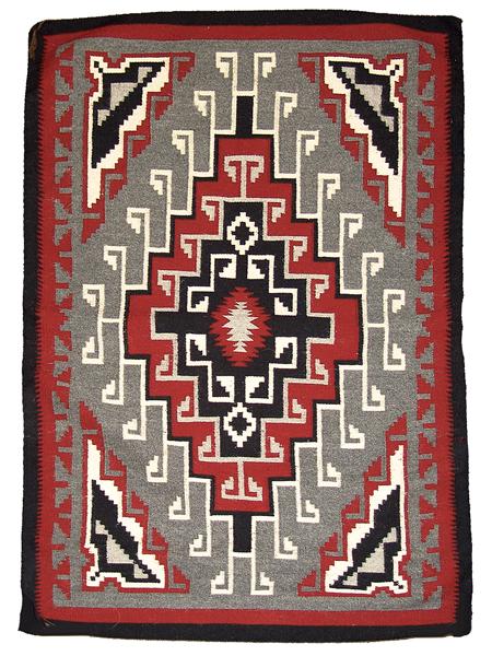 Circa Mid 1900s, Exceptional Klagetoh all home spun natural and fine line wools with hook elements on gray ground with bordered edge. 4'8" x 3'5"